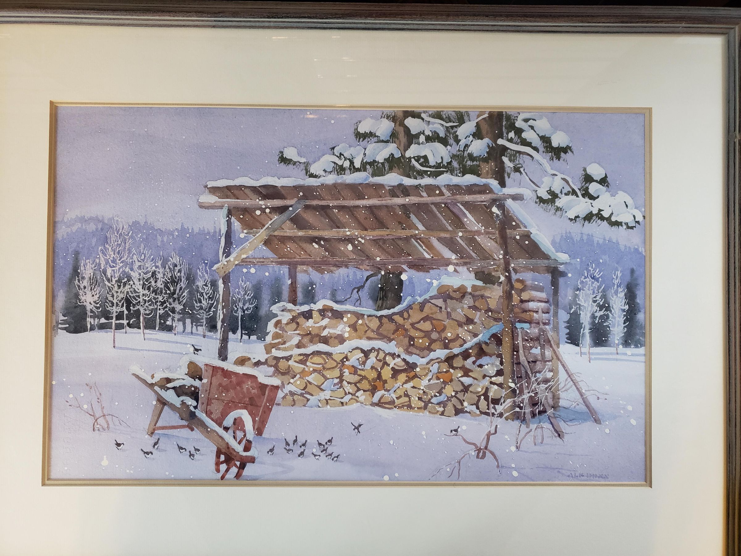 Woodshed watercolor painting by Alf Dunn, framed.