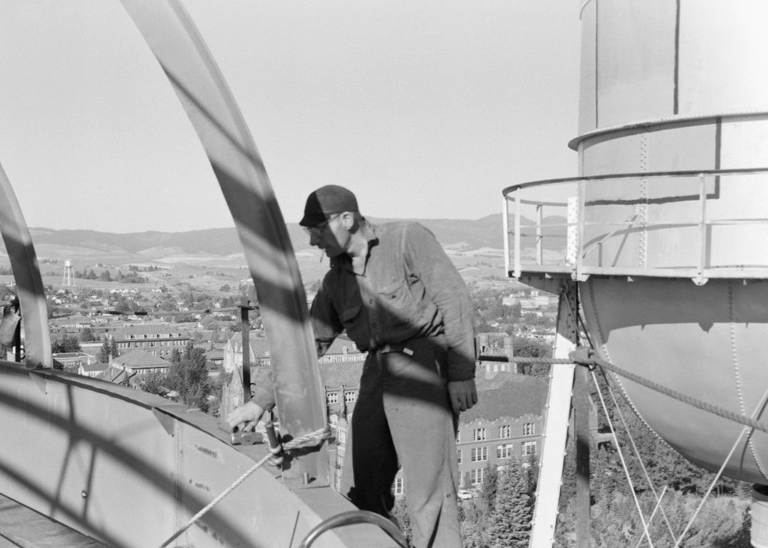 During construction a workman is standing near the top of the University of Idaho "I" water tower adjacent to the old tower. The City of Moscow can be seen in the background.