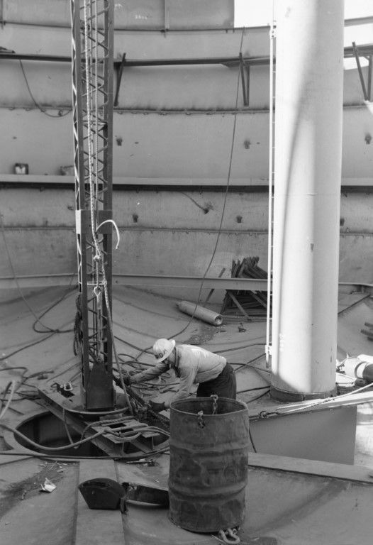 A man is performing work during construction of the new University of Idaho "I" water tower.