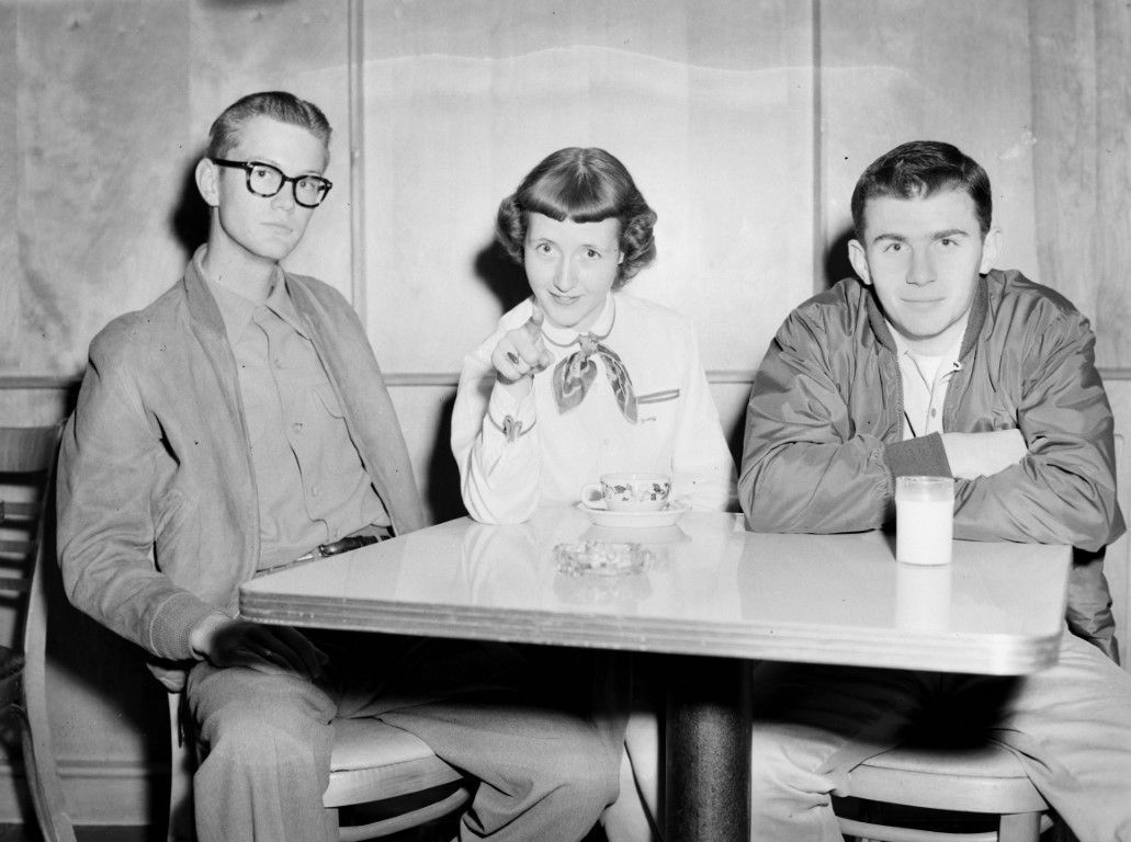 A women sitting between two men at a table pointing her finger towards the camera.