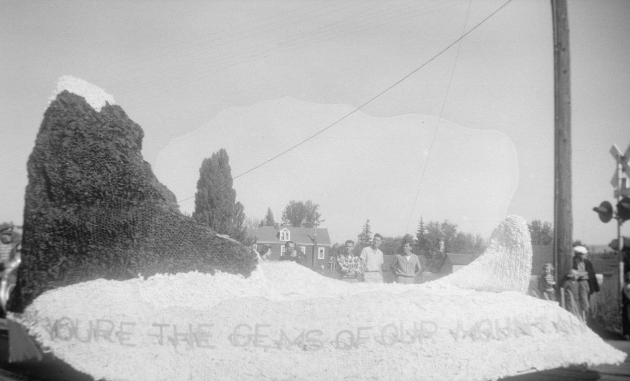 A group of people standing around a parade float that says "You're the gems of our mountain."