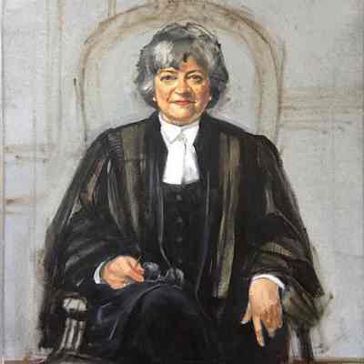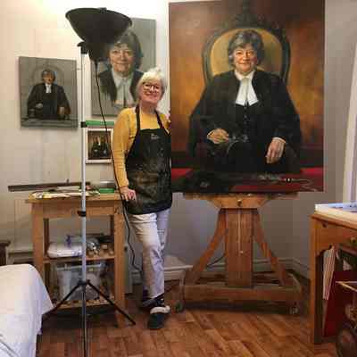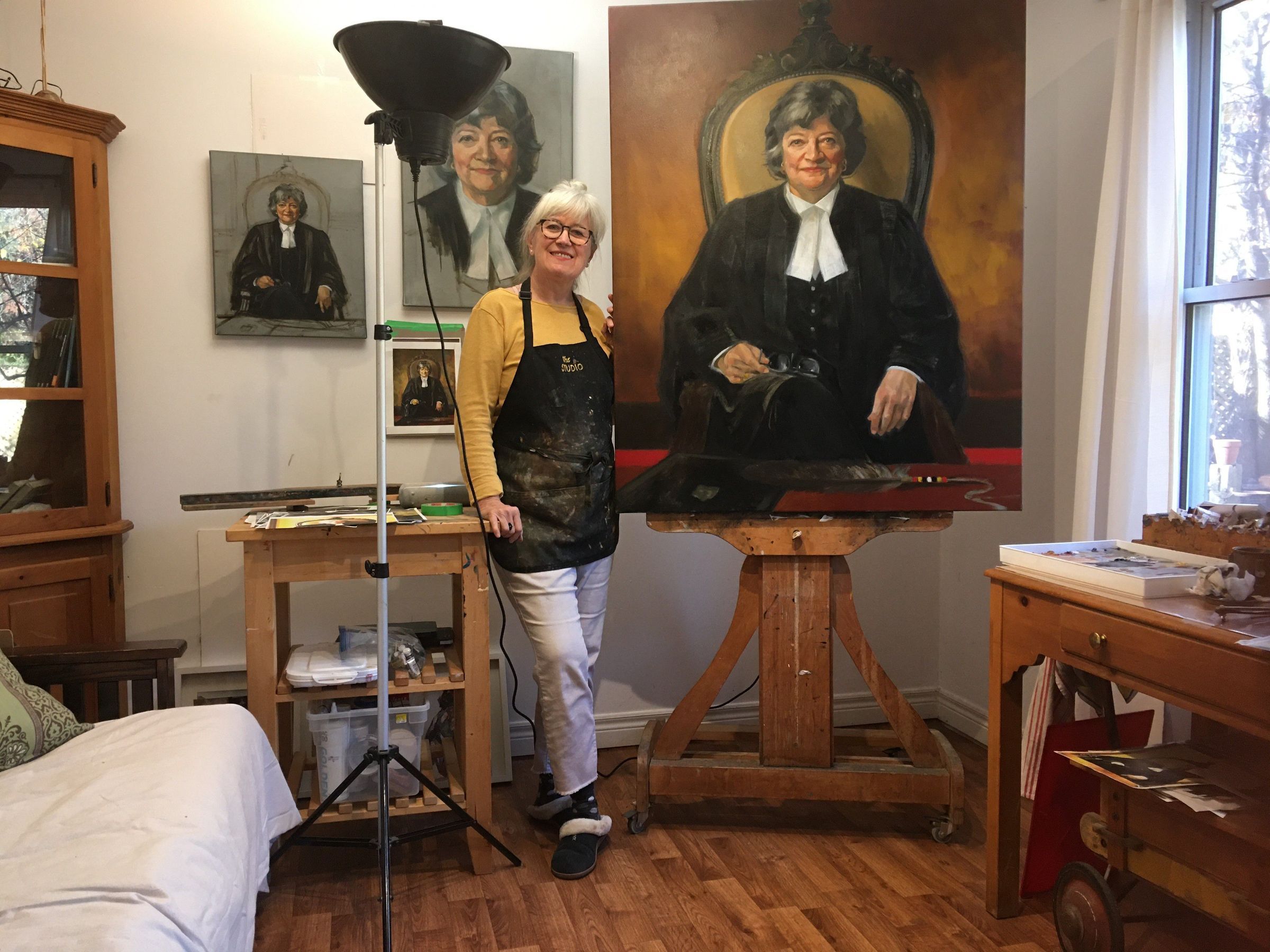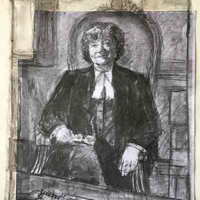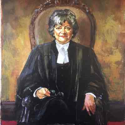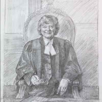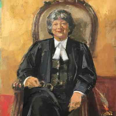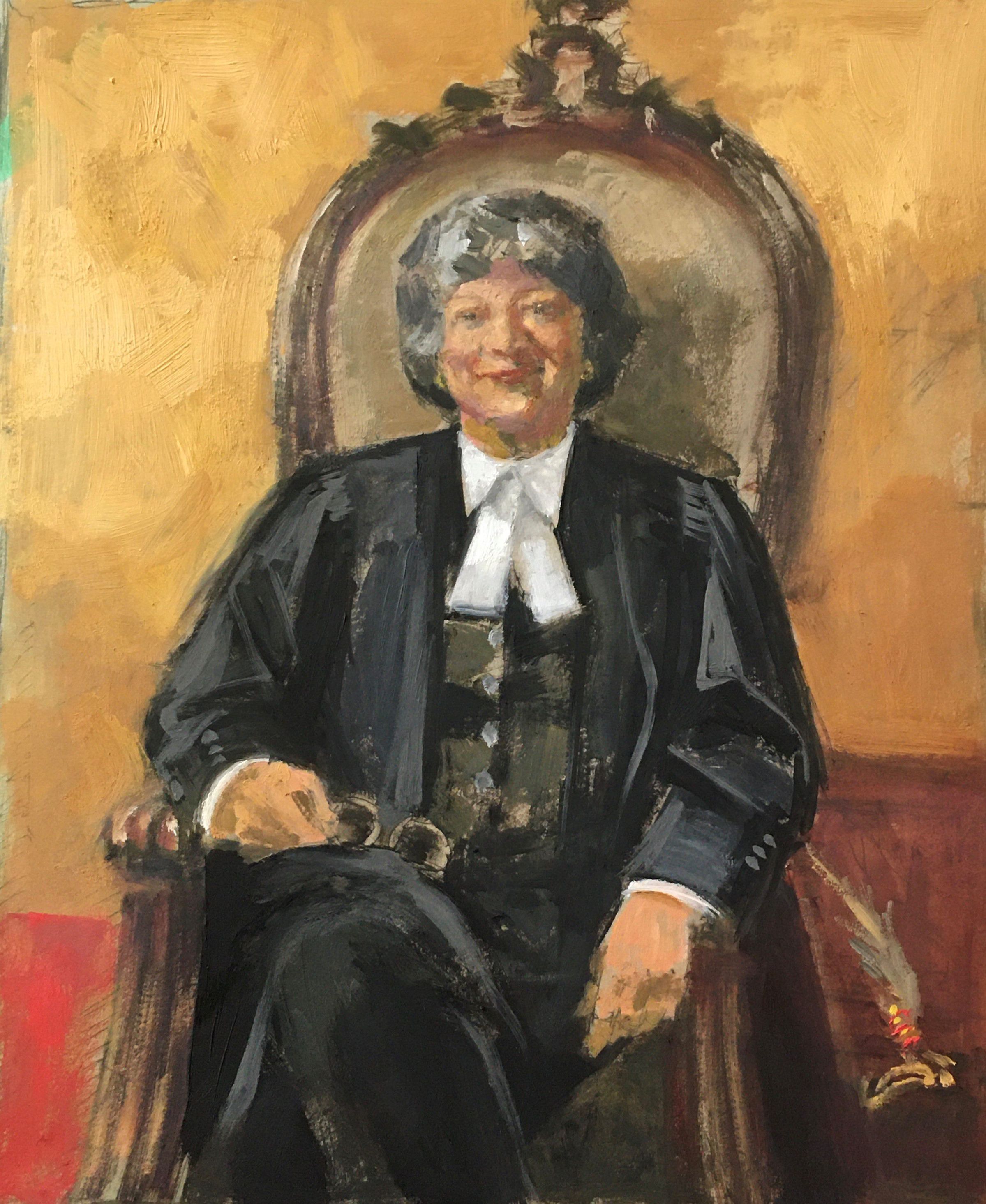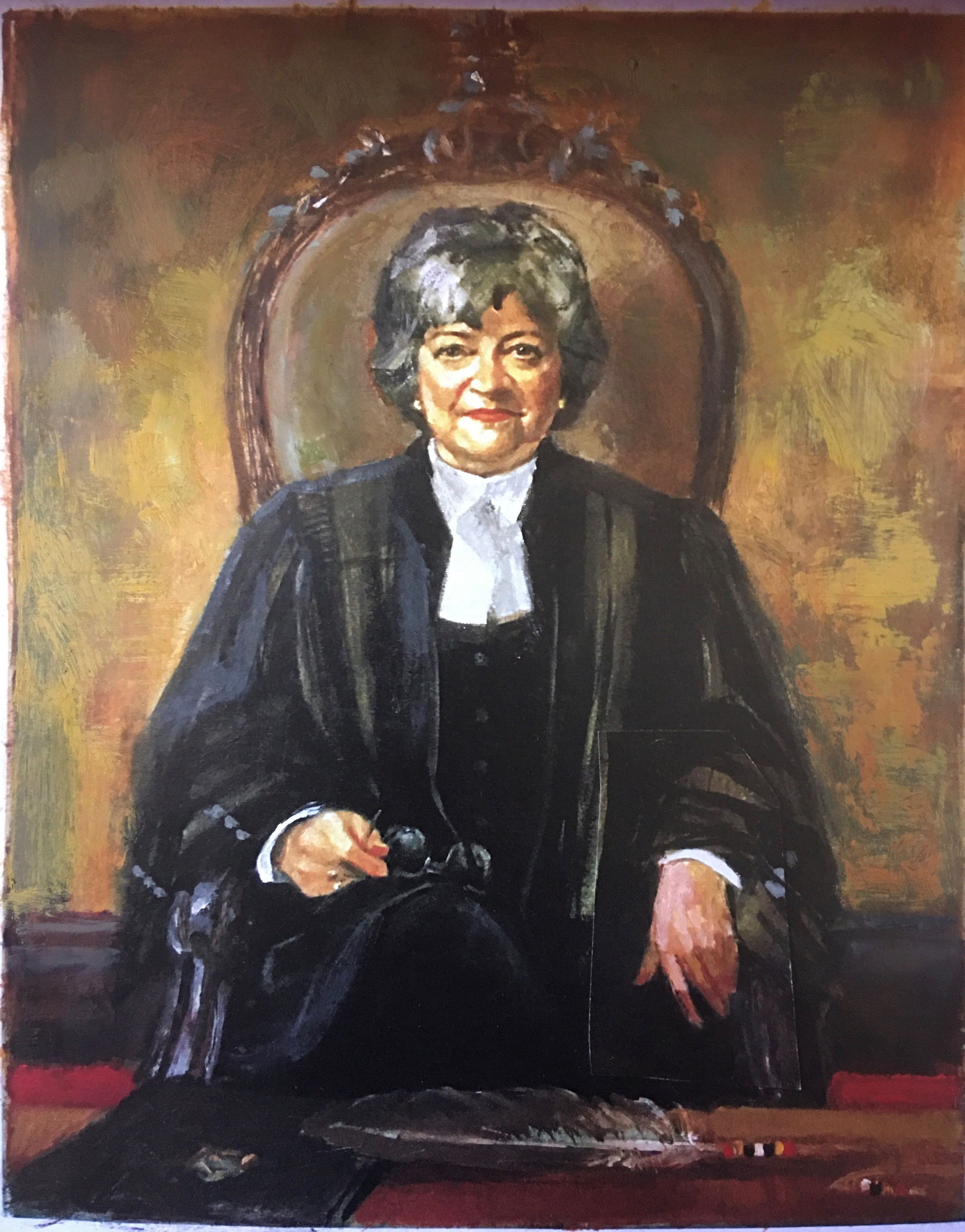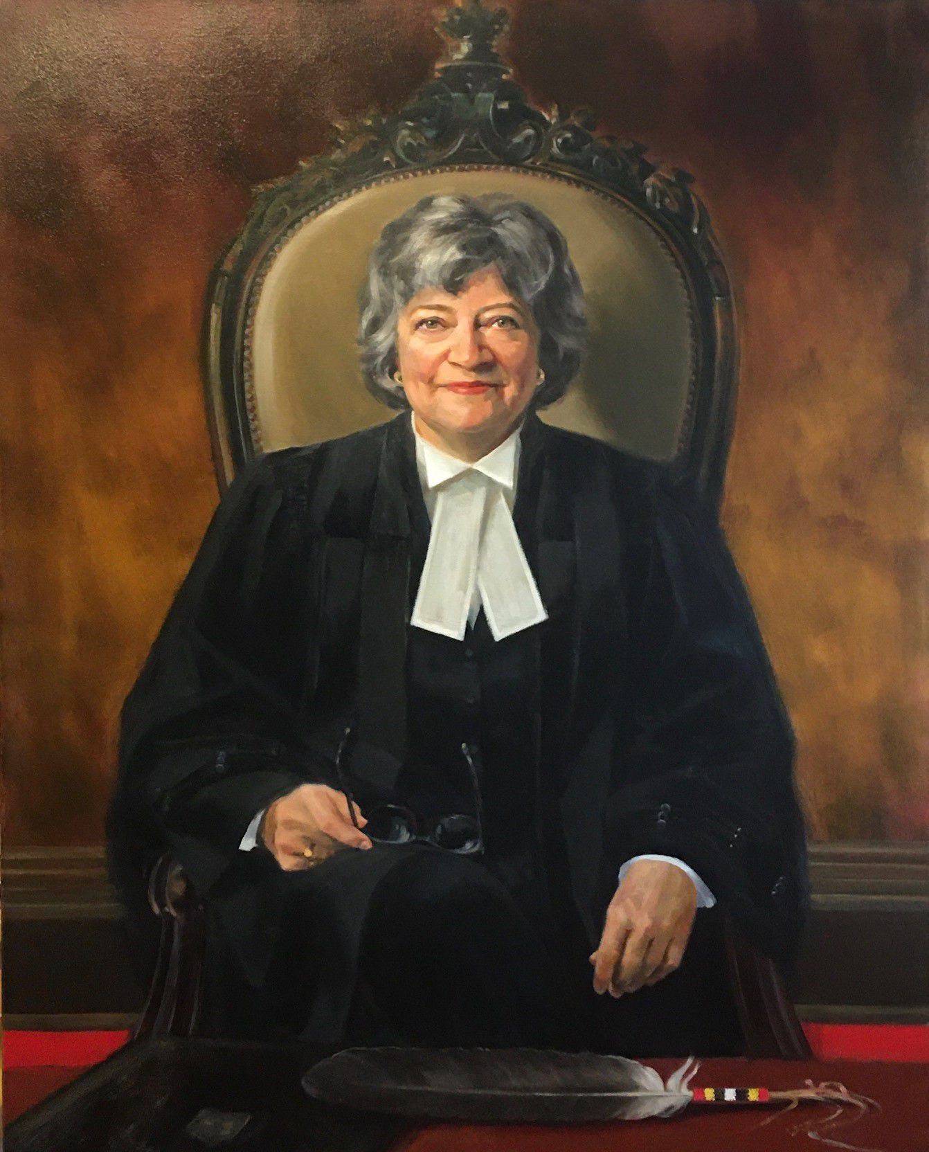 Portrait of former treasurer Janet Minor in the treasurer's chair in Convocation Room. The feather in front of her is the eagle feather that is placed at the treasurer's place during Convocation. The binder under the feather is one of the blotters that were long placed at each benchers' place on the Convocation table.