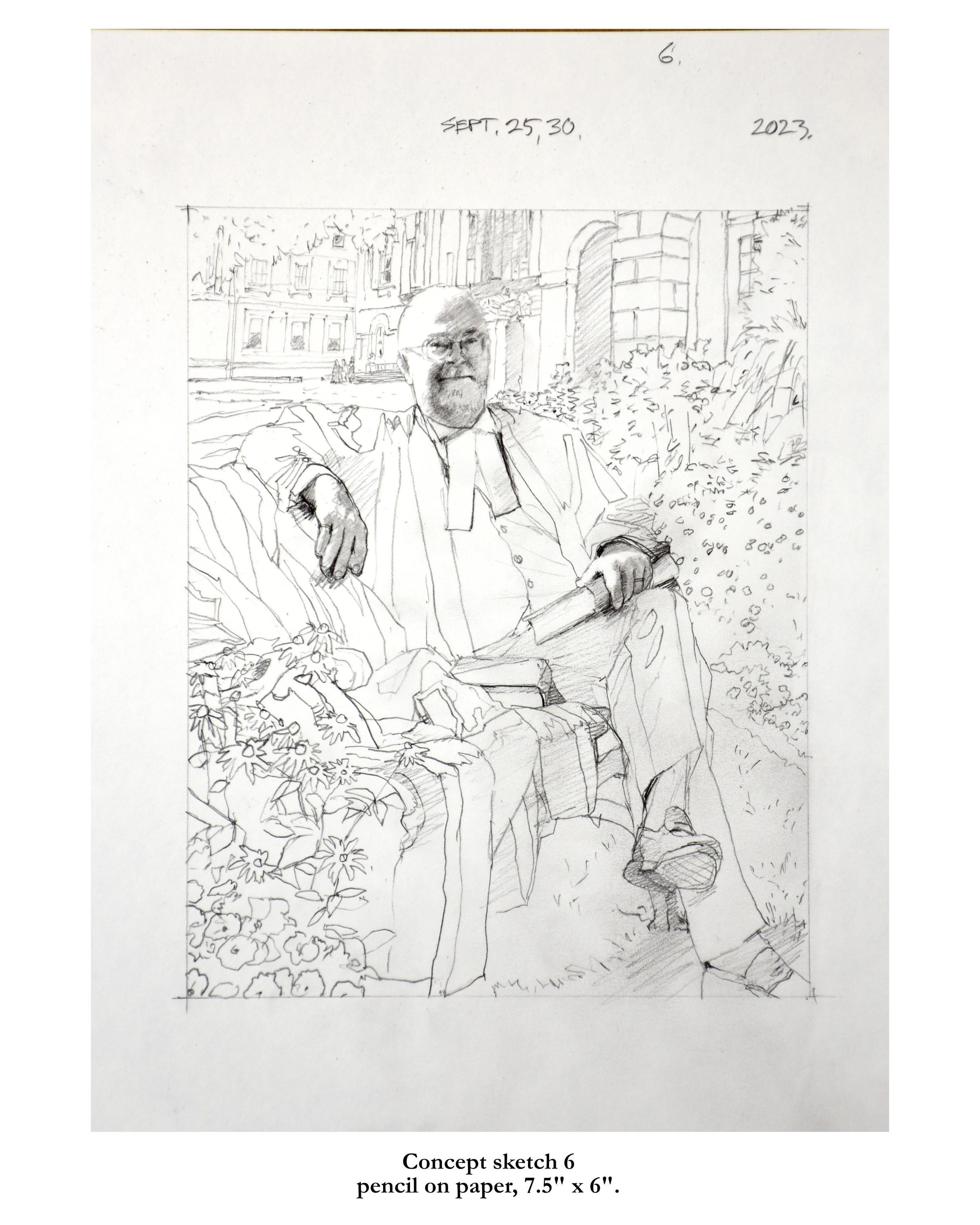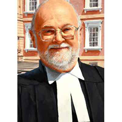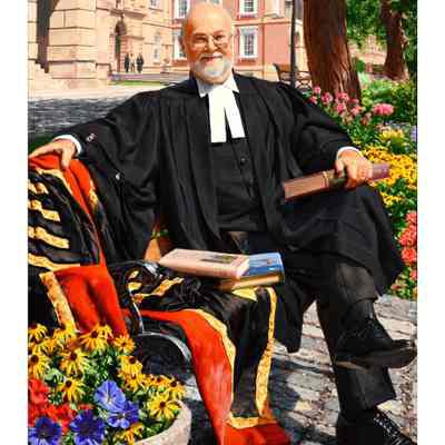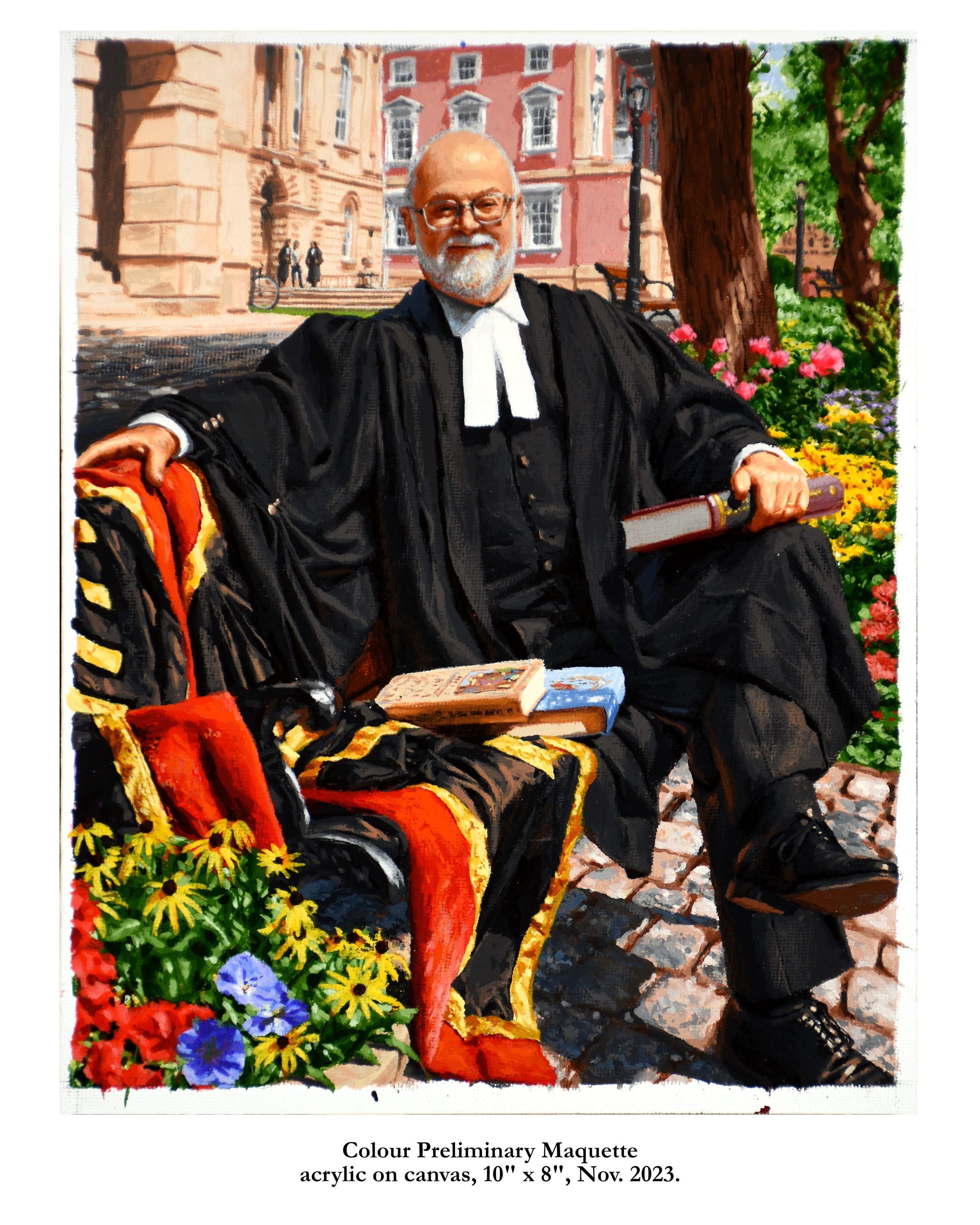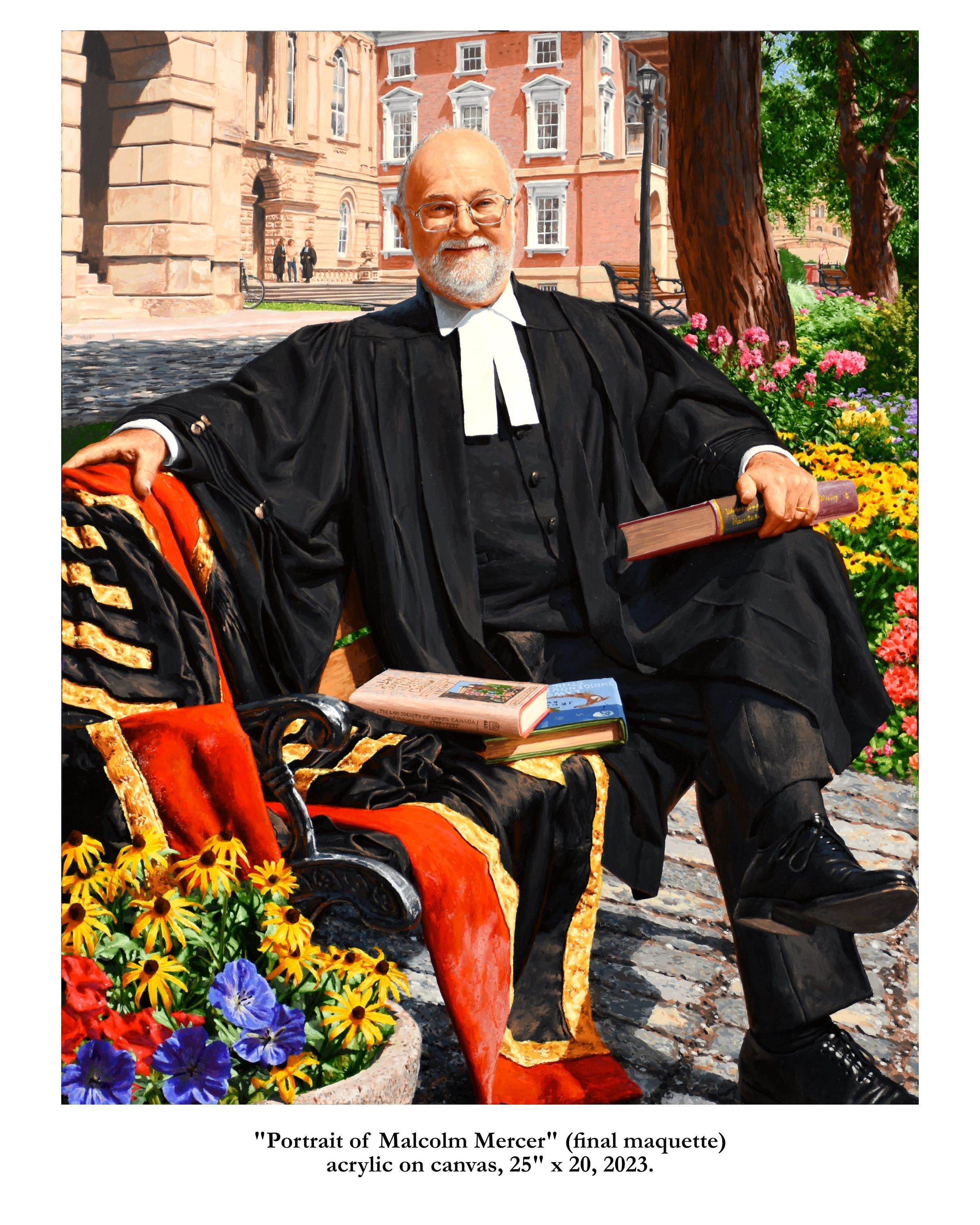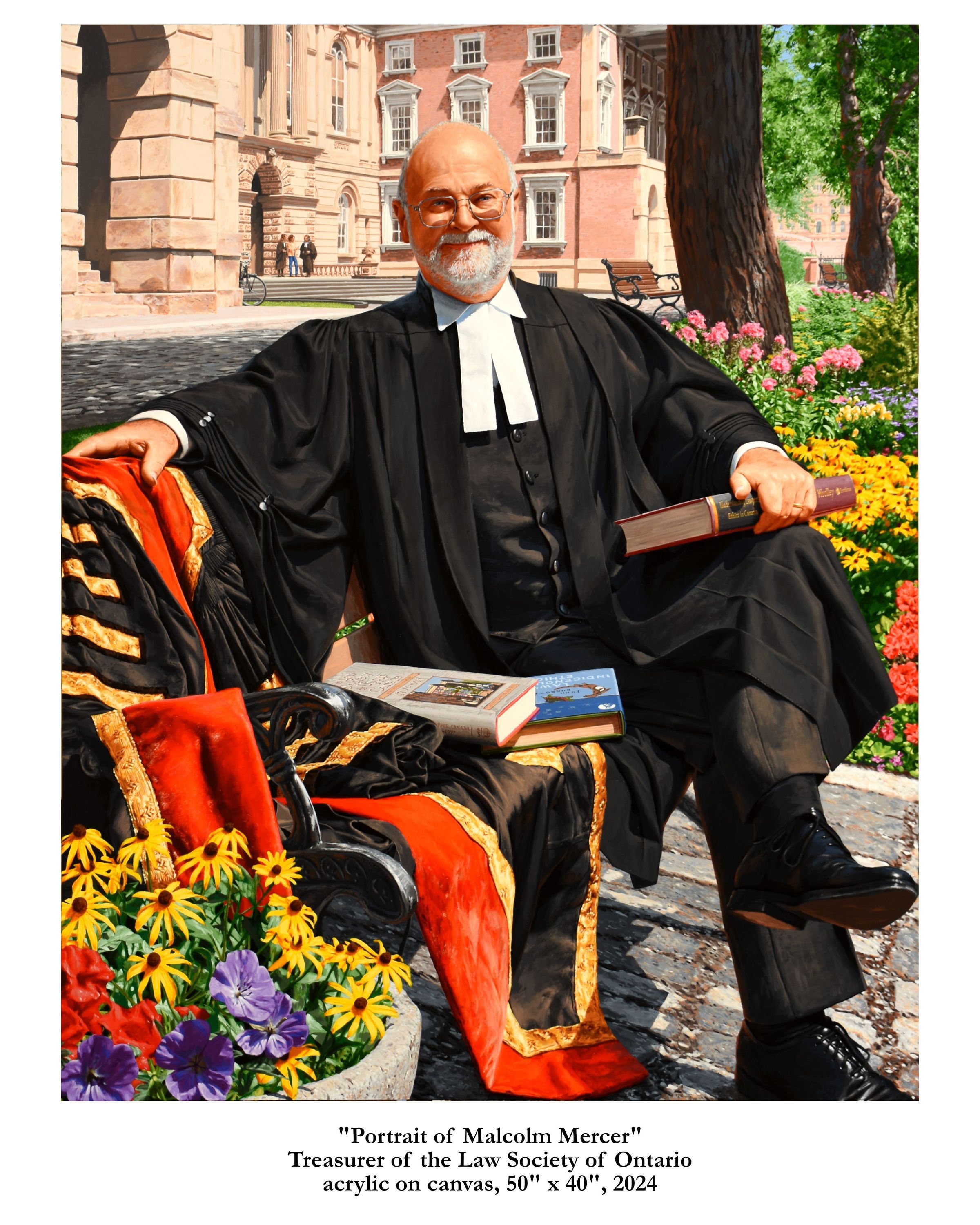 Portrait of former treasurer Malcolm Mercer sitting on a bench in front of Osgoode Hall. The three people in the background are his two daughters and his wife. The bicycle is his. The books were chosen by Mercer. The gown is the treasurer's gown.Type of Painting