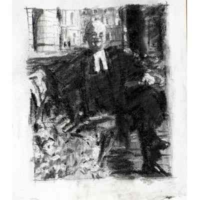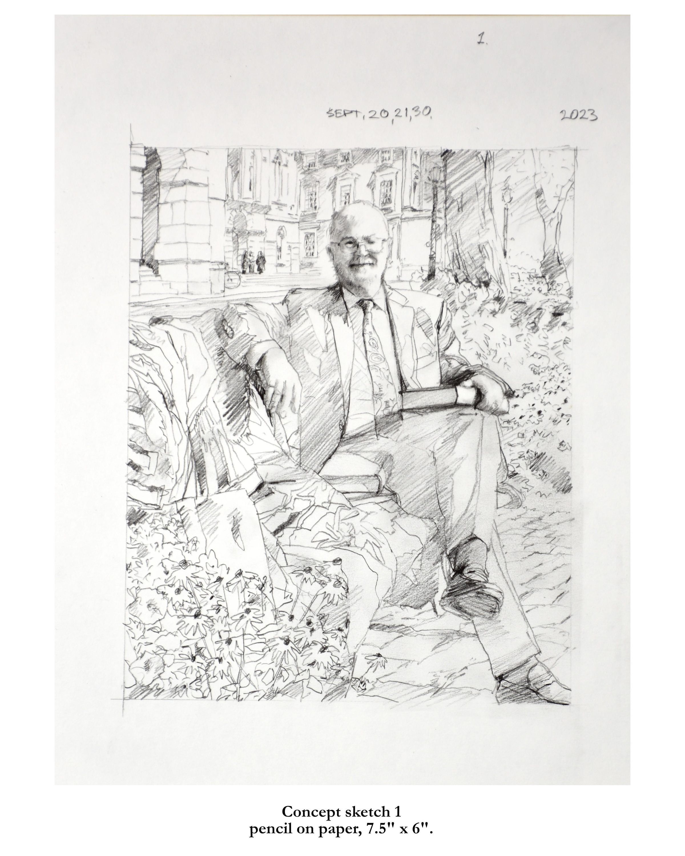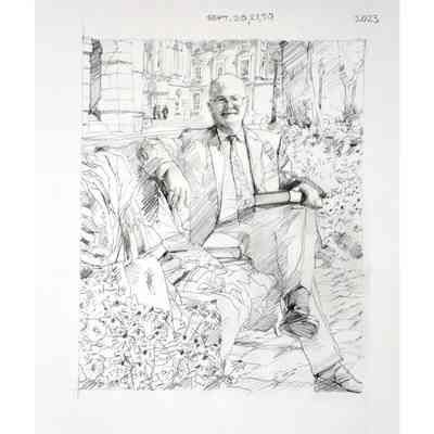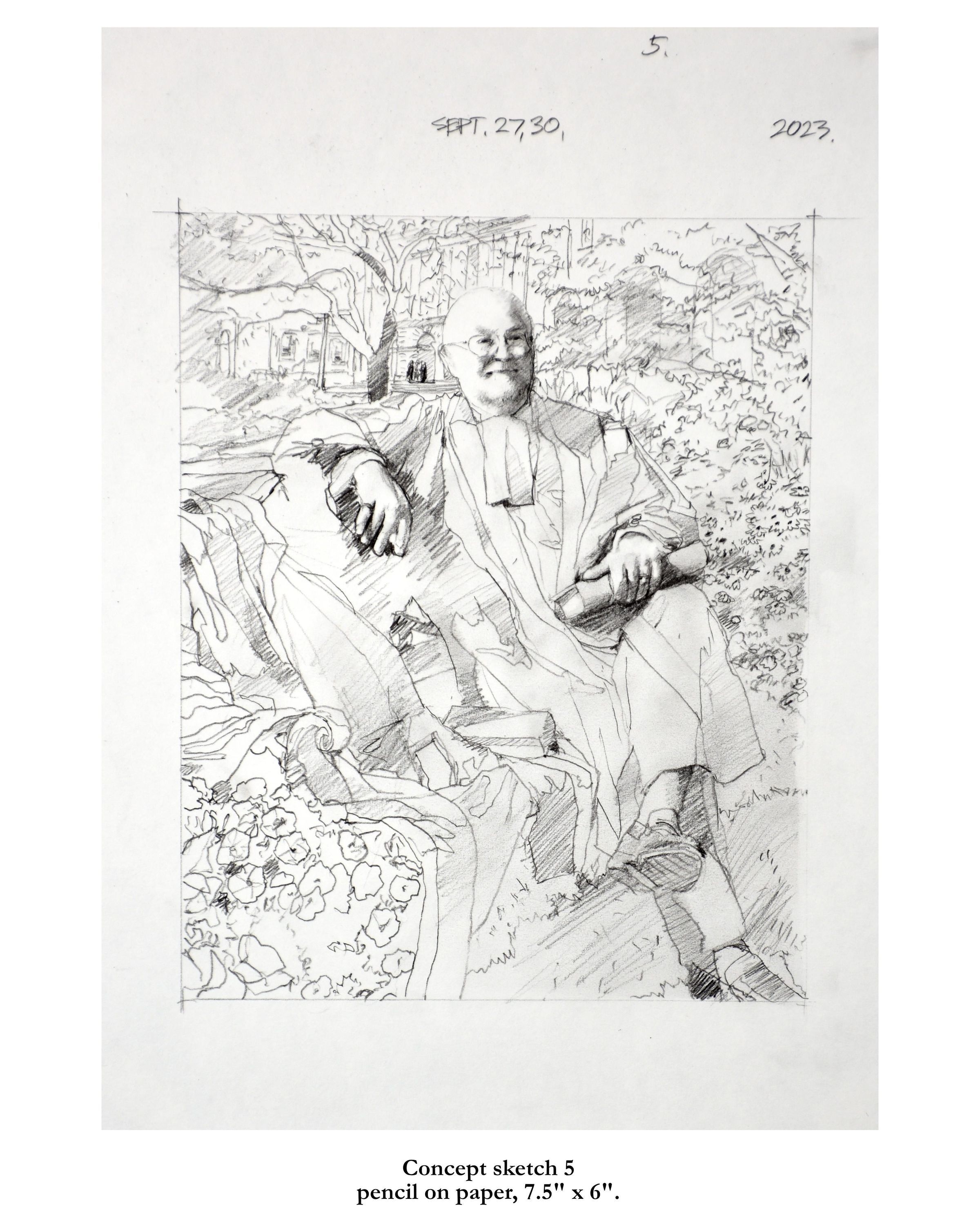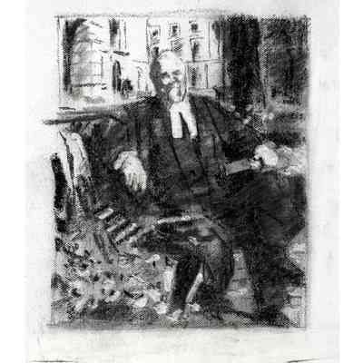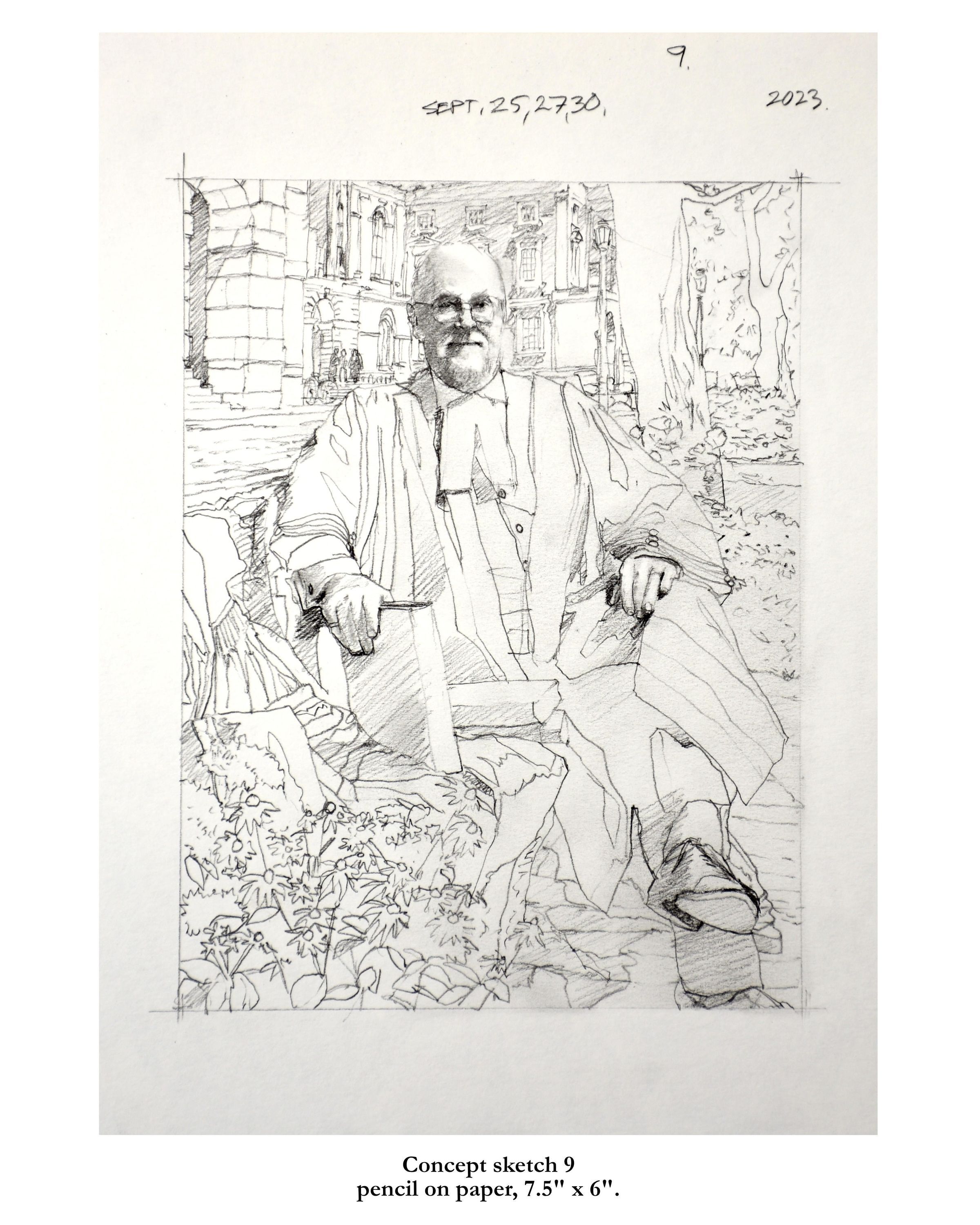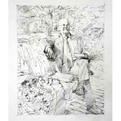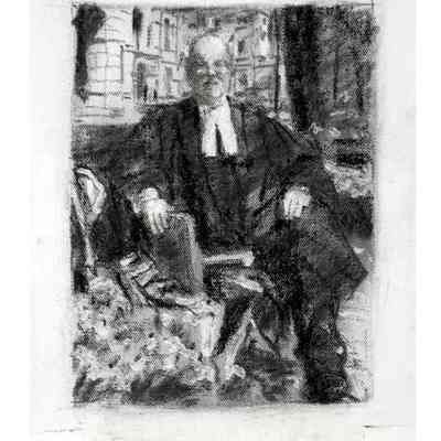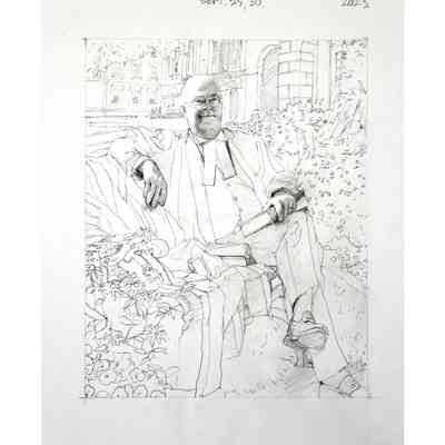 Portrait of former treasurer Malcolm Mercer sitting on a bench in front of Osgoode Hall. The three people in the background are his two daughters and his wife. The bicycle is his. The books were chosen by Mercer. The gown is the treasurer's gown.Type of Painting