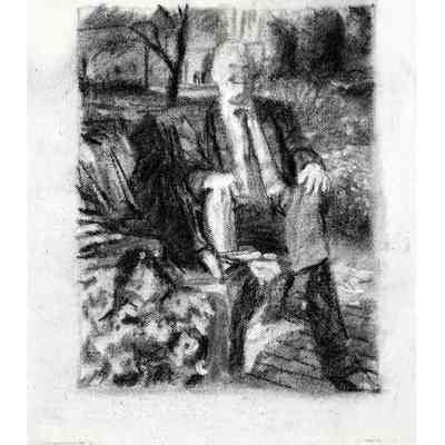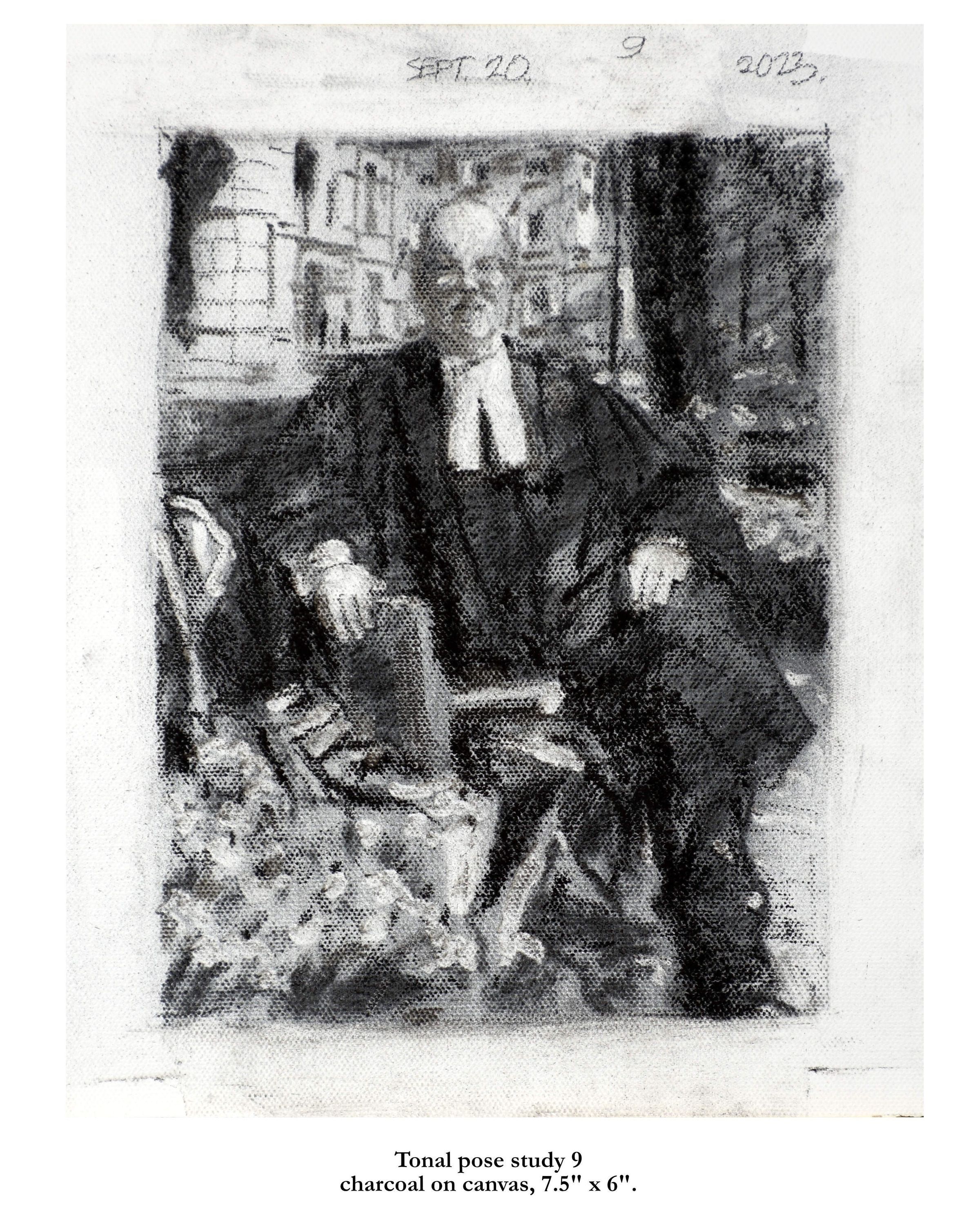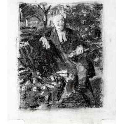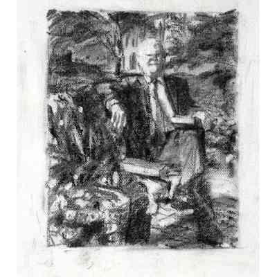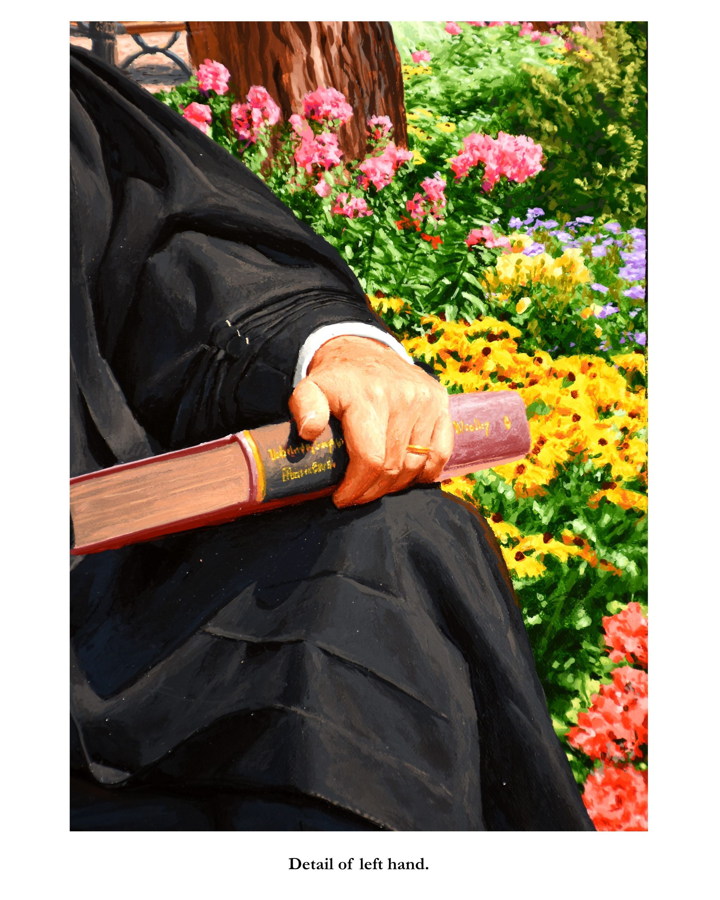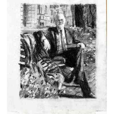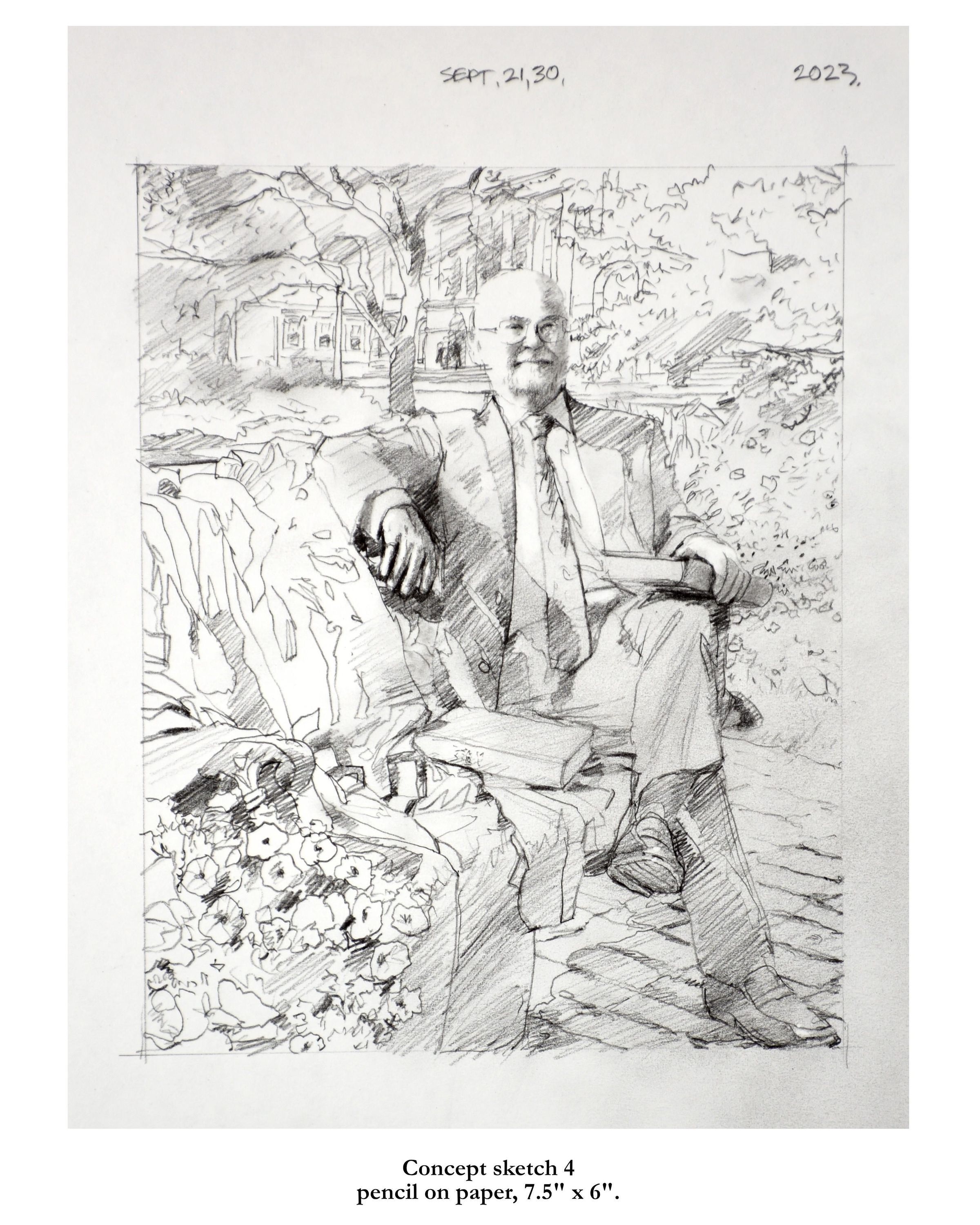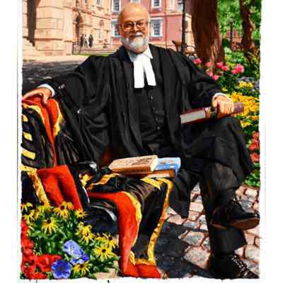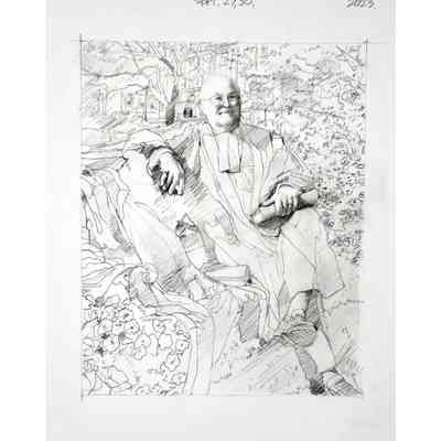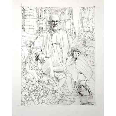 Portrait of former treasurer Malcolm Mercer sitting on a bench in front of Osgoode Hall. The three people in the background are his two daughters and his wife. The bicycle is his. The books were chosen by Mercer. The gown is the treasurer's gown.Type of Painting