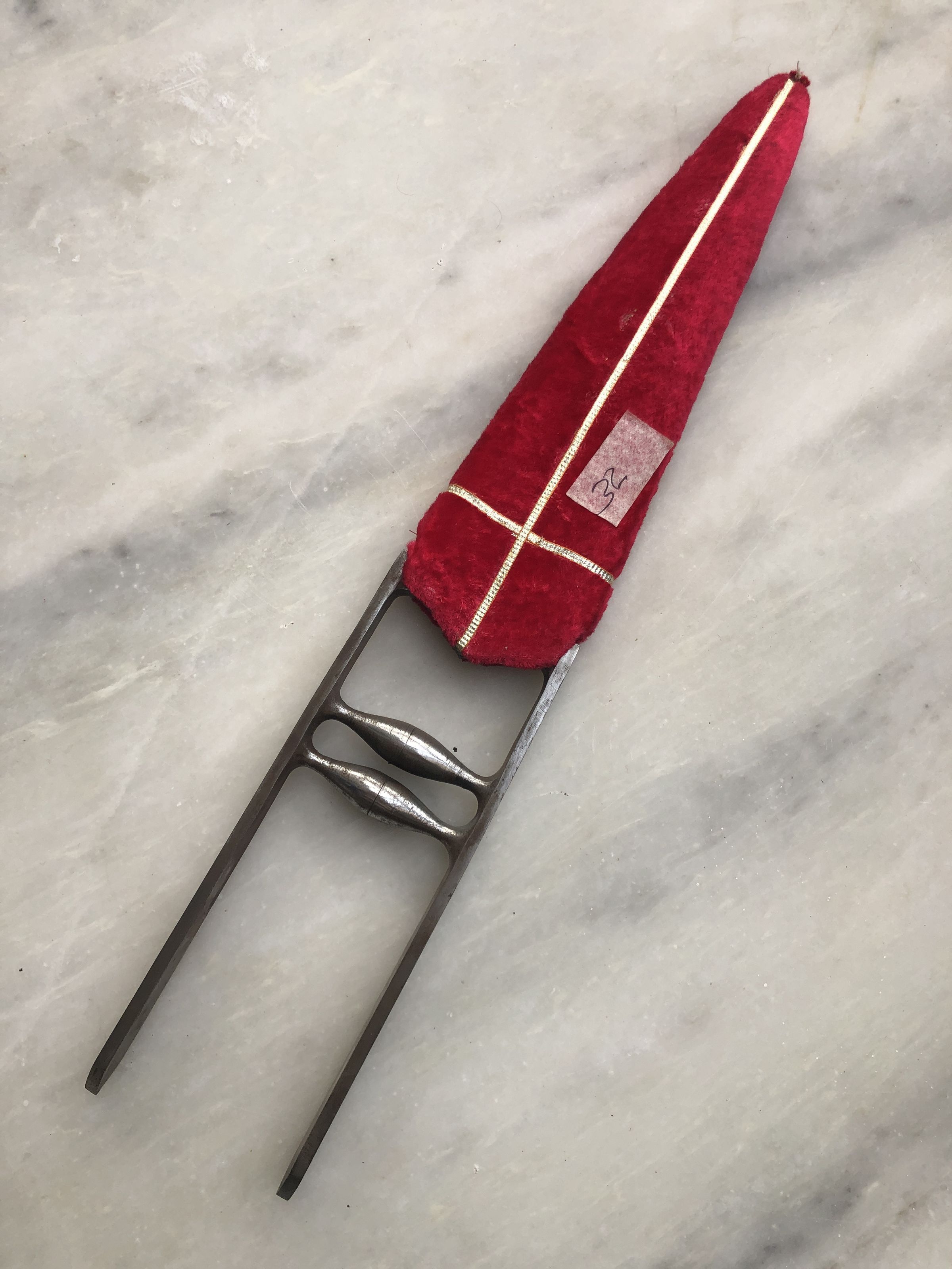 The image presents a ceremonial dagger alongside its red velvet sheath, both lying on a marble surface. The dagger features an elaborate handle with intricate silver filigree work and a pattern that suggests gothic or medieval influences. It has a metallic blade that tapers to a sharp point, and the grip design indicates that it might be a piece rooted in historical or ceremonial significance. The sheath is adorned with a simple, elegant cross pattern stitched in golden thread, adding a regal touch to the ensemble. A small, white paper tag marked with the number "32" in red ink is attached to the sheath, hinting that this item could be part of a collection or exhibit. From its remarkable craftsmanship, this dagger likely serves more as a decorative or collectible relic rather than a utilitarian tool, embodying artistic as well as historical values.