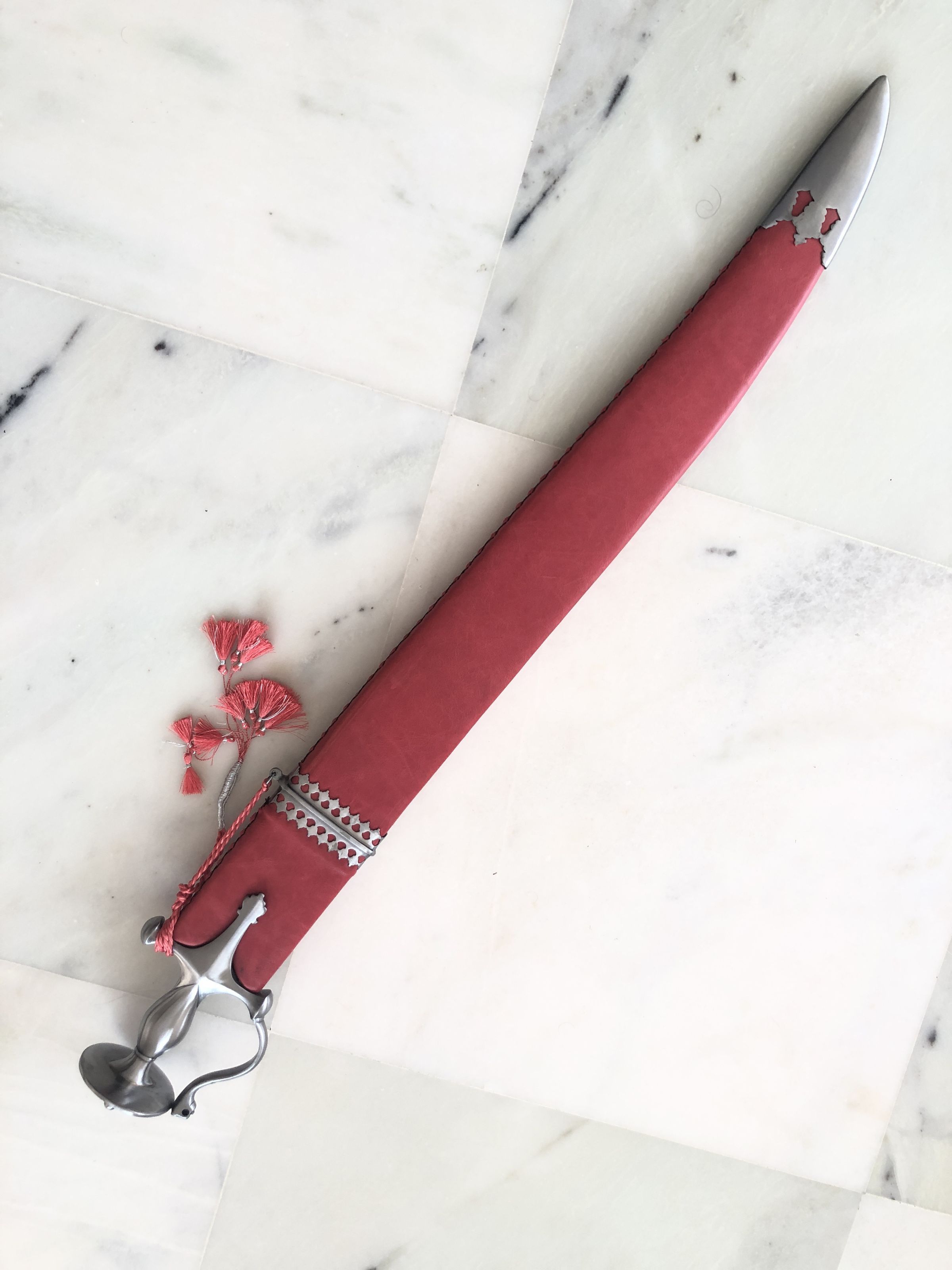 The image depicts a long, slender ceremonial sword lying on a marble floor. The sword's polished blade gleams with a mirrored finish, reflecting light and showing no signs of tarnish. It features an ornate handguard that is artistically crafted in a silver tone, with curves and openings that suggest a design both protective and decorative. This handguard connects to an elegant, possibly ergonomic handle, also metallic, hinting at a solid grip. Accompanying the sword is a scabbard enveloped in rich red fabric that appears slightly worn at its opening, giving a hint of frequent use or historical value. A decorative tassel with a braided rope accentuates the scabbard, adding a touch of ceremonial grandeur. This setup connotes a mix of functionality and ceremonial significance, possibly denoting the sword's use in historical or ritual contexts, suggesting not just a weapon, but a symbol of power and status. The marble backdrop provides a clean, stark contrast to the vivid red and