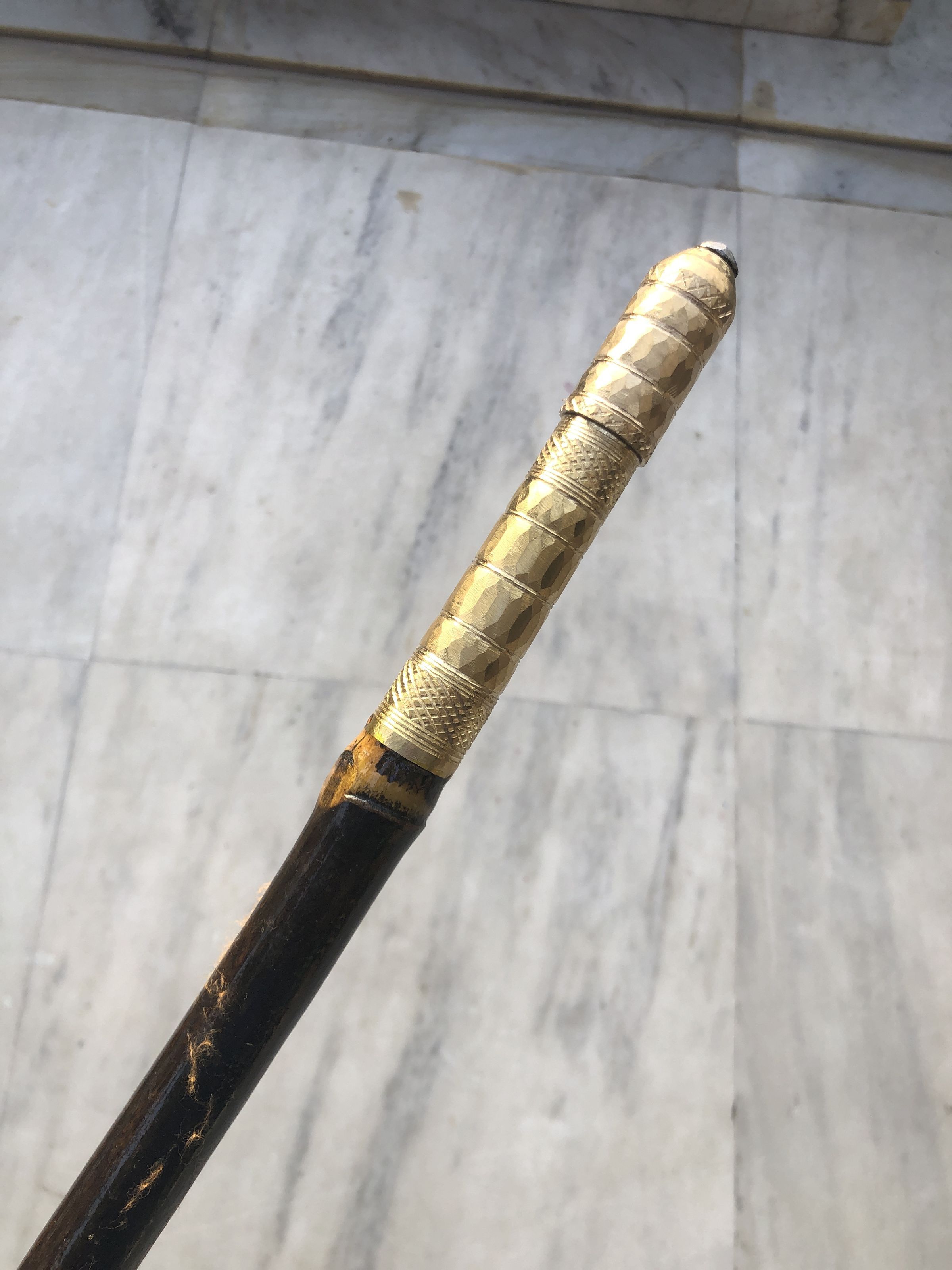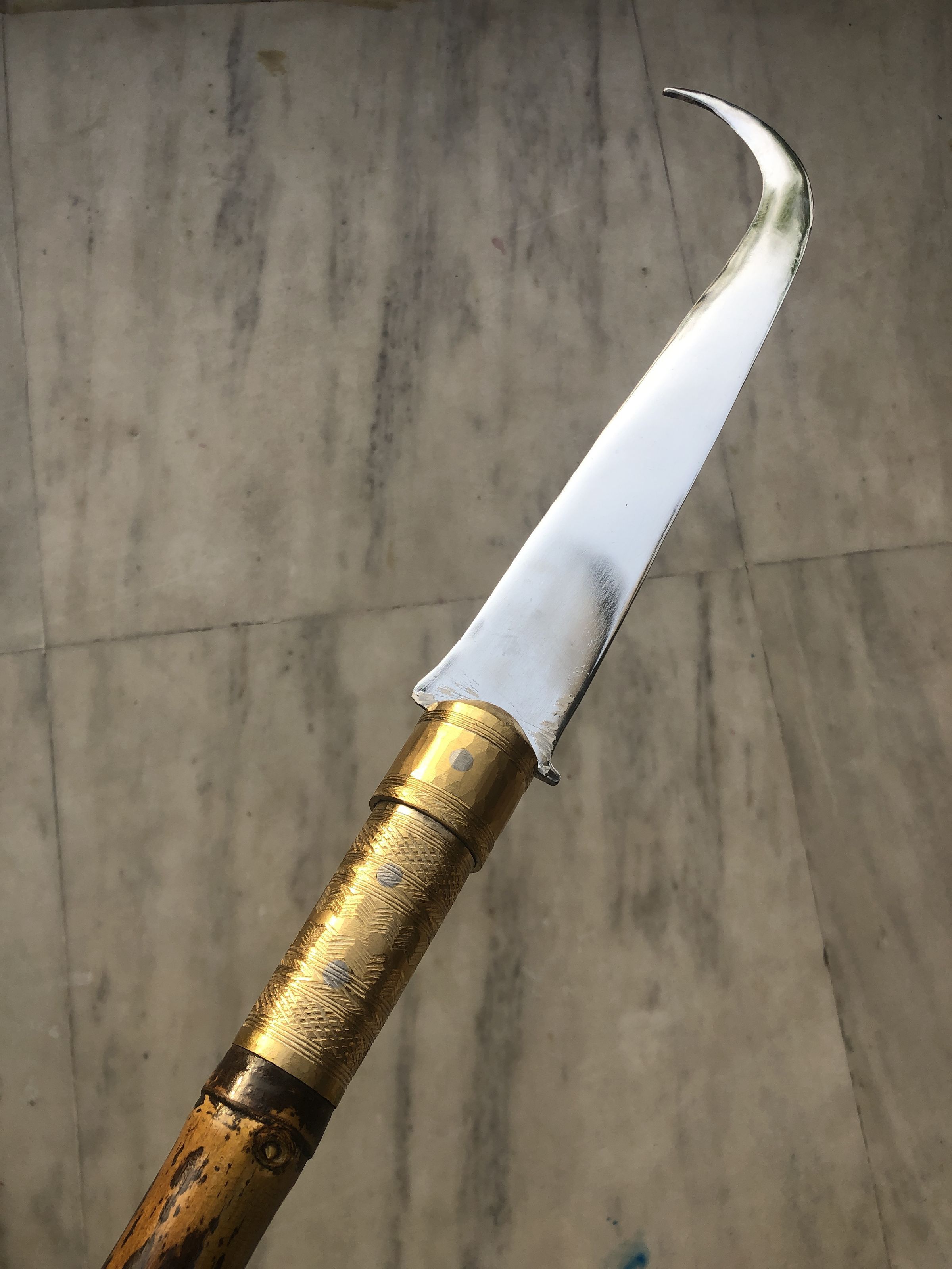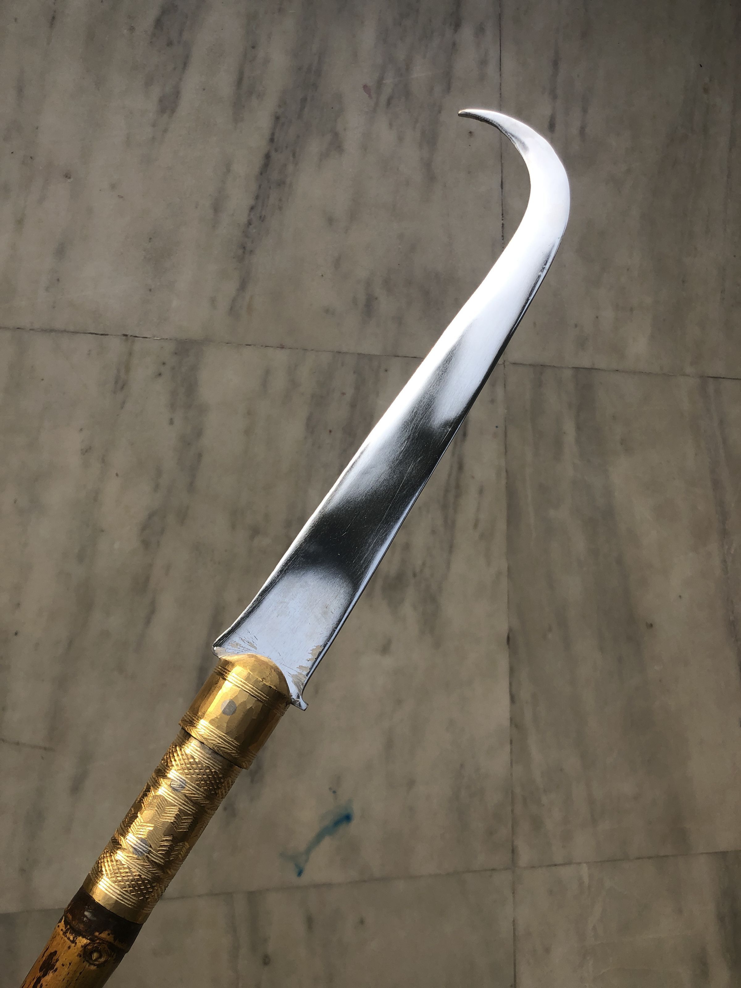 The image captures a traditional weapon with a striking curvaceous blade, set against a cool grey marble floor, hinting at both elegance and vintage aesthetics. At first glance, the prominent feature of the weapon is the cleanly polished, sharply curved blade that exudes a menacing yet controlled vibe, likely designed for fluid slicing motions given its pronounced arc. Moving towards the hilt, ornate details come into play, as segments of golden embellishments break the continuity of the otherwise dark lacquered handle. These gold areas add a regal touch reminiscent of historical weaponry, possibly indicating the weapon’s importance or ceremonial use. The laydown placement of the weapon on the marble brings an inherent contrast between the crafted metal and organic stone, pairing man-made artistry with the quiet background of nature’s own canvas. Each aspect of the weapon, from its tapered, sharp point to its luxuriously patterned handle, stresses a blend of functional design and aesthetic celebration—a piece that’s much more than mere armament