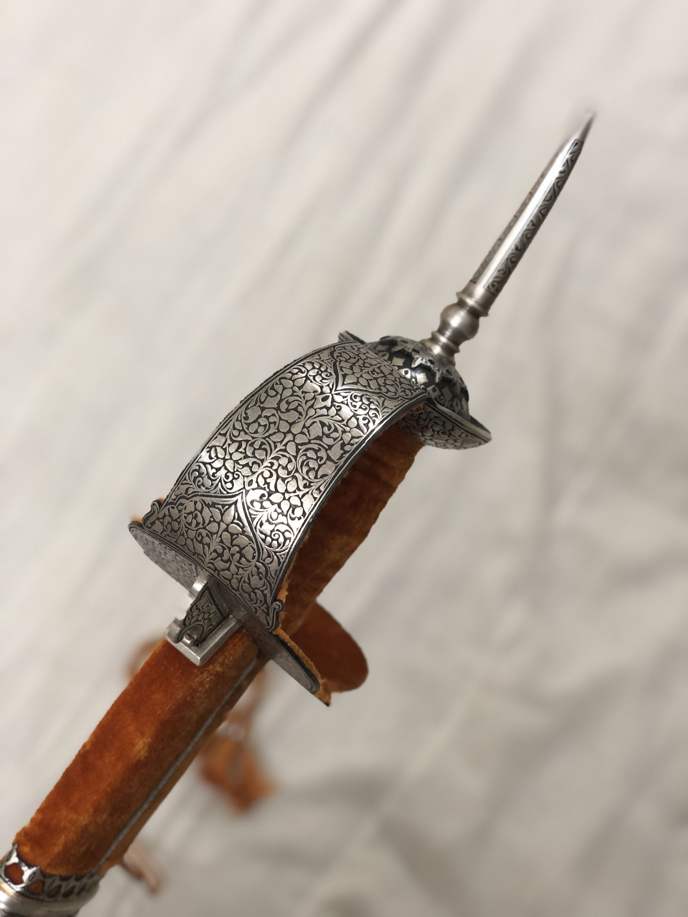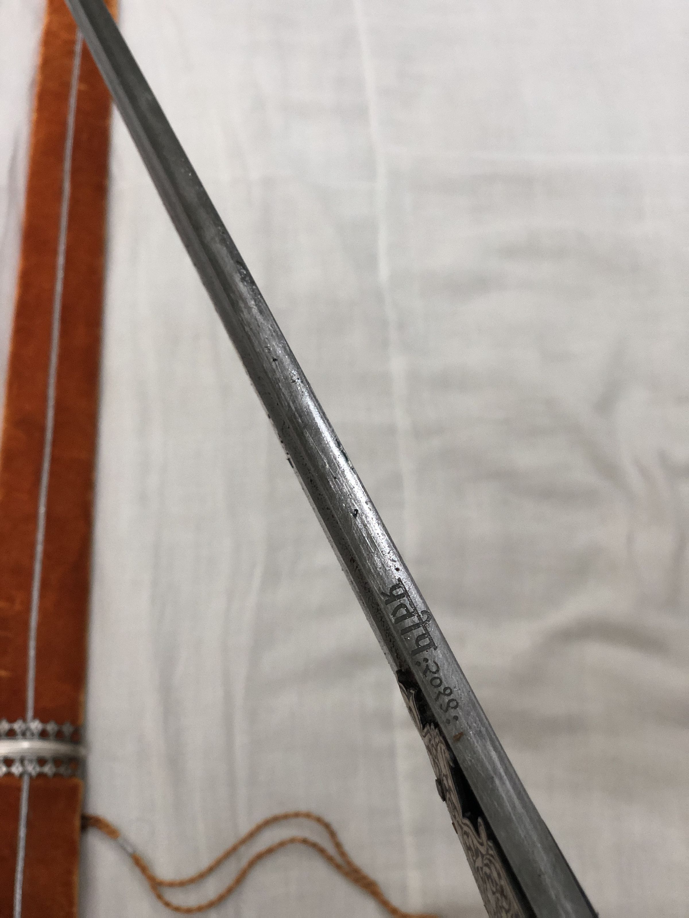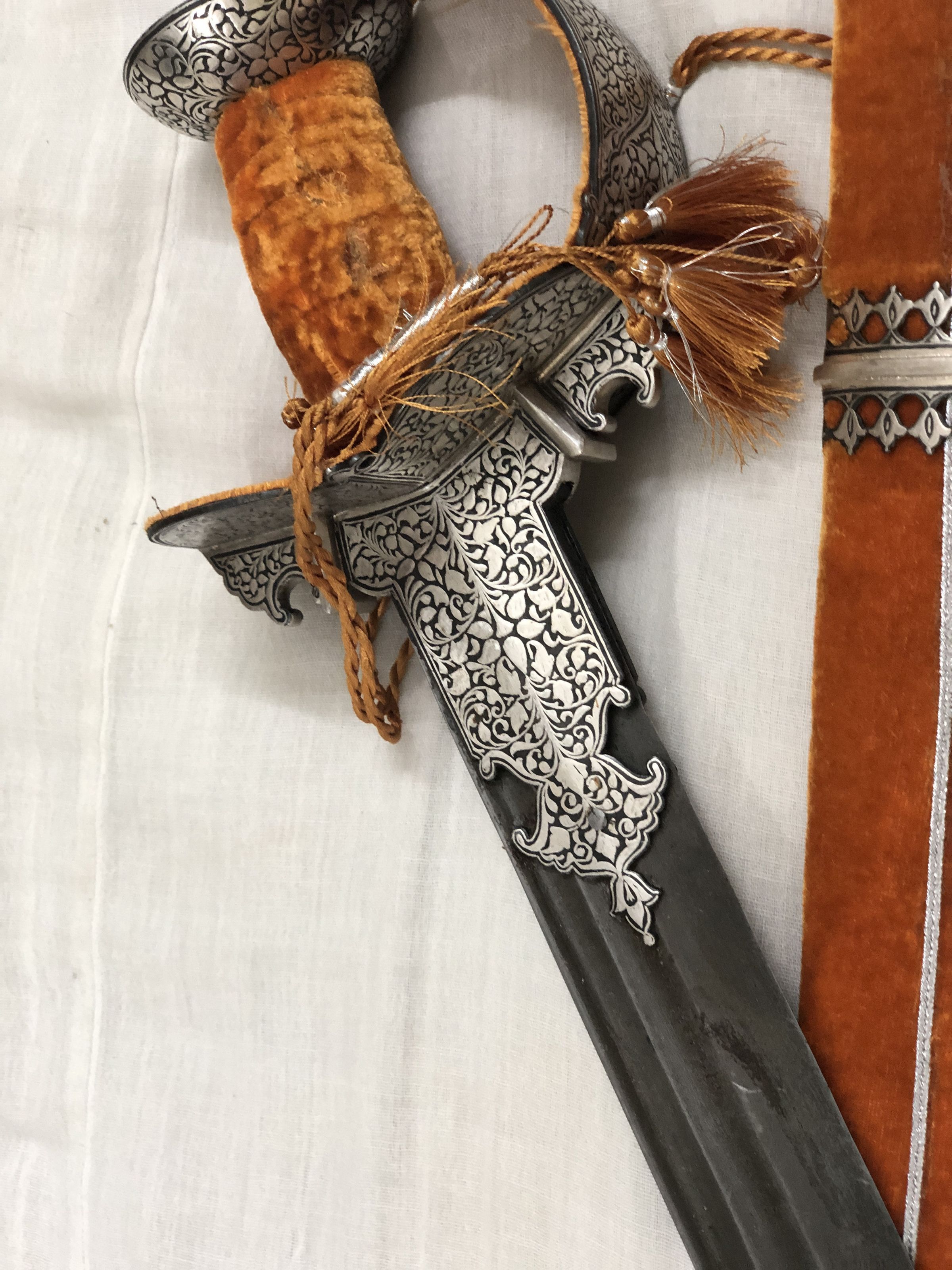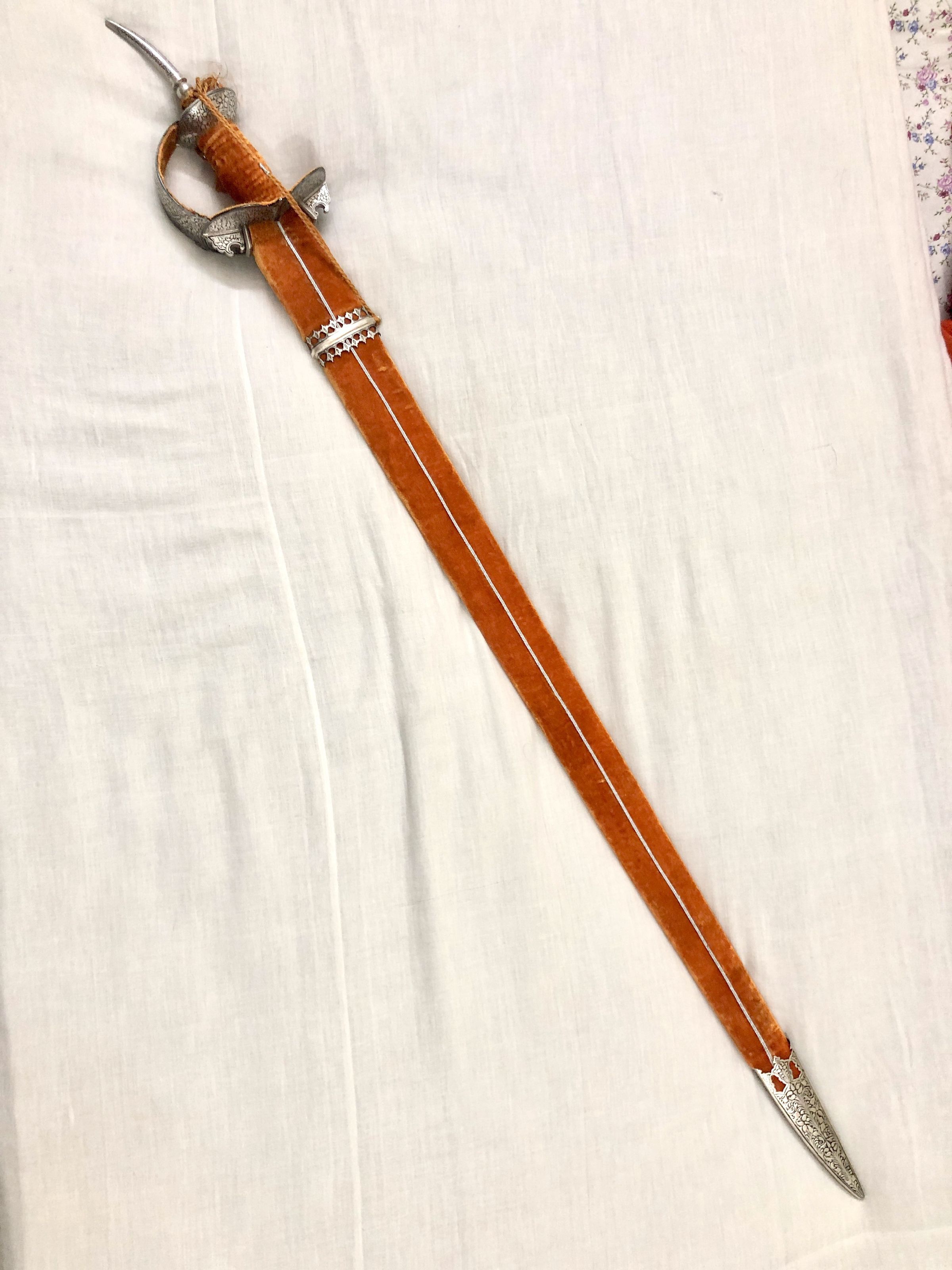 This Firangi Blade is a highly ornate piece, forged as a fighting weapon. Double fullers running through the compete length of the blade and short chisled tip makes this cut and thrust weapon. Classic Indian Basket hilt with staright bottom spile and velveted grip. Deep Silver Koftagari work on Chape, collar and on basket hilt.Made/Created