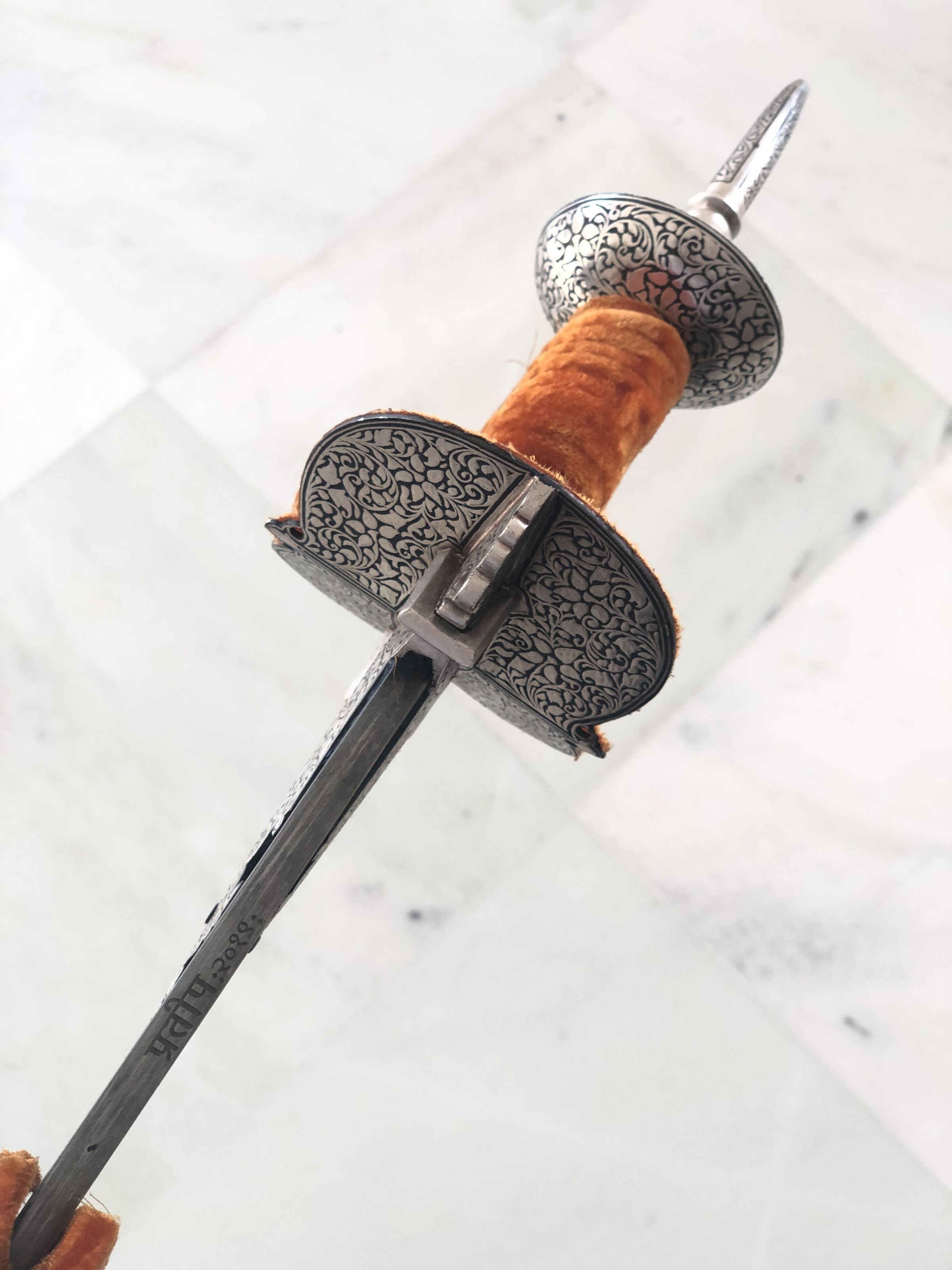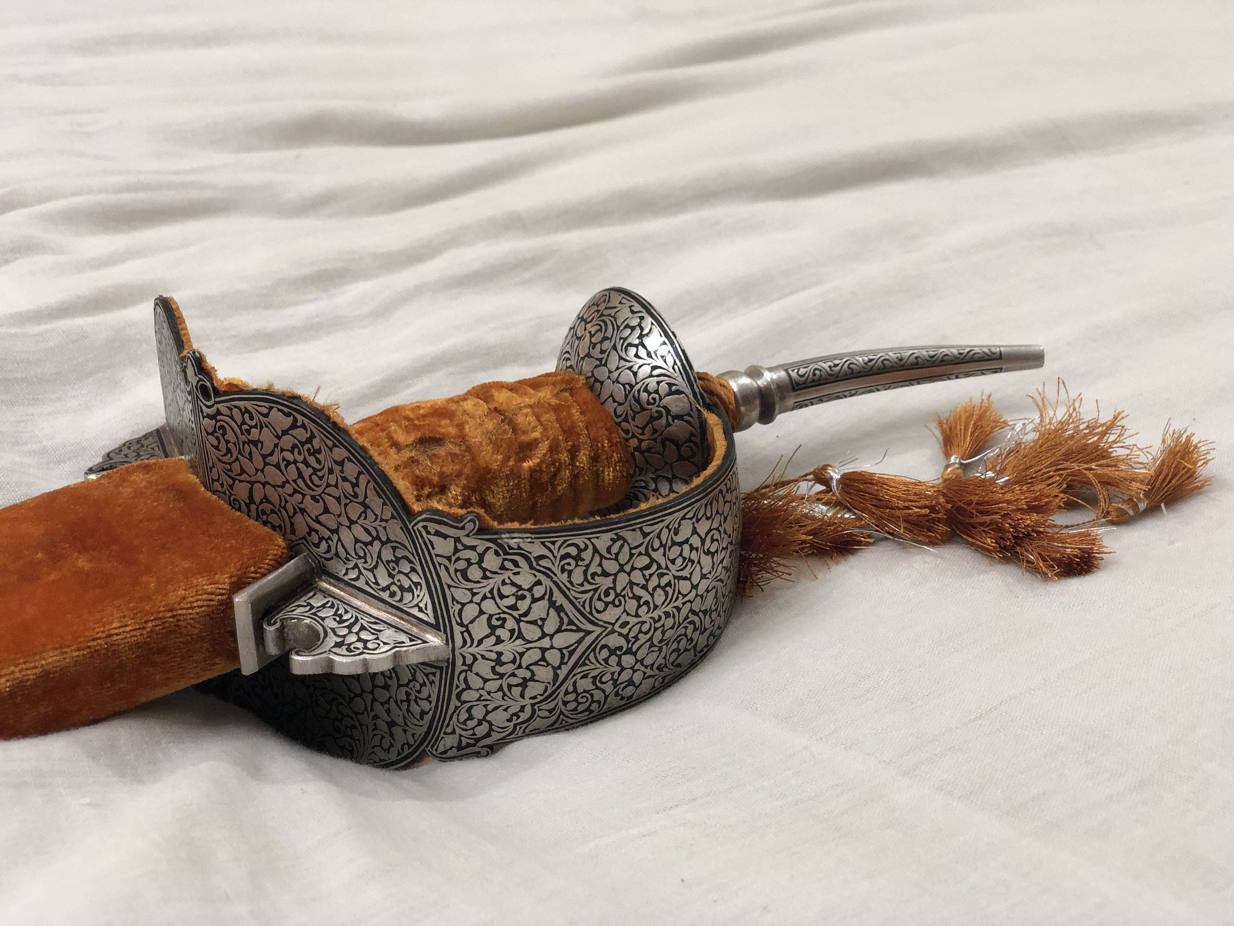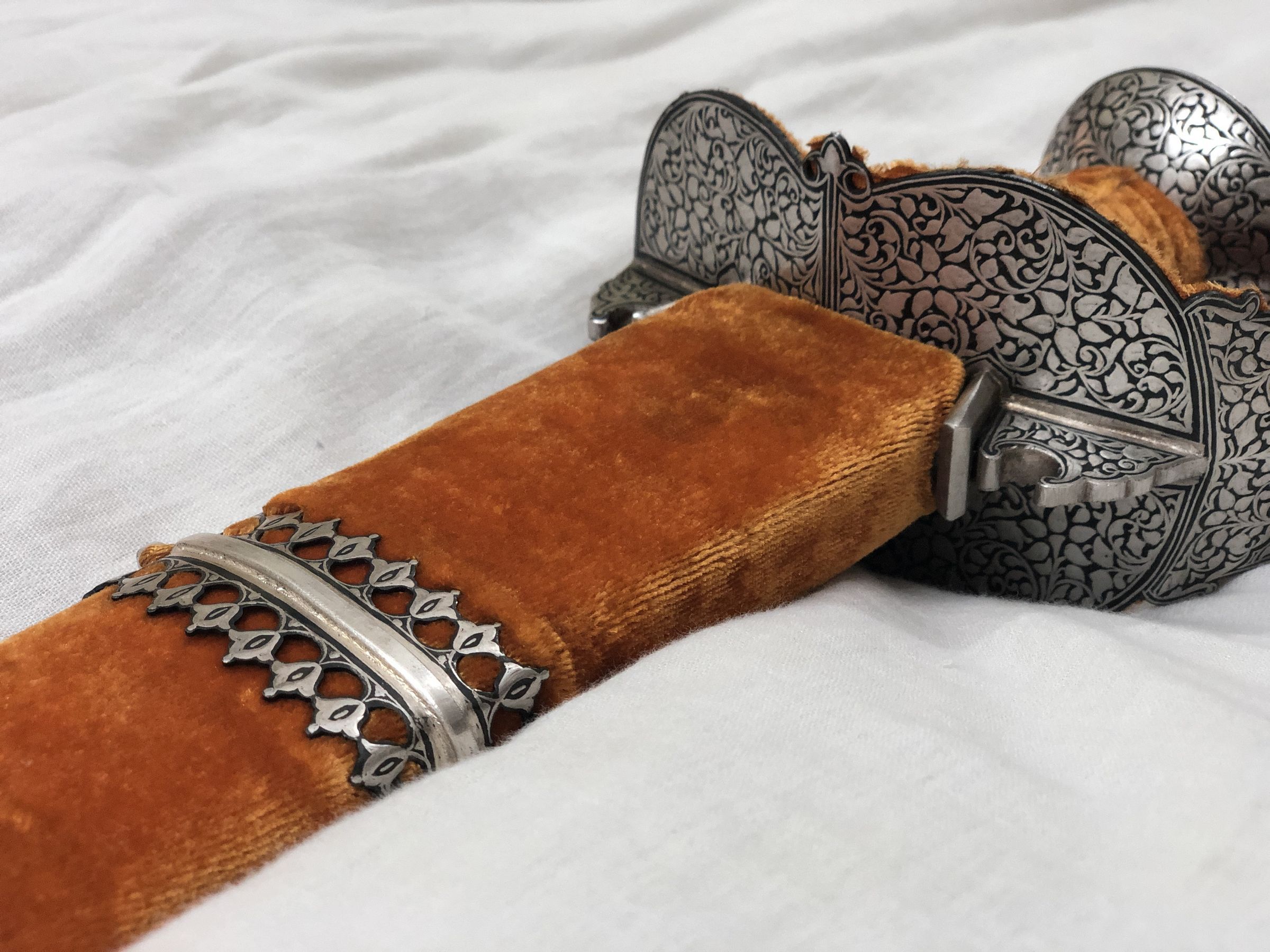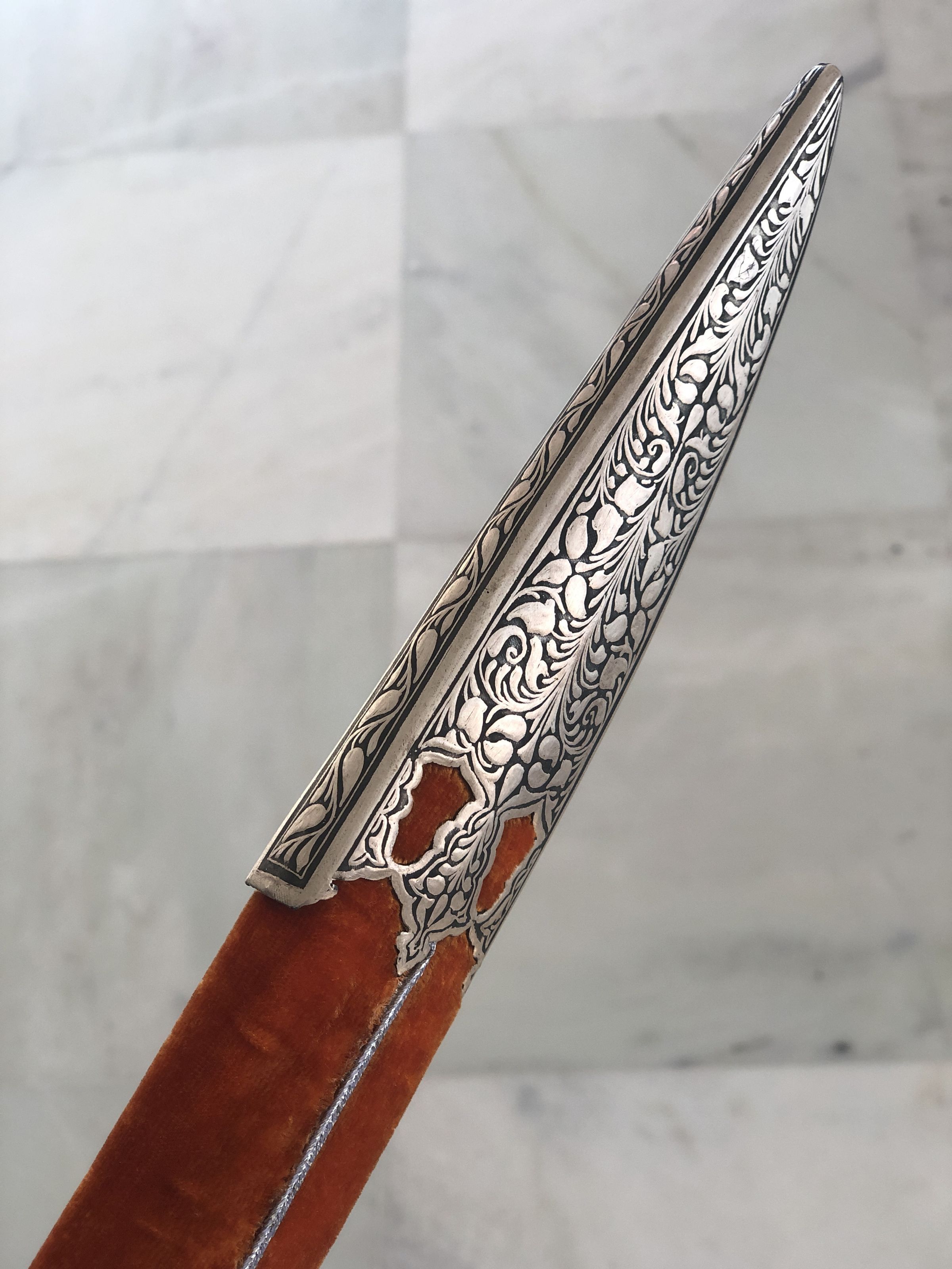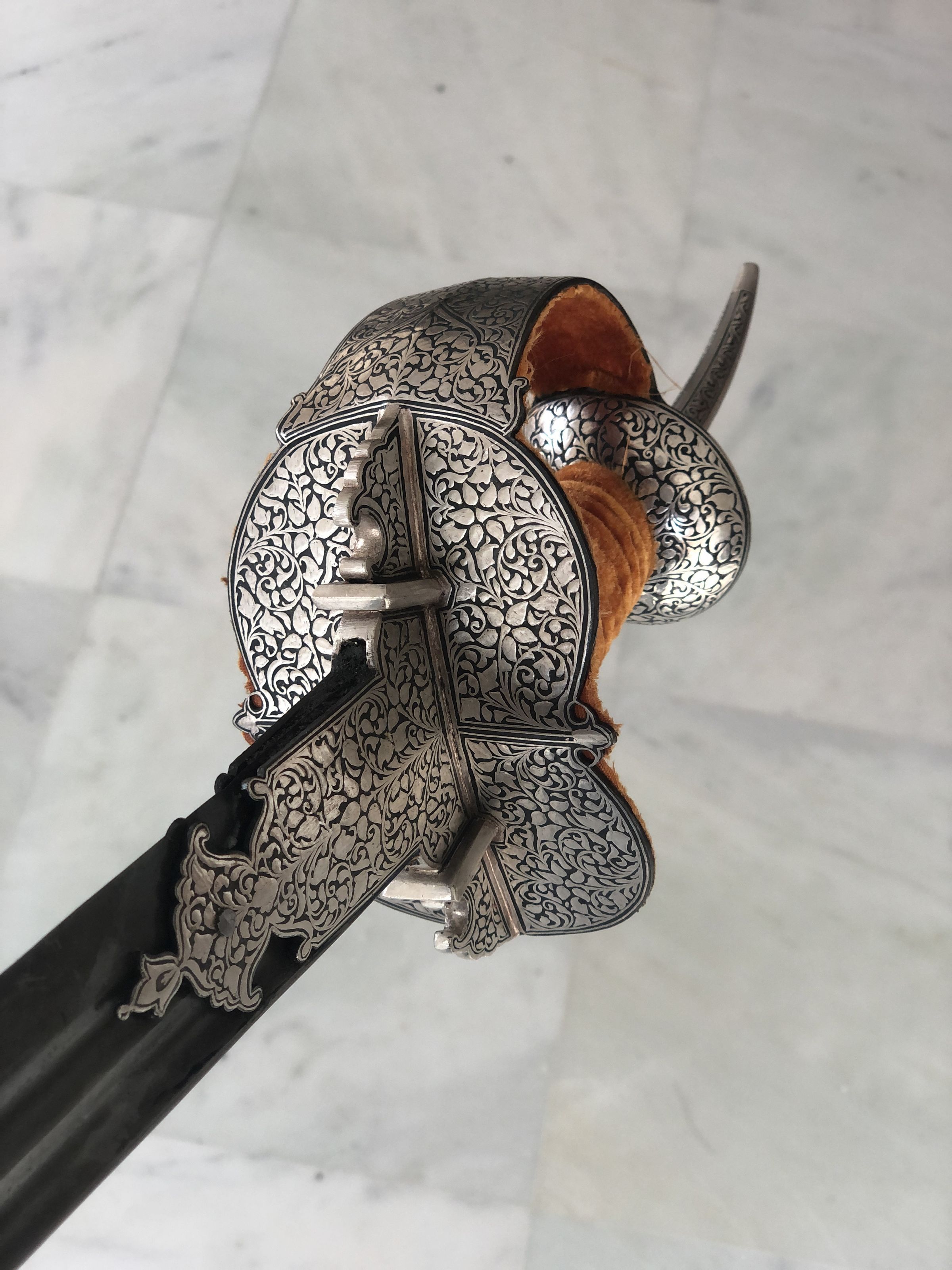 This Firangi Blade is a highly ornate piece, forged as a fighting weapon. Double fullers running through the compete length of the blade and short chisled tip makes this cut and thrust weapon. Classic Indian Basket hilt with staright bottom spile and velveted grip. Deep Silver Koftagari work on Chape, collar and on basket hilt.Made/Created