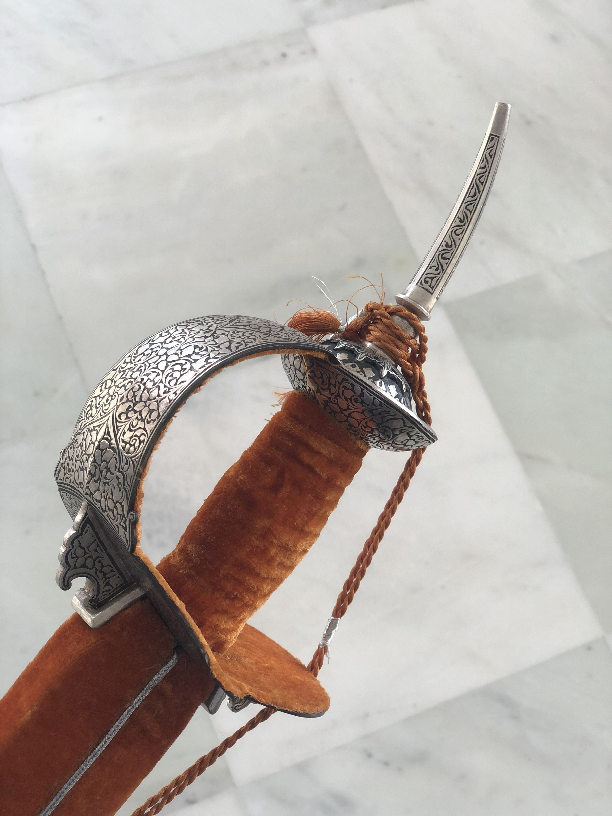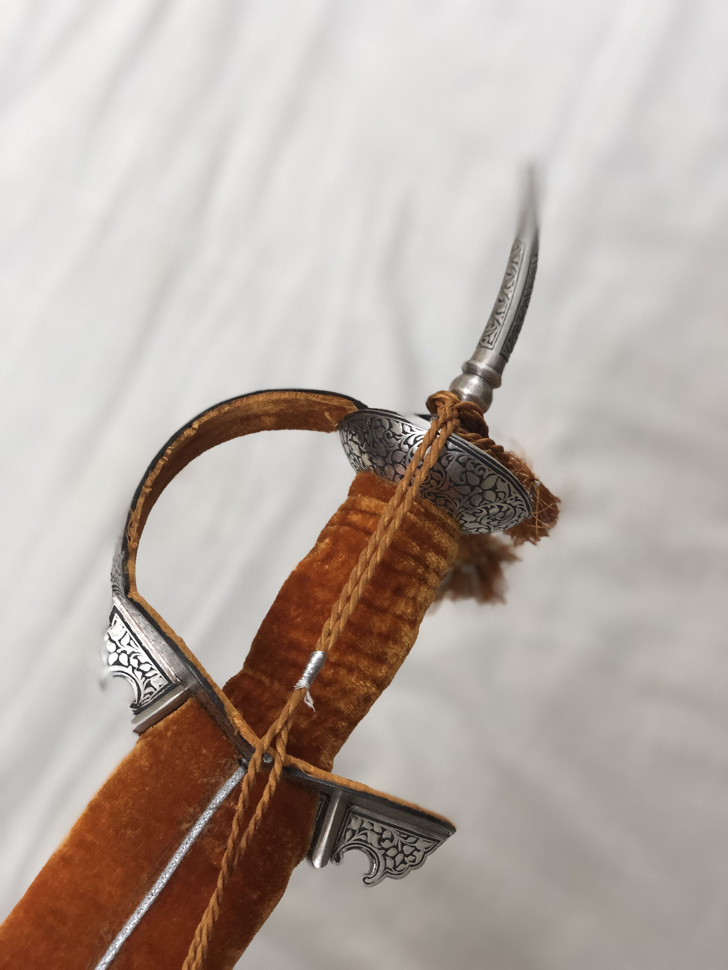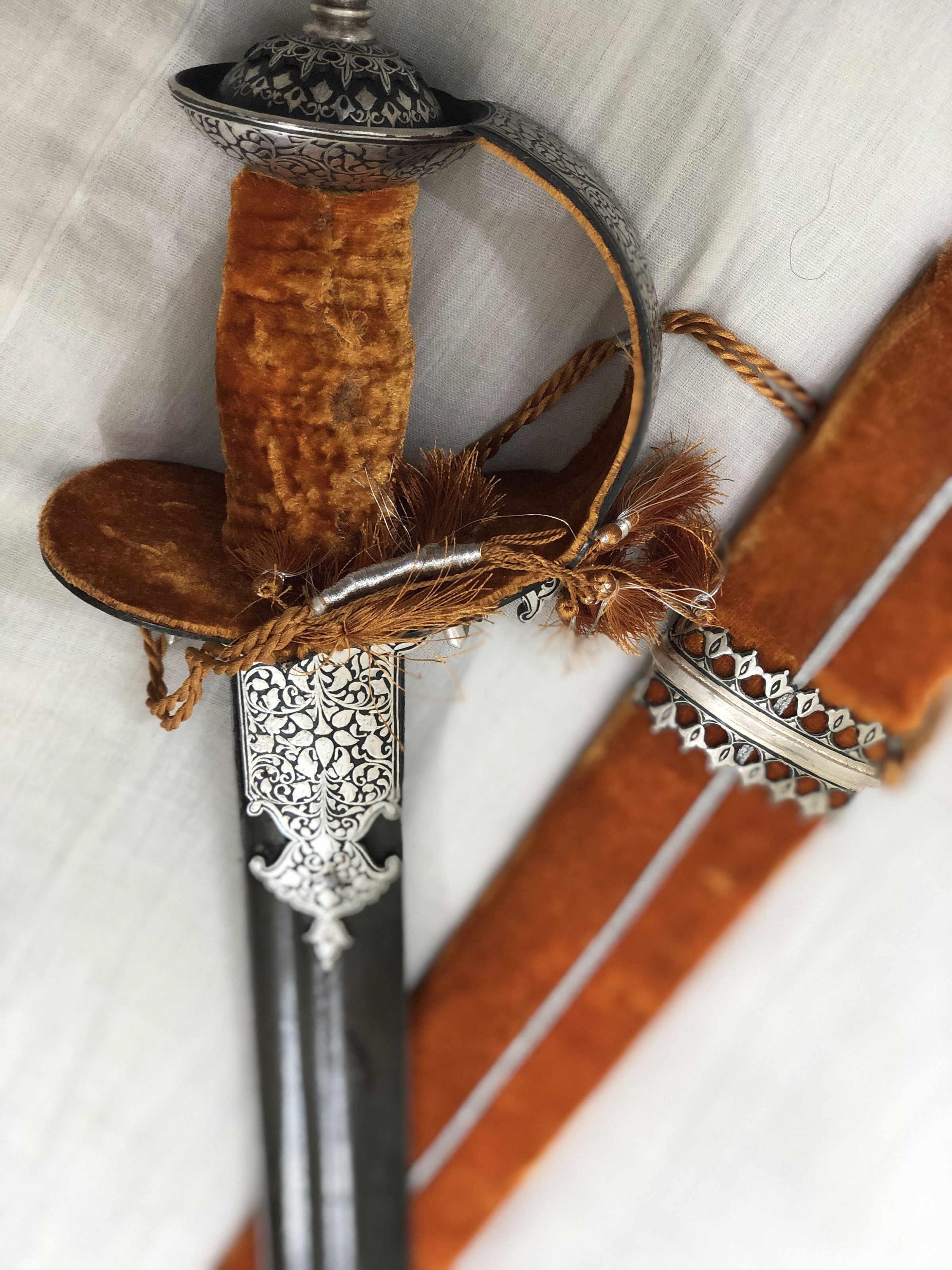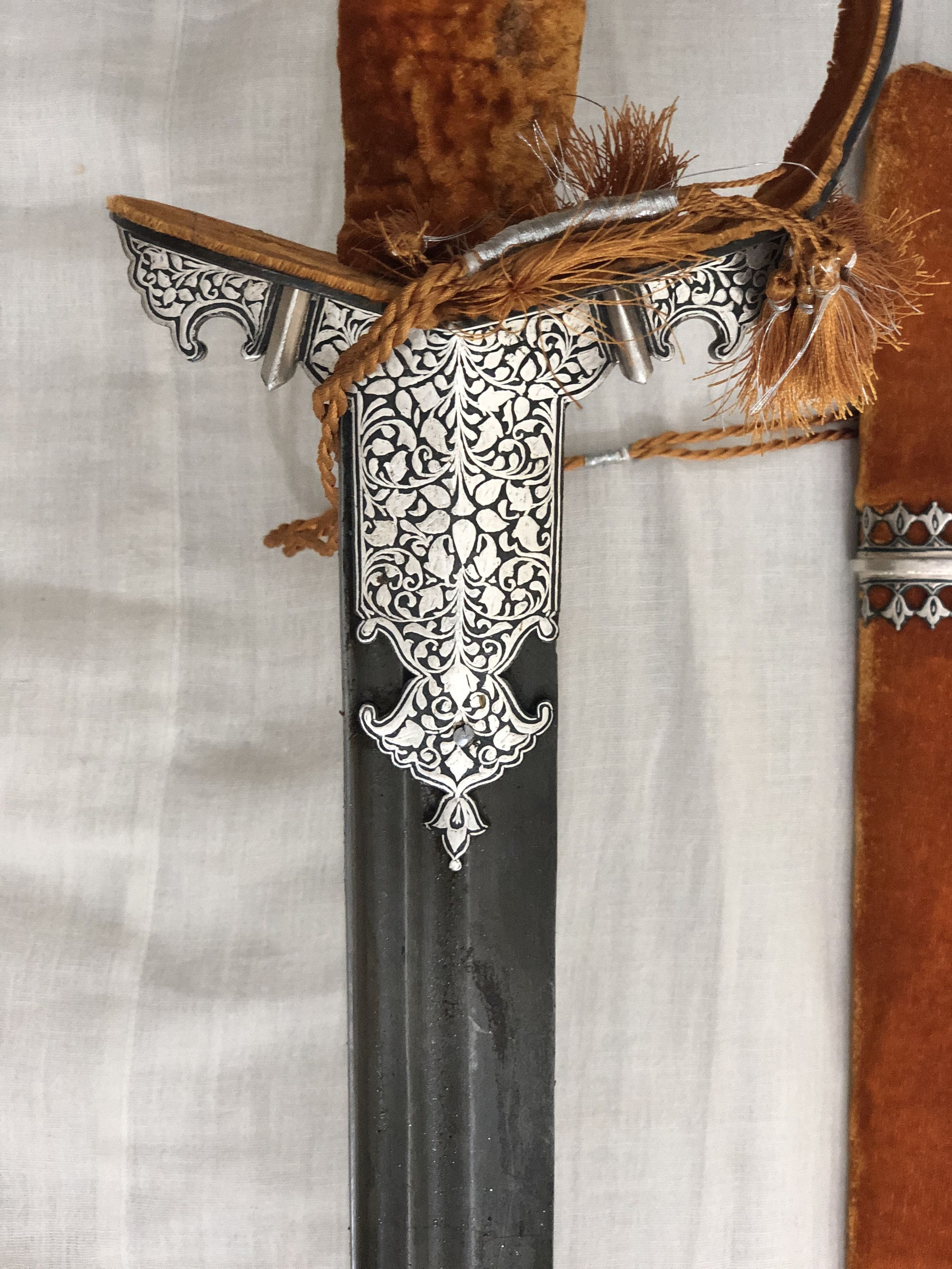 This Firangi Blade is a highly ornate piece, forged as a fighting weapon. Double fullers running through the compete length of the blade and short chisled tip makes this cut and thrust weapon. Classic Indian Basket hilt with staright bottom spile and velveted grip. Deep Silver Koftagari work on Chape, collar and on basket hilt.Made/Created