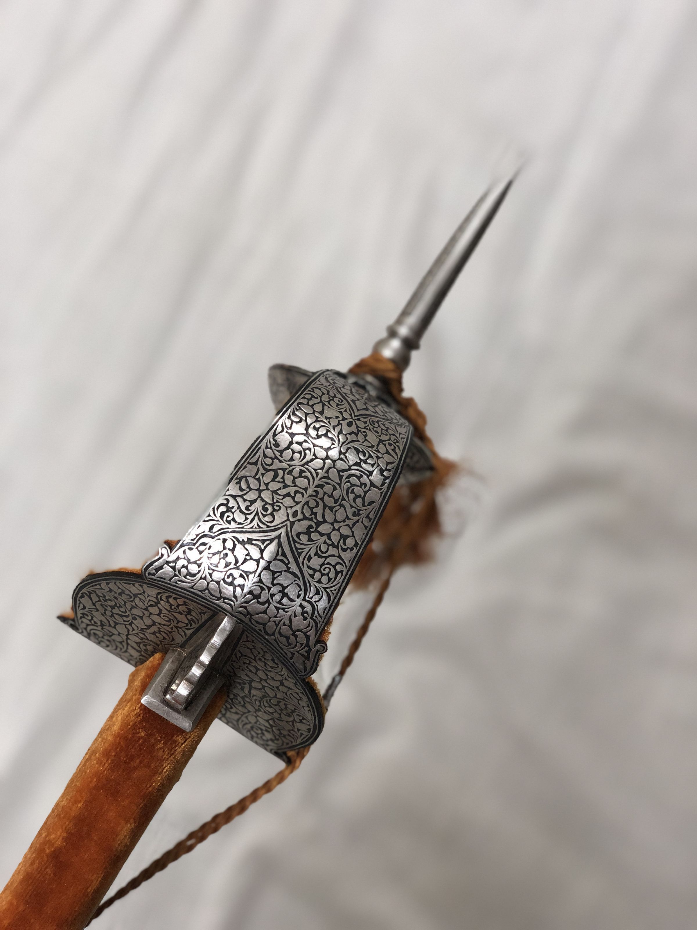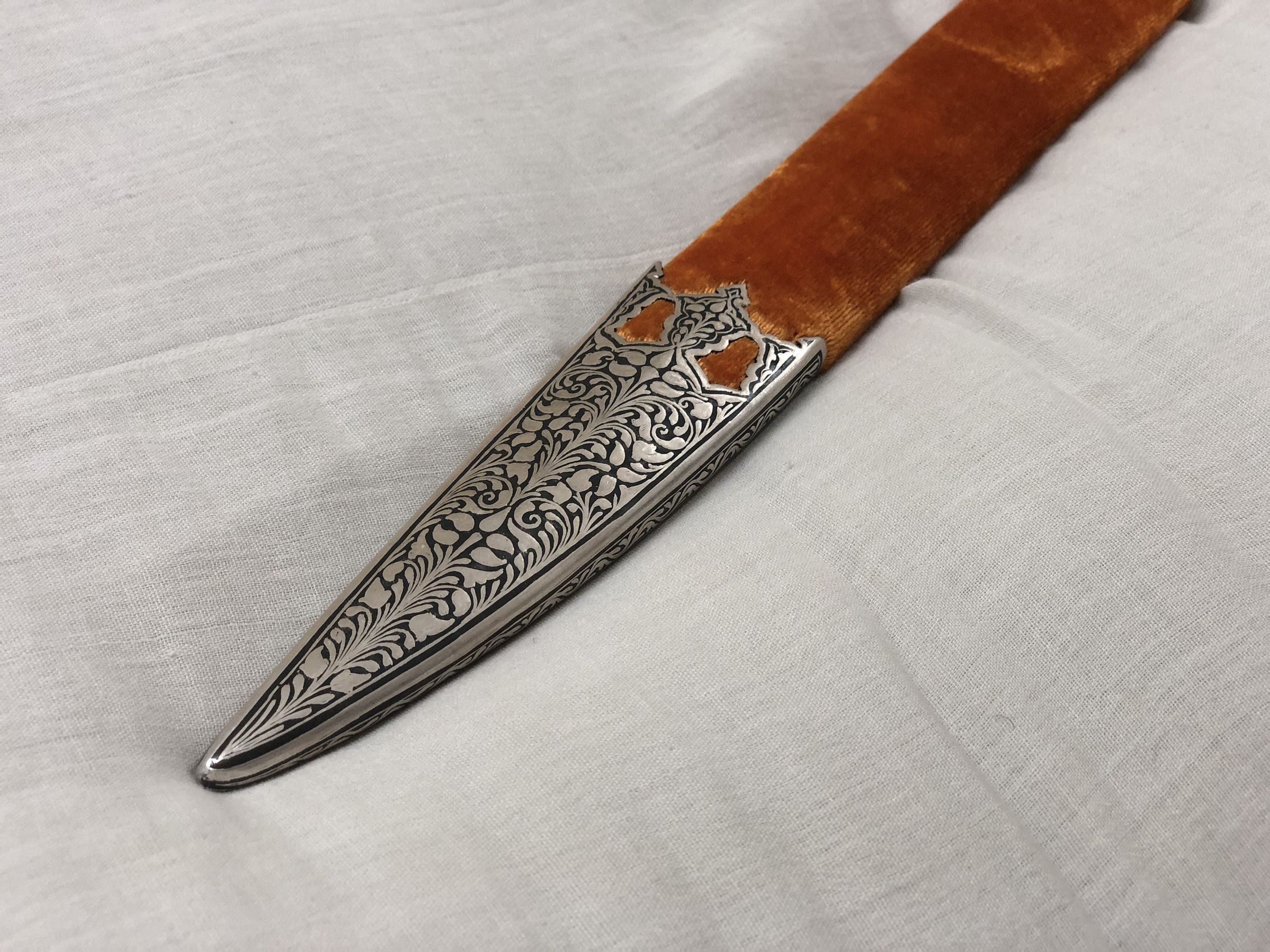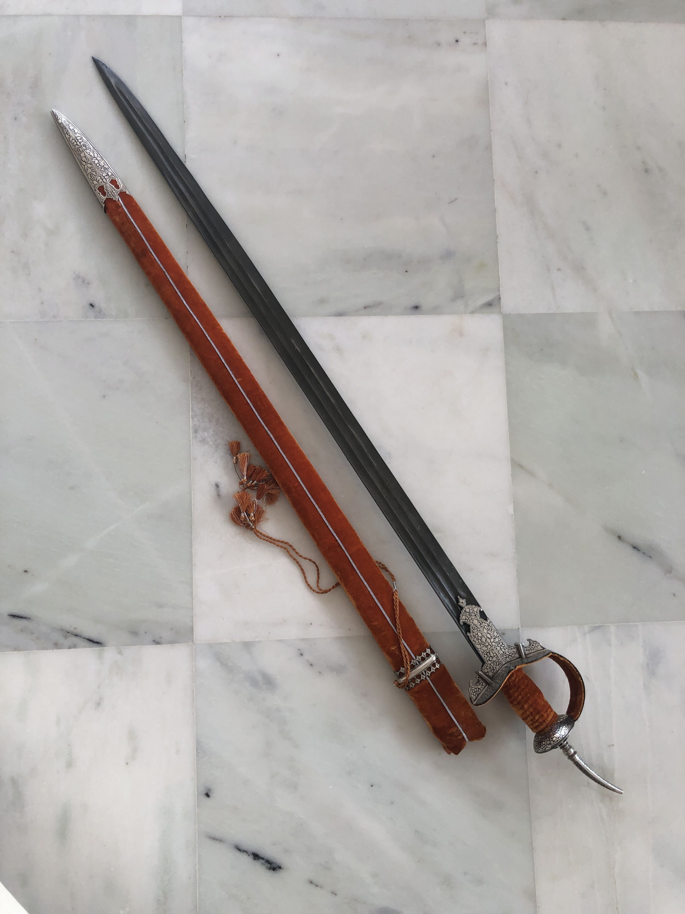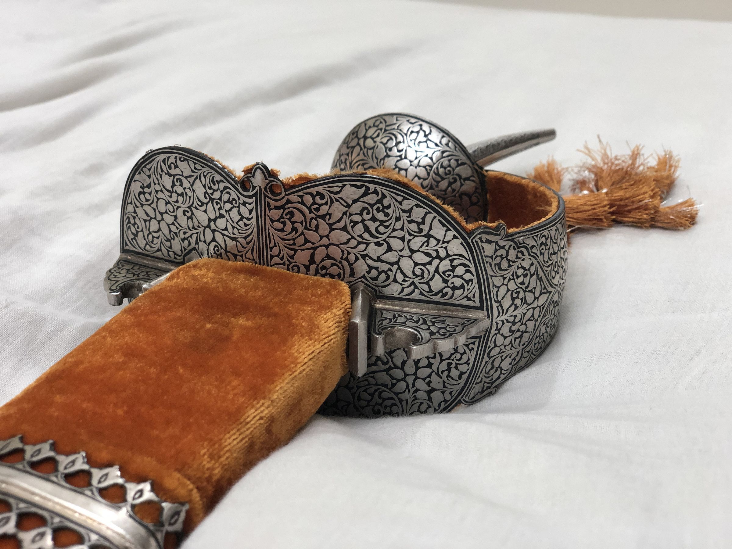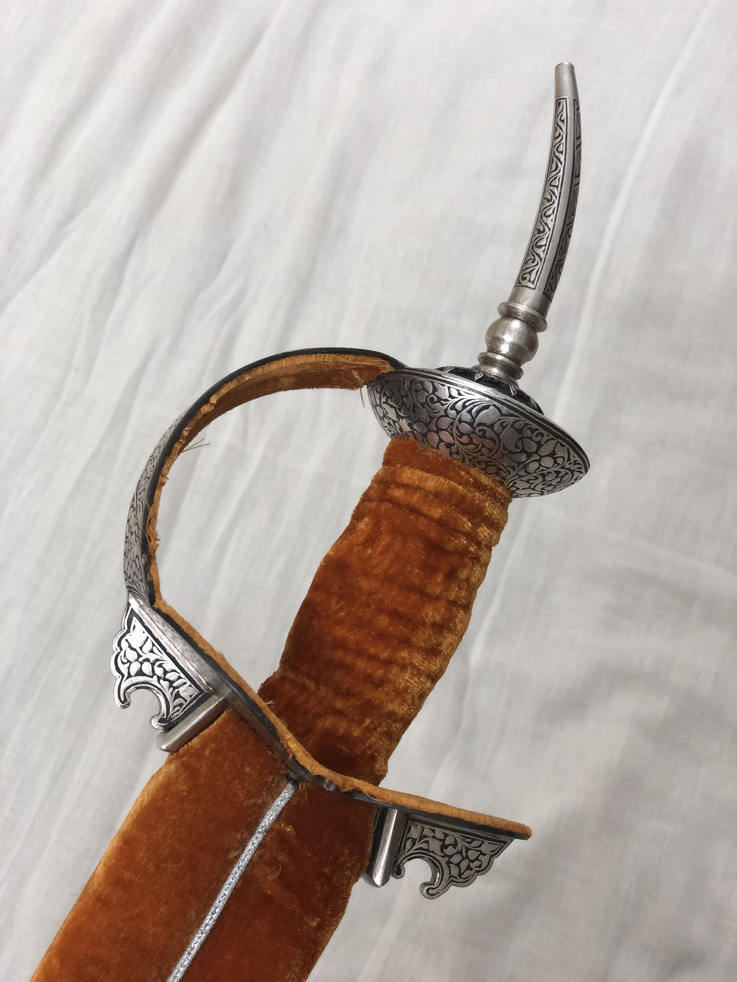 This Firangi Blade is a highly ornate piece, forged as a fighting weapon. Double fullers running through the compete length of the blade and short chisled tip makes this cut and thrust weapon. Classic Indian Basket hilt with staright bottom spile and velveted grip. Deep Silver Koftagari work on Chape, collar and on basket hilt.Made/Created