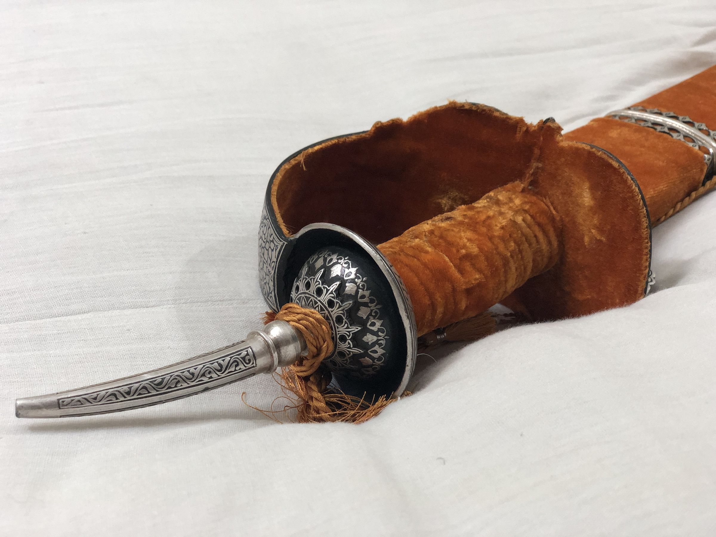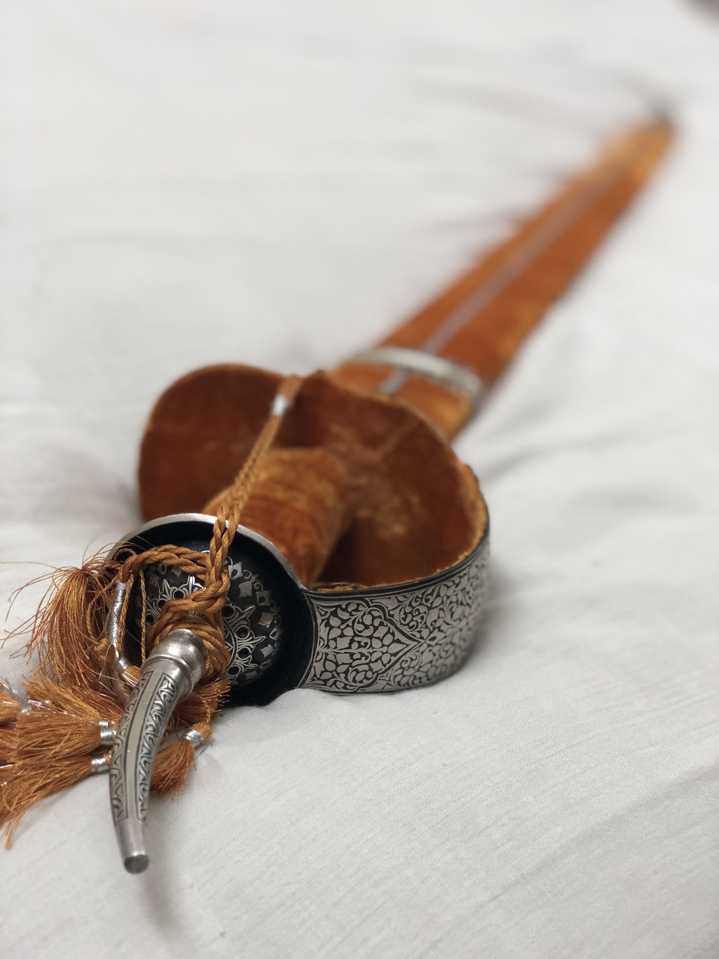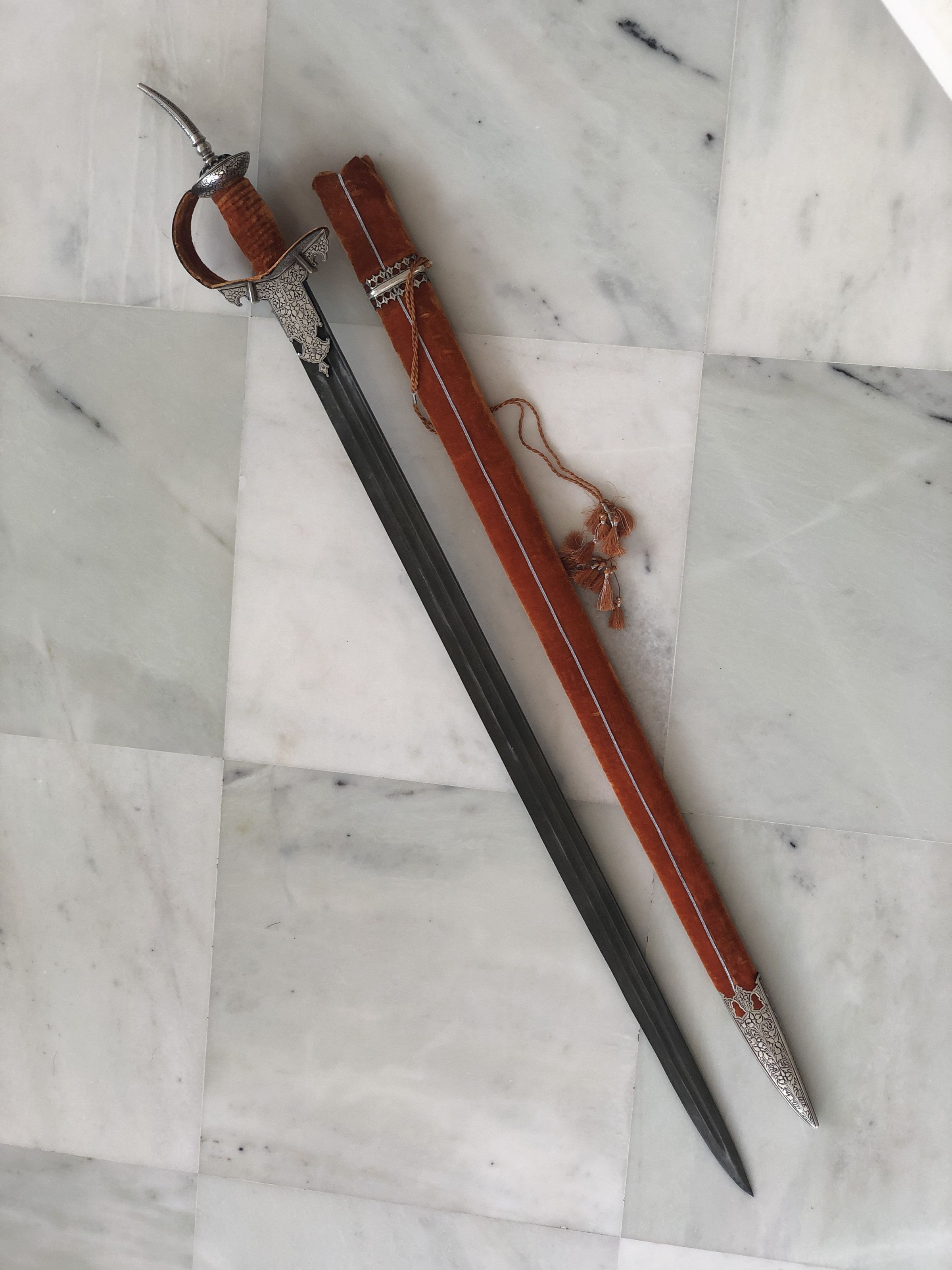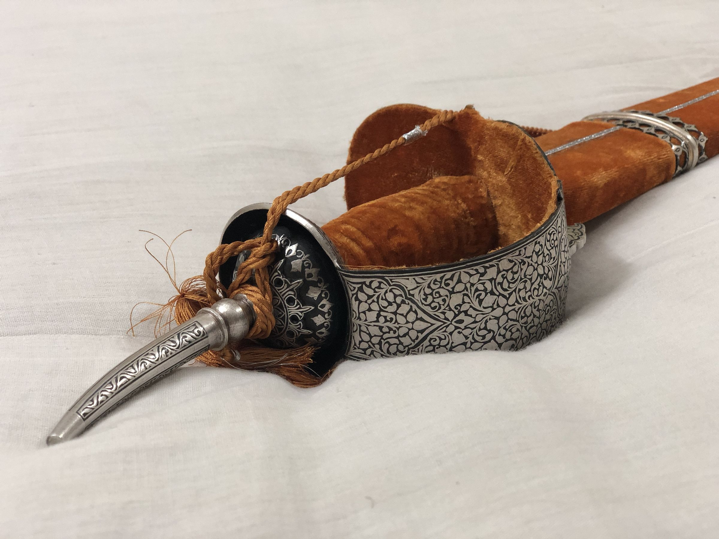 This Firangi Blade is a highly ornate piece, forged as a fighting weapon. Double fullers running through the compete length of the blade and short chisled tip makes this cut and thrust weapon. Classic Indian Basket hilt with staright bottom spile and velveted grip. Deep Silver Koftagari work on Chape, collar and on basket hilt.Made/Created