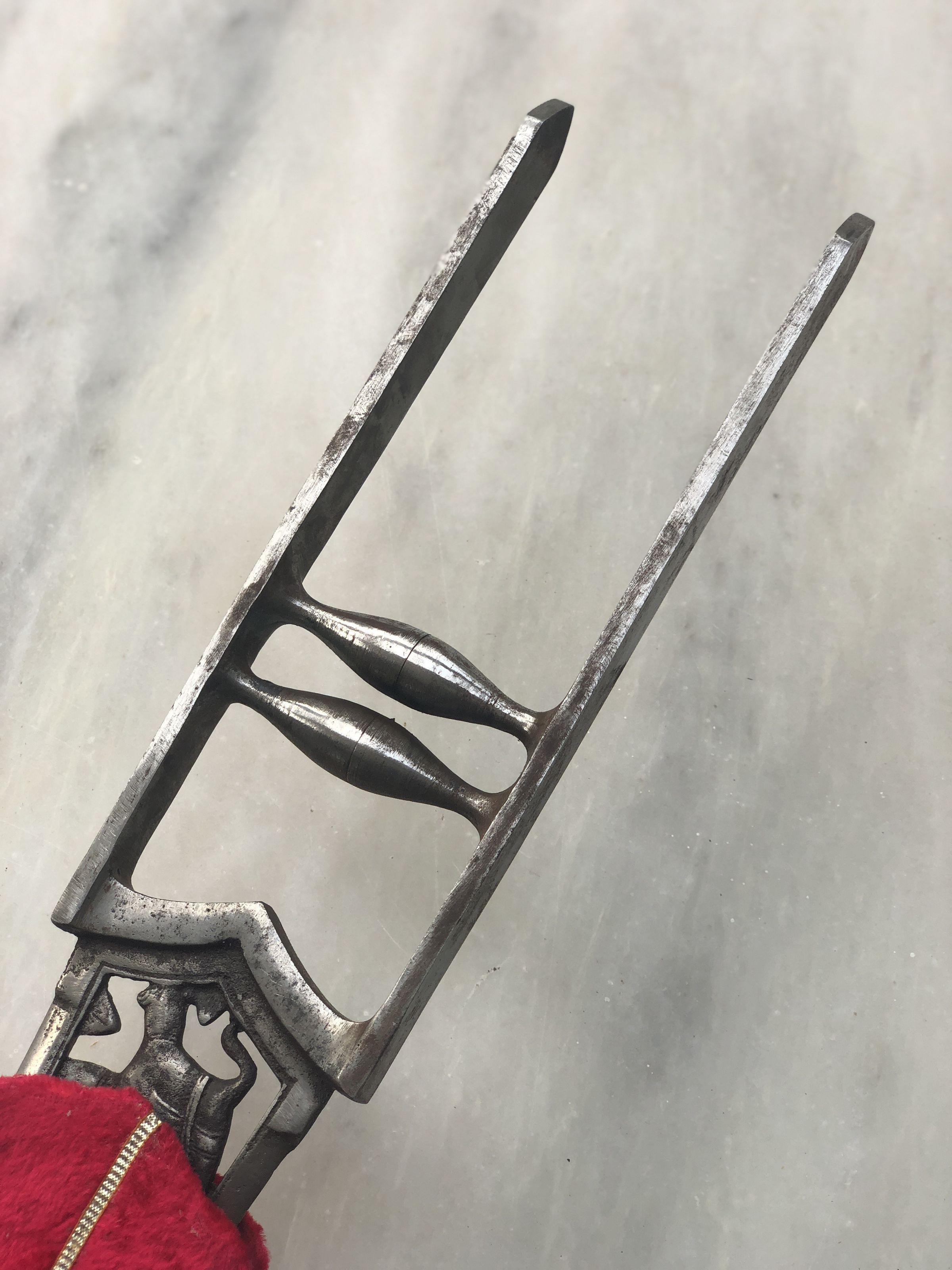 The image presents a ceremonial dagger alongside its red velvet sheath, both lying on a marble surface. The dagger features an elaborate handle with intricate silver filigree work and a pattern that suggests gothic or medieval influences. It has a metallic blade that tapers to a sharp point, and the grip design indicates that it might be a piece rooted in historical or ceremonial significance. The sheath is adorned with a simple, elegant cross pattern stitched in golden thread, adding a regal touch to the ensemble. A small, white paper tag marked with the number "32" in red ink is attached to the sheath, hinting that this item could be part of a collection or exhibit. From its remarkable craftsmanship, this dagger likely serves more as a decorative or collectible relic rather than a utilitarian tool, embodying artistic as well as historical values.