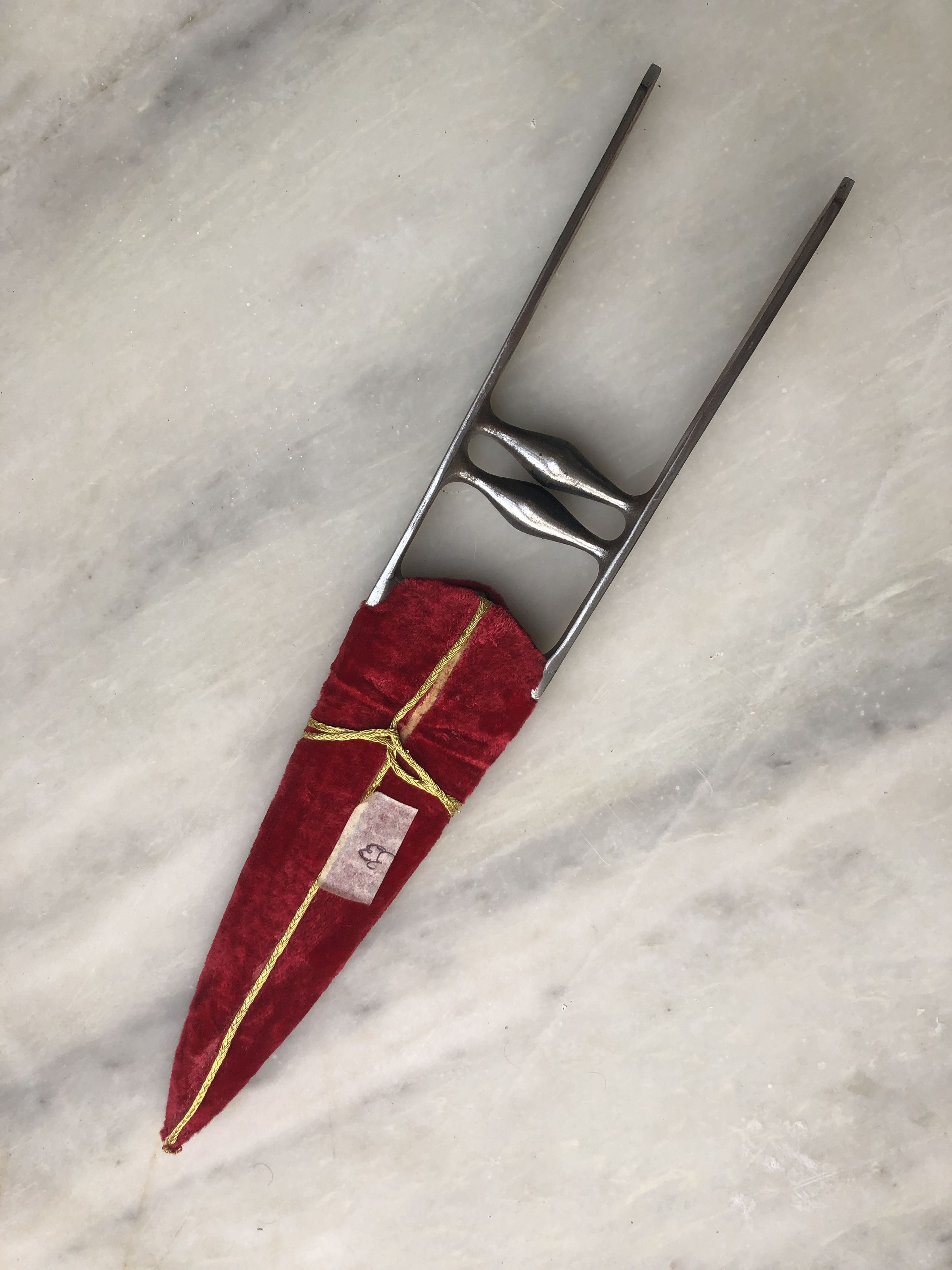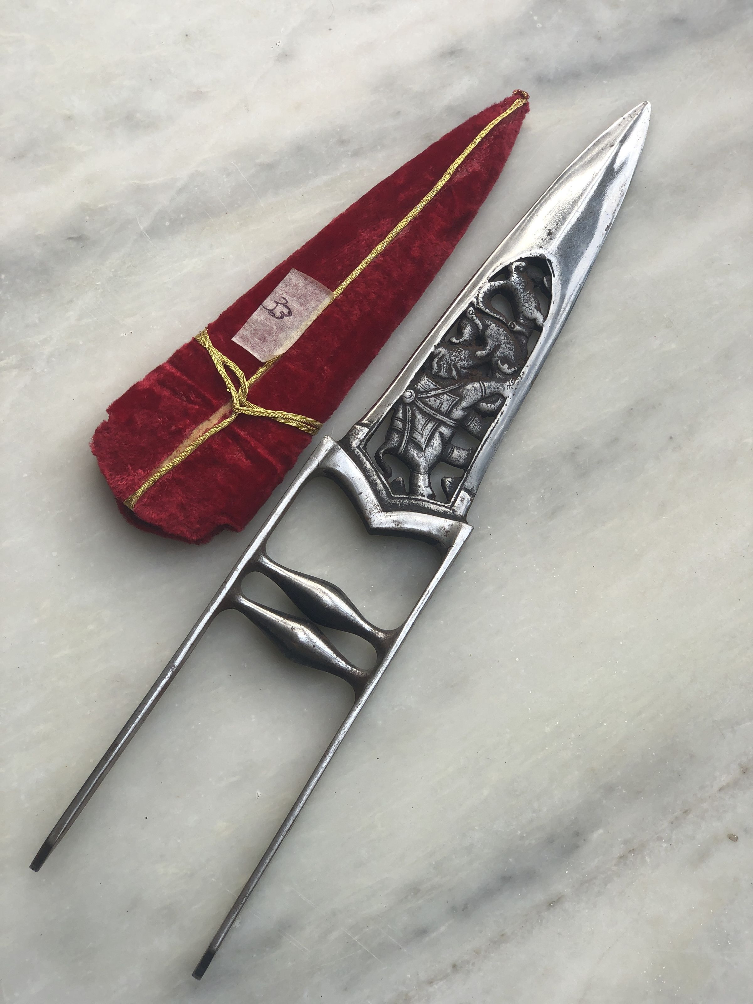 Second of the two Katars from a presentation set made as a gift to person of status. Both are heavy blades, with traditional chiseled tips but without prominent diamond cross section but rather oval/almond like cross section. The Blade has through engraving depicting a hunting scene, involving, elephants with Ohda and Mahut, and tigers or leopards being hunted. This type of presentation daggers became popular after the Britishers started coming for hunting inn the forests of Princely state, from mid 19th to early 20th Centuries. This piece has passed through my restoration rounds and hence looks shinier.Made/Created