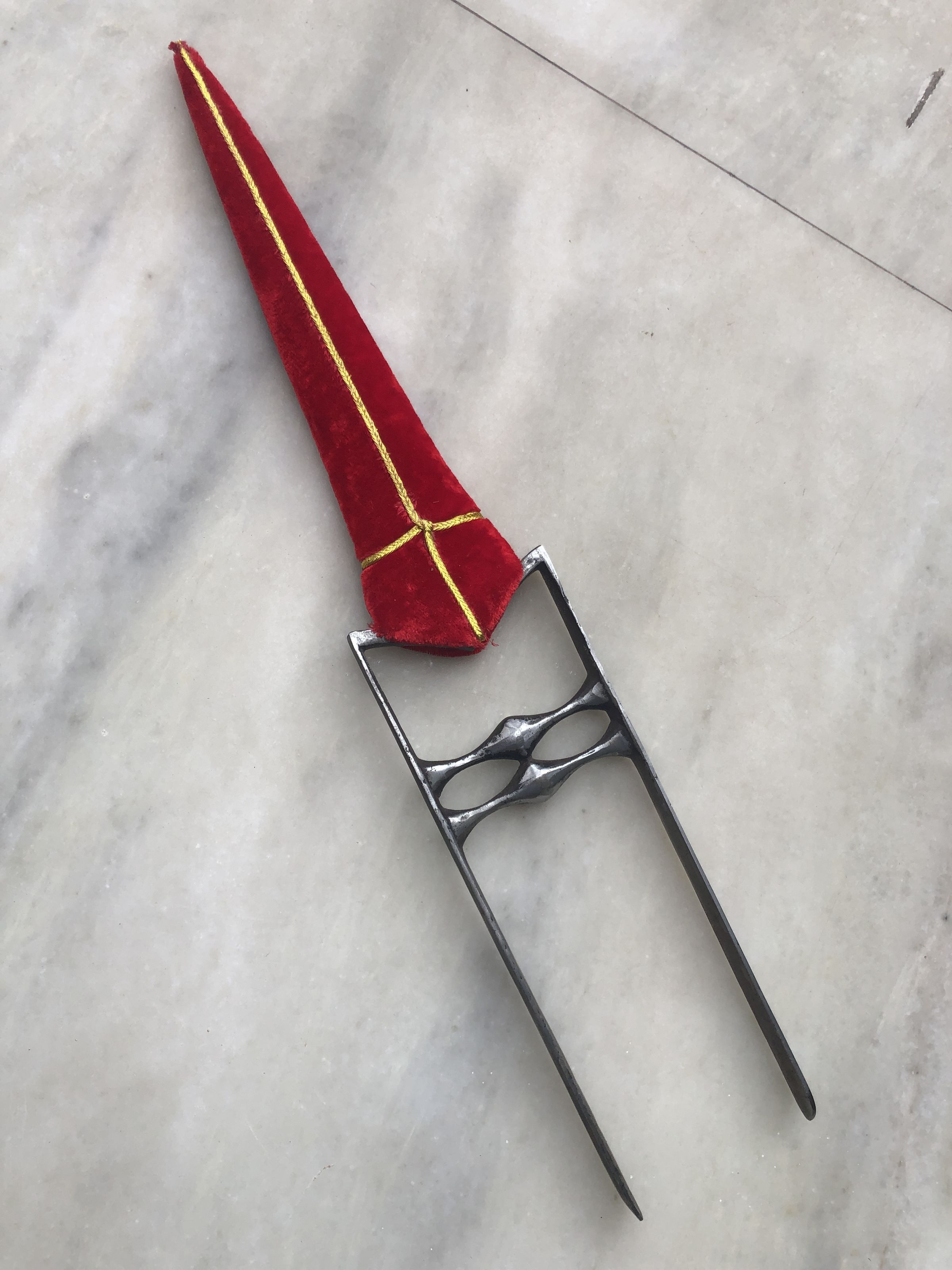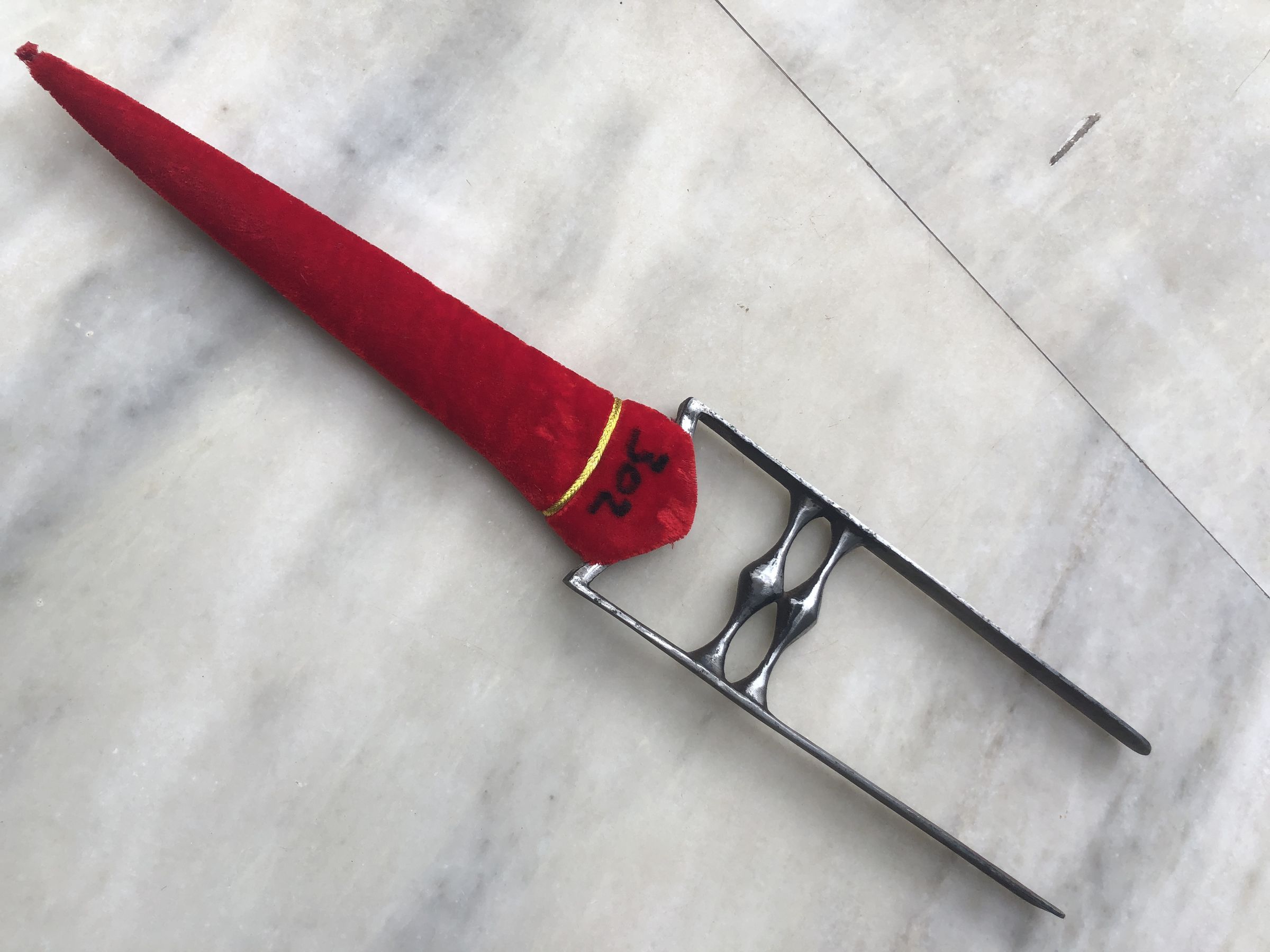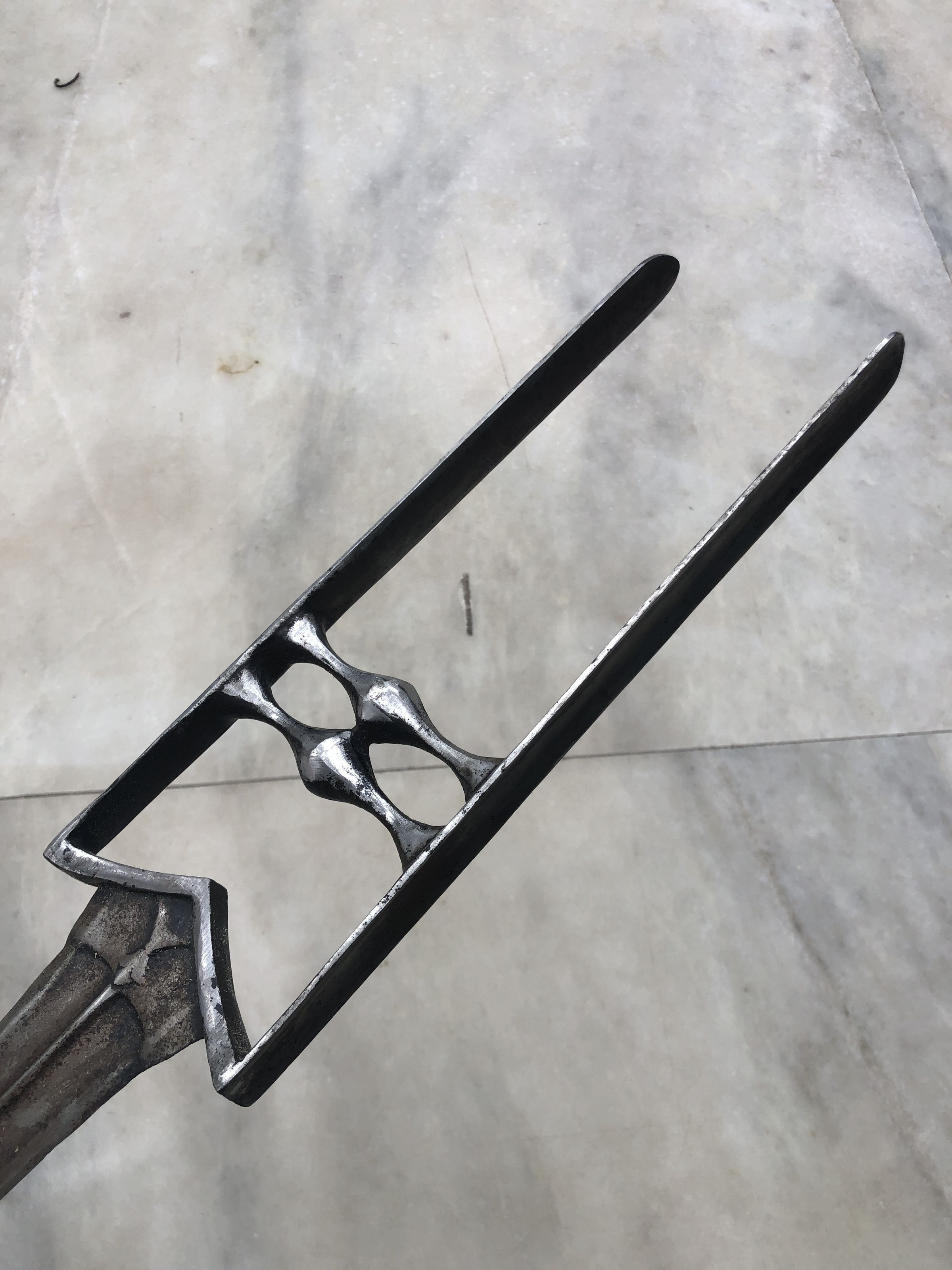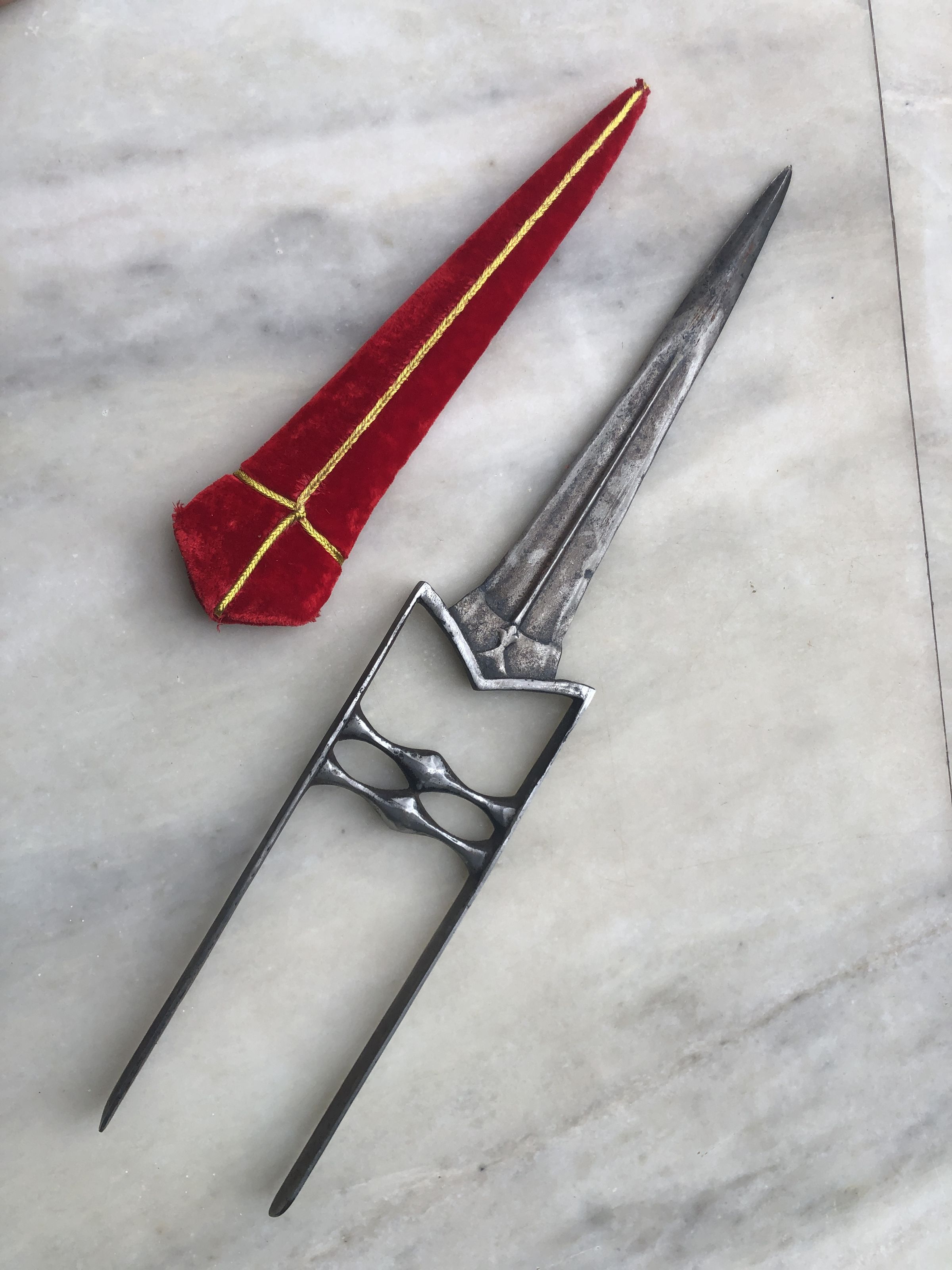 This Katar is a Sikh/Punjabi origin which can be deducted from the Robert Elgood catalogues and items at display in Metropolitan Museum of Arts, NY. Narrow blade with prominent spine and stepped fuller. some art work (floral) engraving at the bottom. Wootz blade with steel handle forge welded.Made/Created