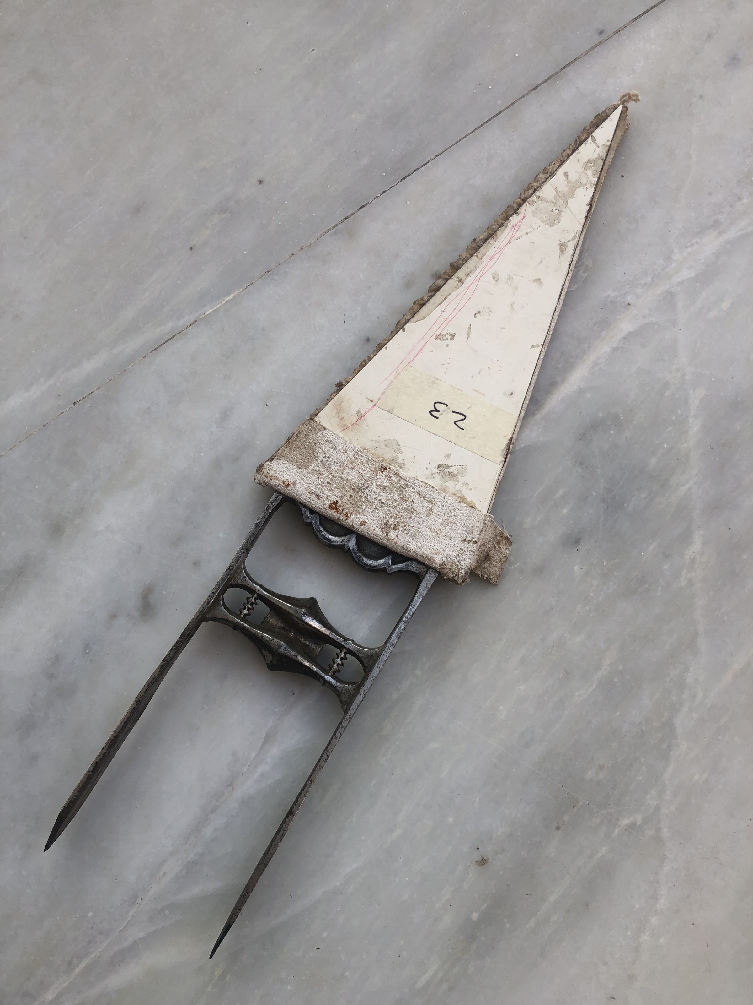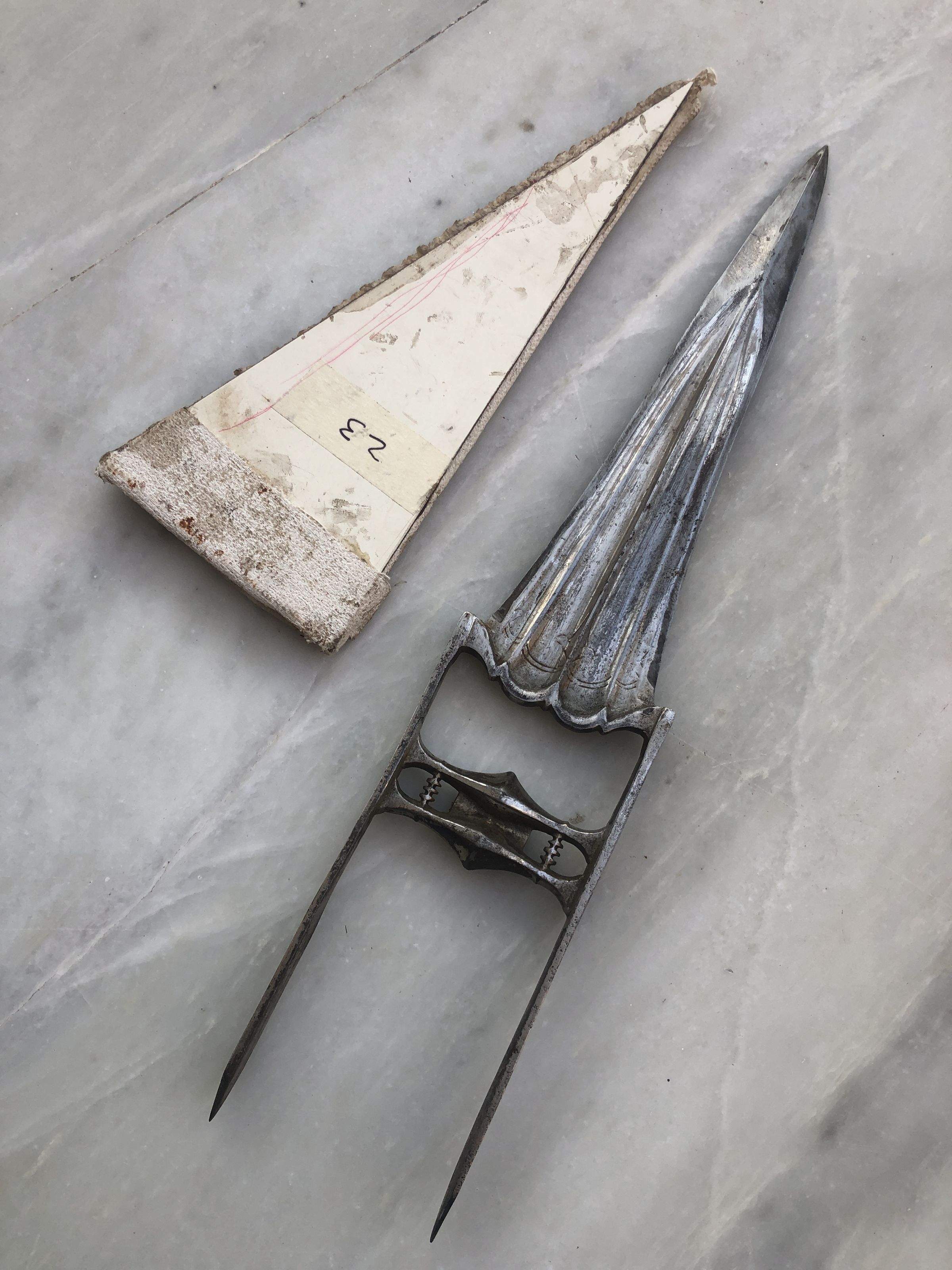 This Katar, is made for power impression. triple, tall and imposing ridges and finger tip blade rests show a sign of maker's effort to make a weapon to make impression. full steel construction; some engraving added at a later stage, i.e. after the blade was heat treated as they are not uniformly deep.Made/Created