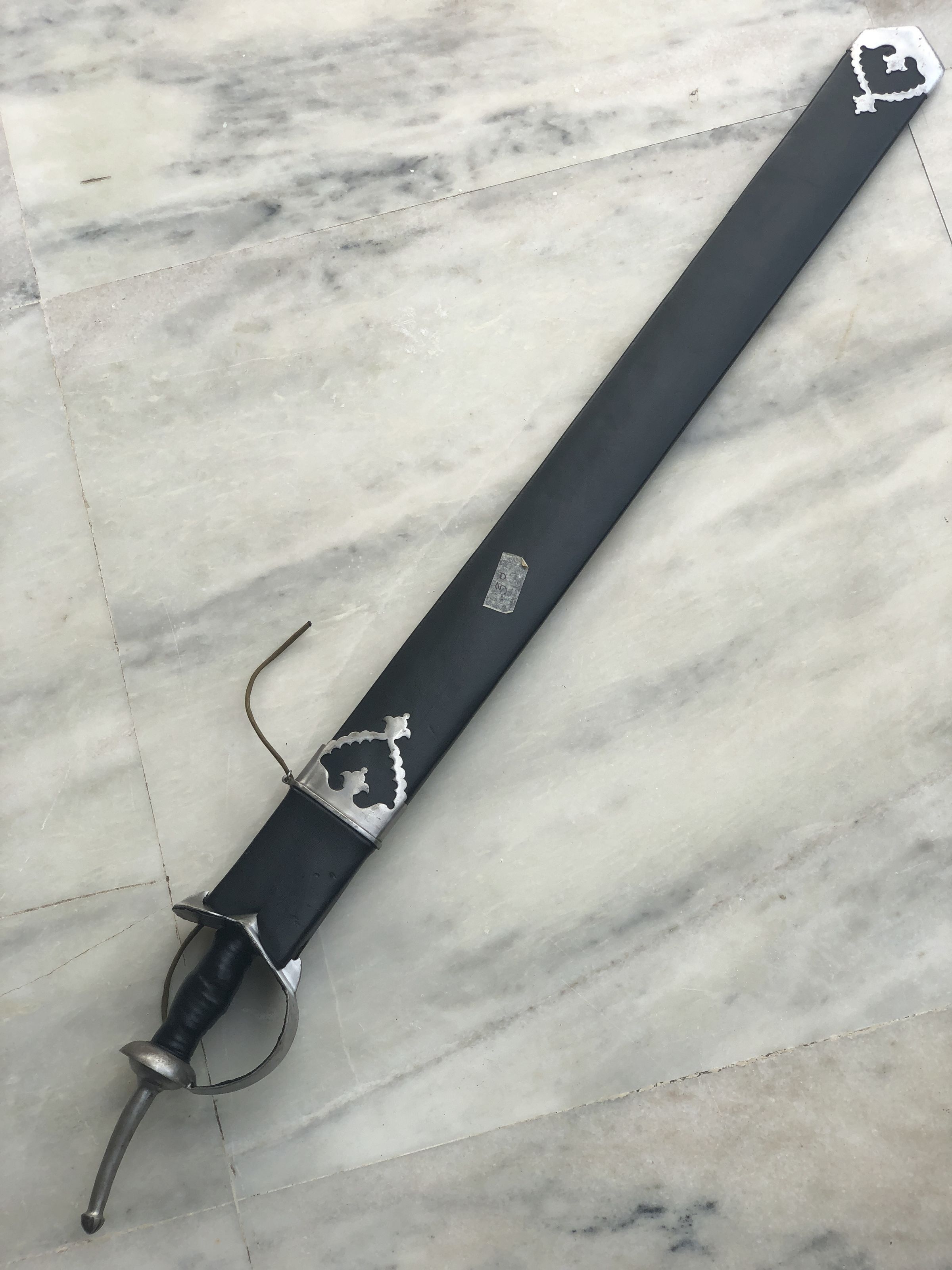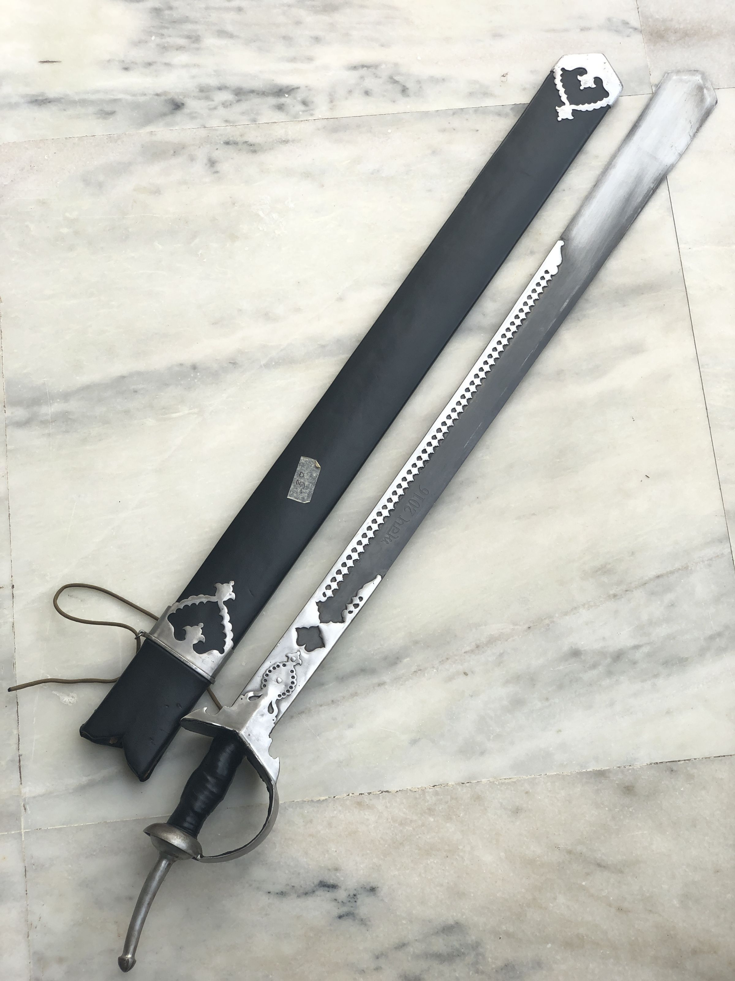 The image shows a decorative sword with a unique, sculpted metal guard and a partially serrated blade beside its scabbard, which is enhanced with aesthetic metal cut-outs and designs, all resting on a light-colored marble surface.