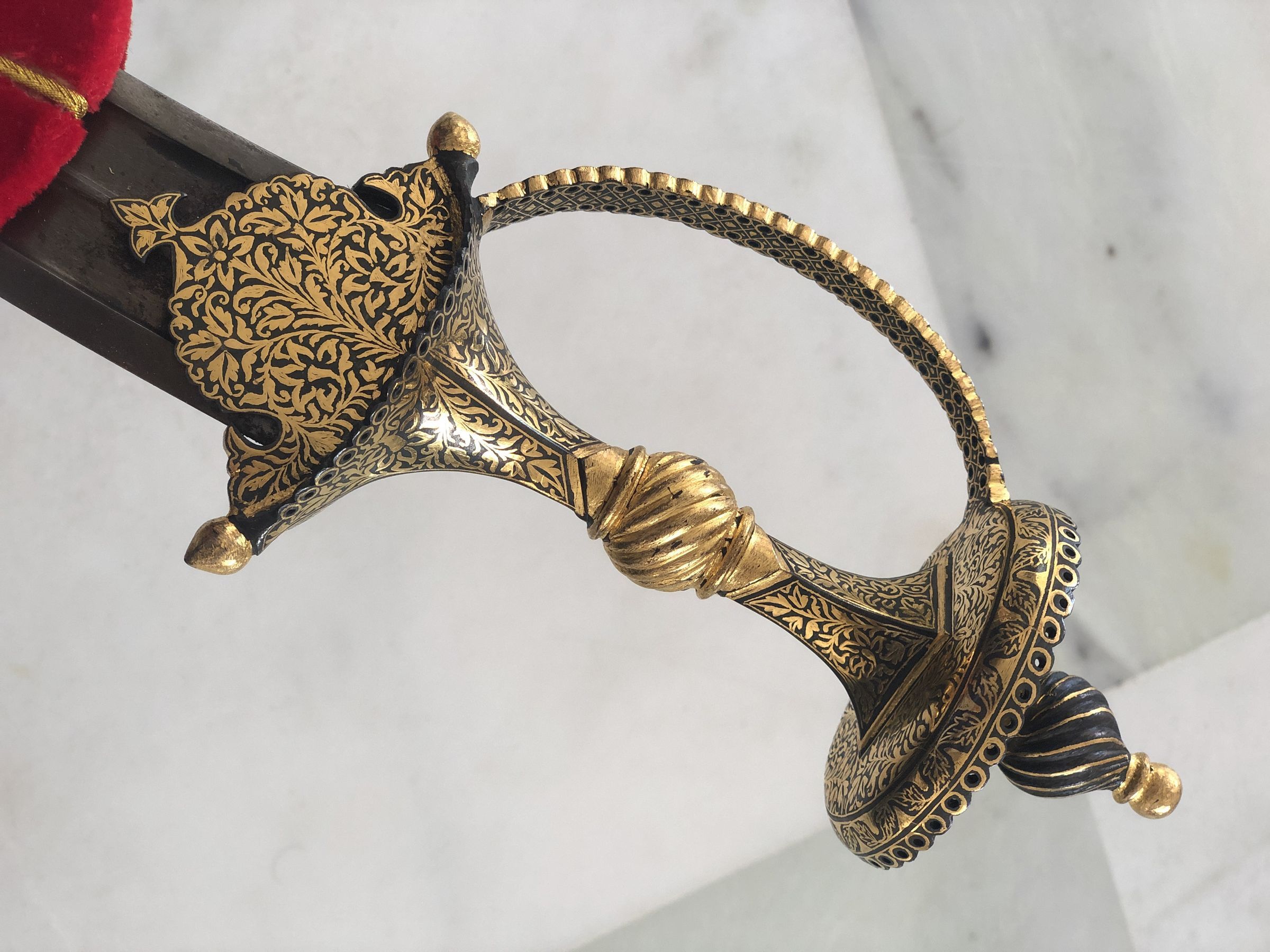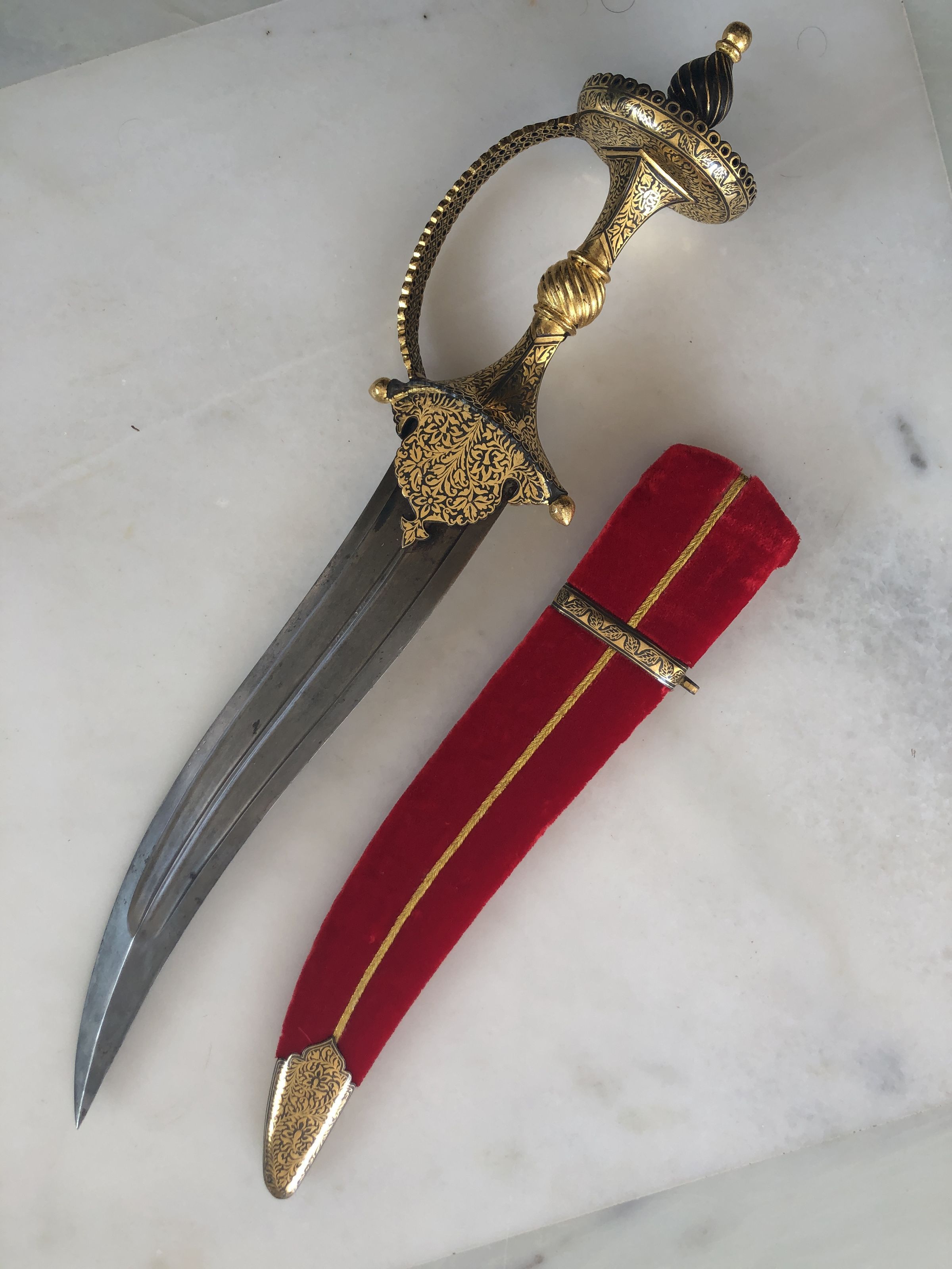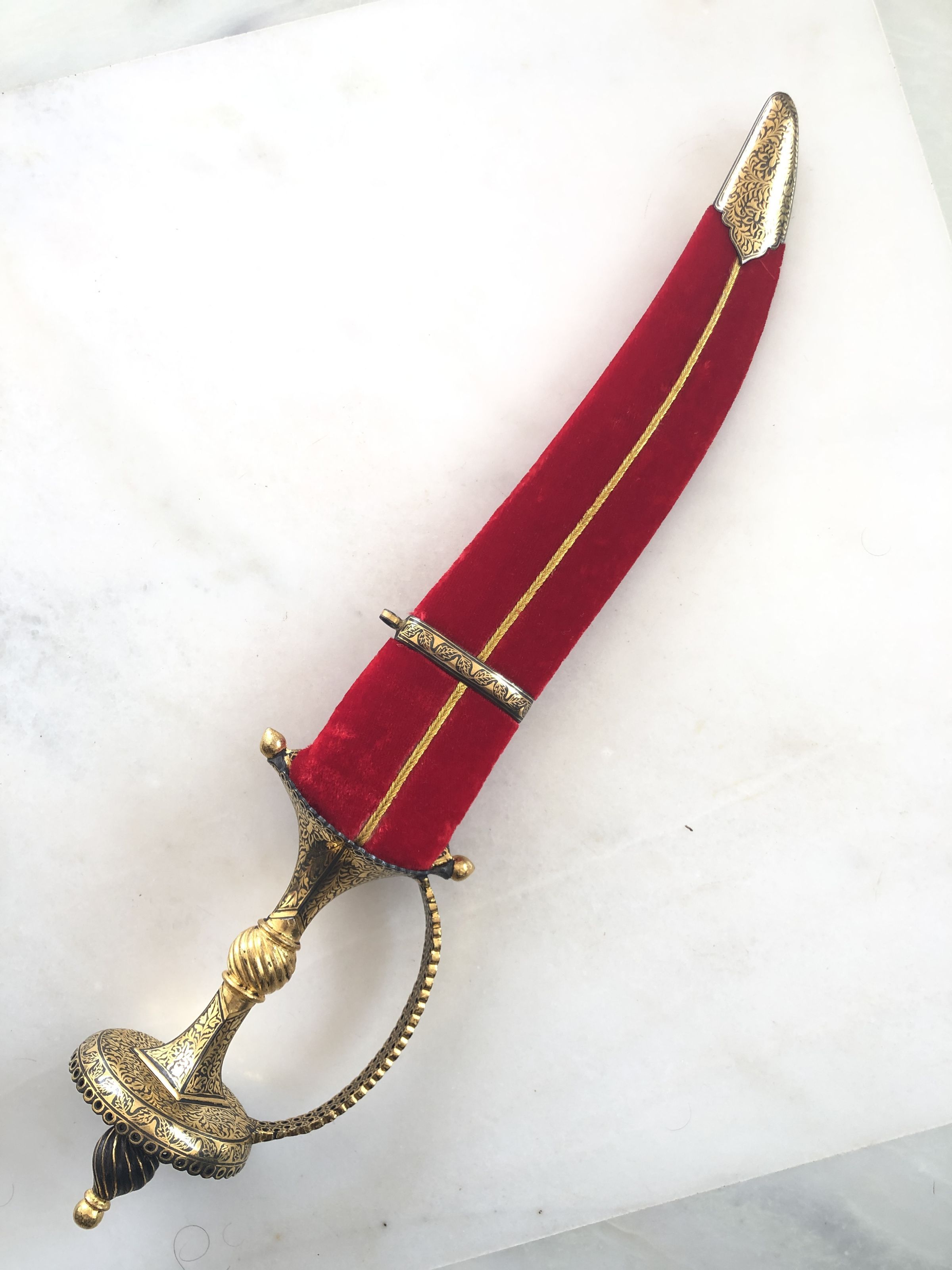 The image features an ornate dagger placed diagonally across a grayish-white marbled background. The dagger has a curved, sharp blade and a highly decorative handle, encompassing rich golden motifs that suggest a traditional or ceremonial design. The handle is characterized by its intricate patterns and a slight spiral at the grip, enhancing its elegant appearance. Adjacent to the dagger lies a red velvet sheath decorated with two golden stripes running its length, ending in a gold tip that matches the ornate decoration of the dagger's handle. The contrast of the vivid red sheath against the somber, gray background highlights the regal and antique quality of the dagger, making it a striking object that might be used for display or ceremonial purposes in various cultural settings.