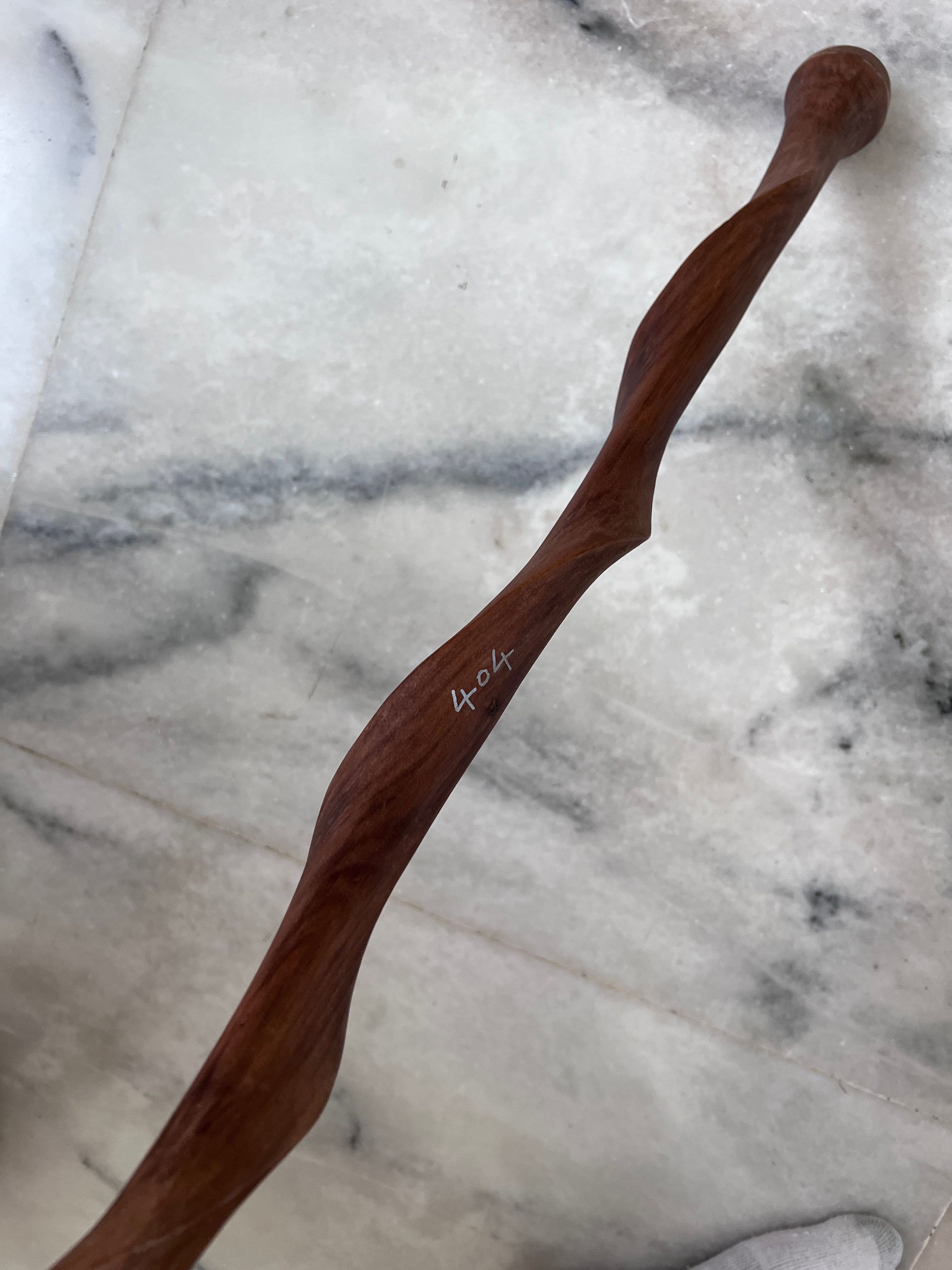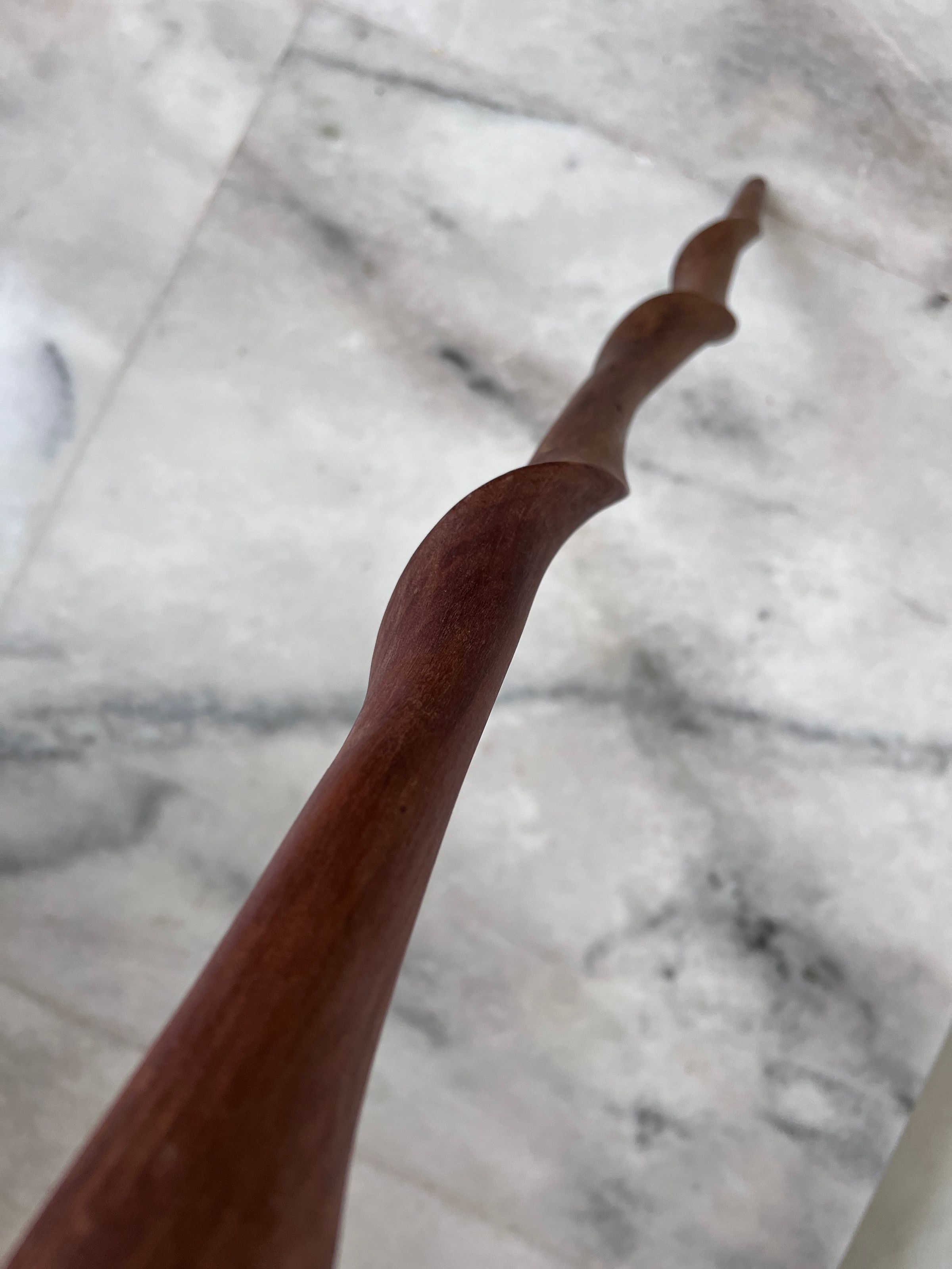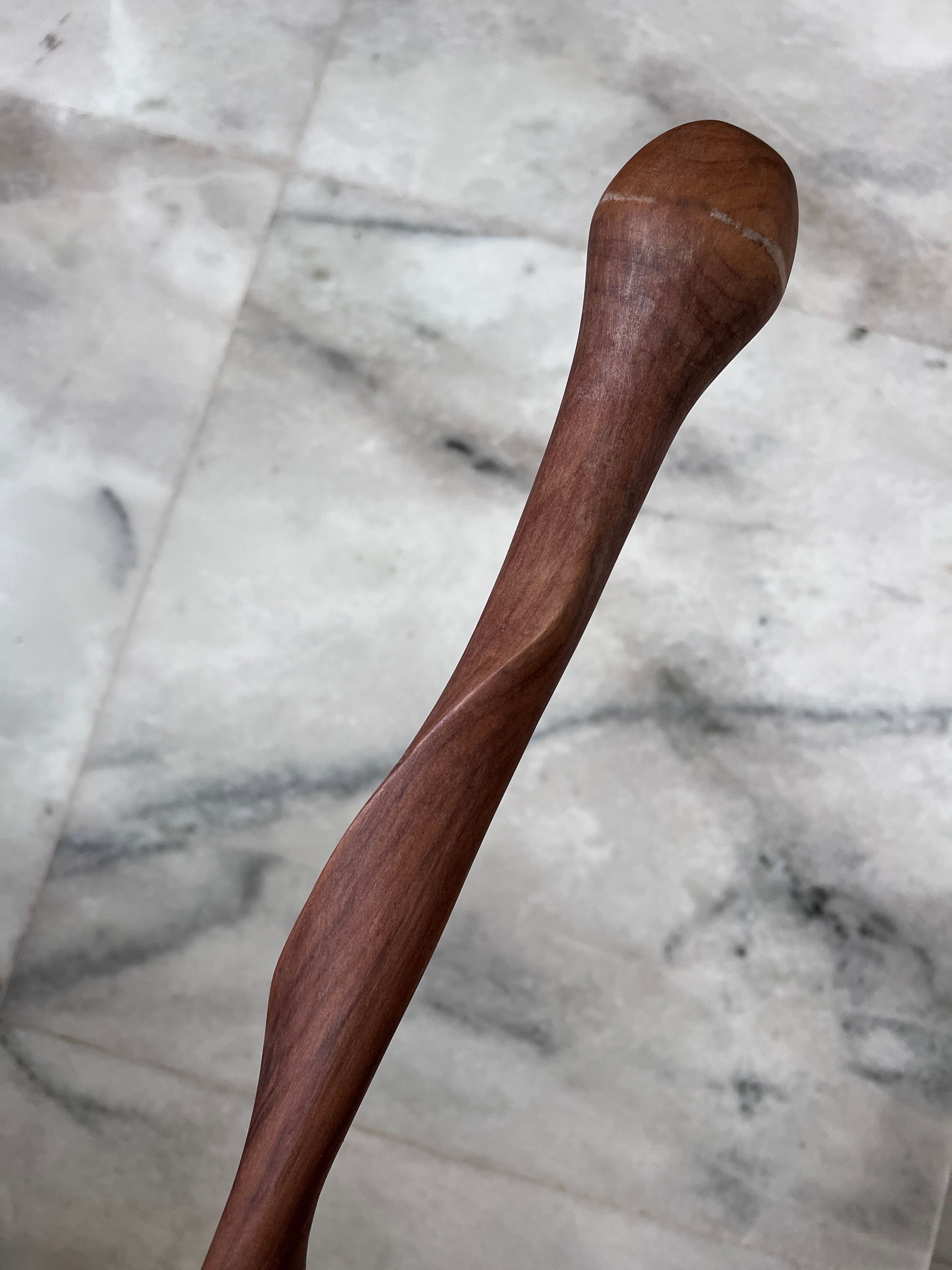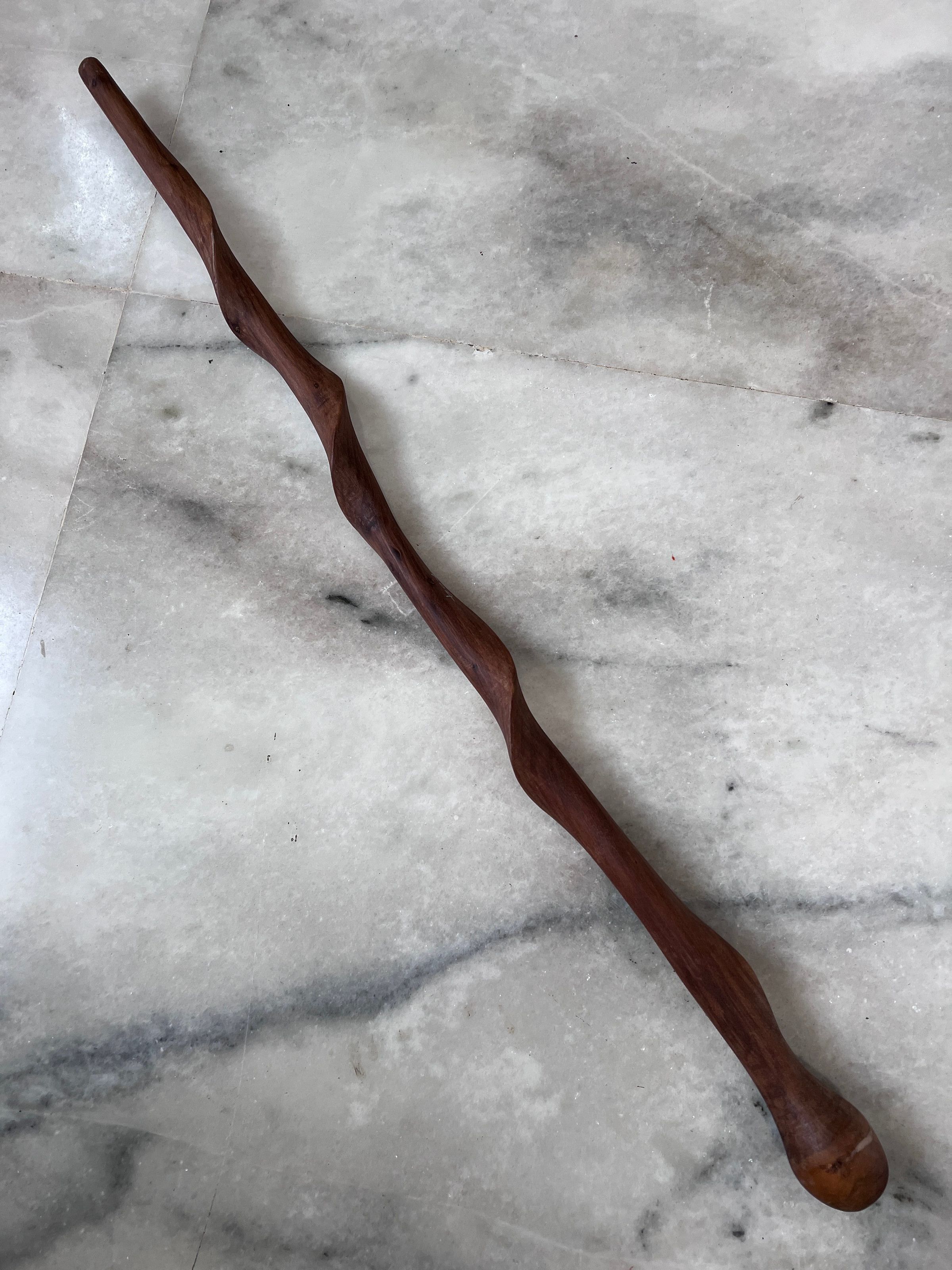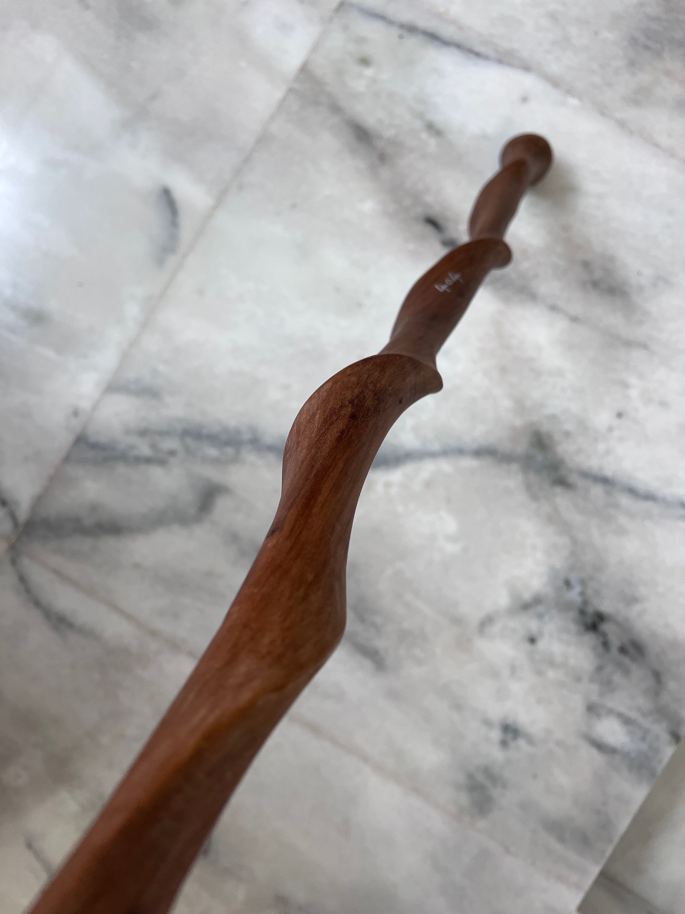 The image presents a beautifully crafted wooden walking stick lying on a marbled floor. The stick features a rich reddish-brown color with a polished surface that highlights its natural wood grain. Its design curves gently, creating a sinuous form that adds to its aesthetic appeal. The rounded handle at the top seems to be smoothly finished, ensuring a comfortable grip. The floor beneath it, characterized by light grey tones and organic veining, offers a stark, contrasting backdrop that emphasis the warm hues and organic shape of the wooden stick. This walking stick not only appears functional but also exudes a rustic elegance, making it both a practical tool and a piece of art.