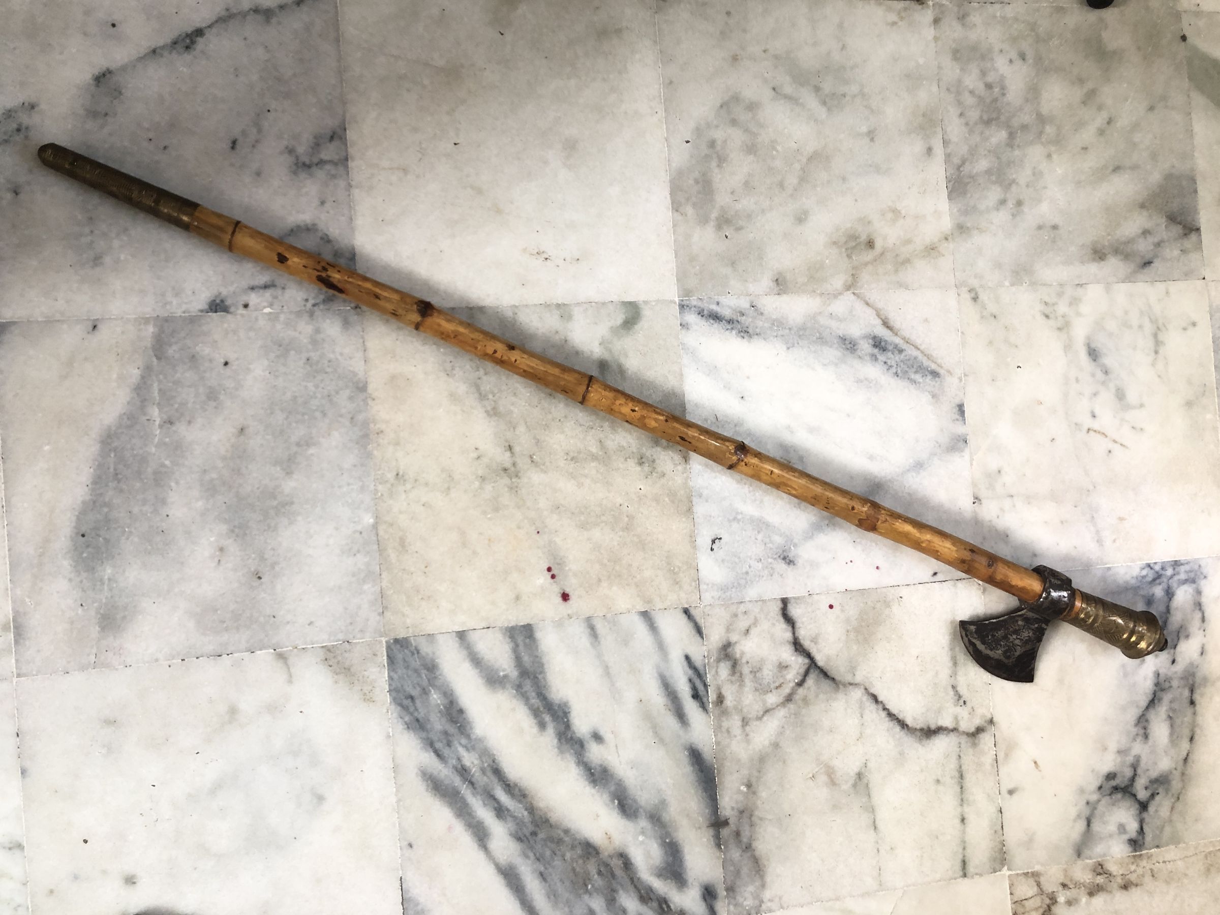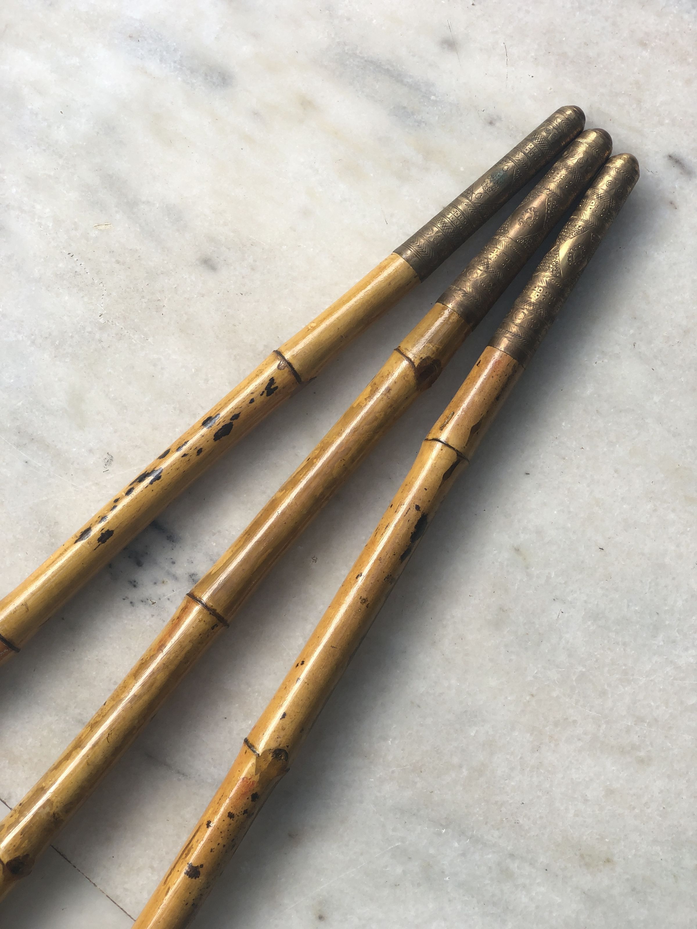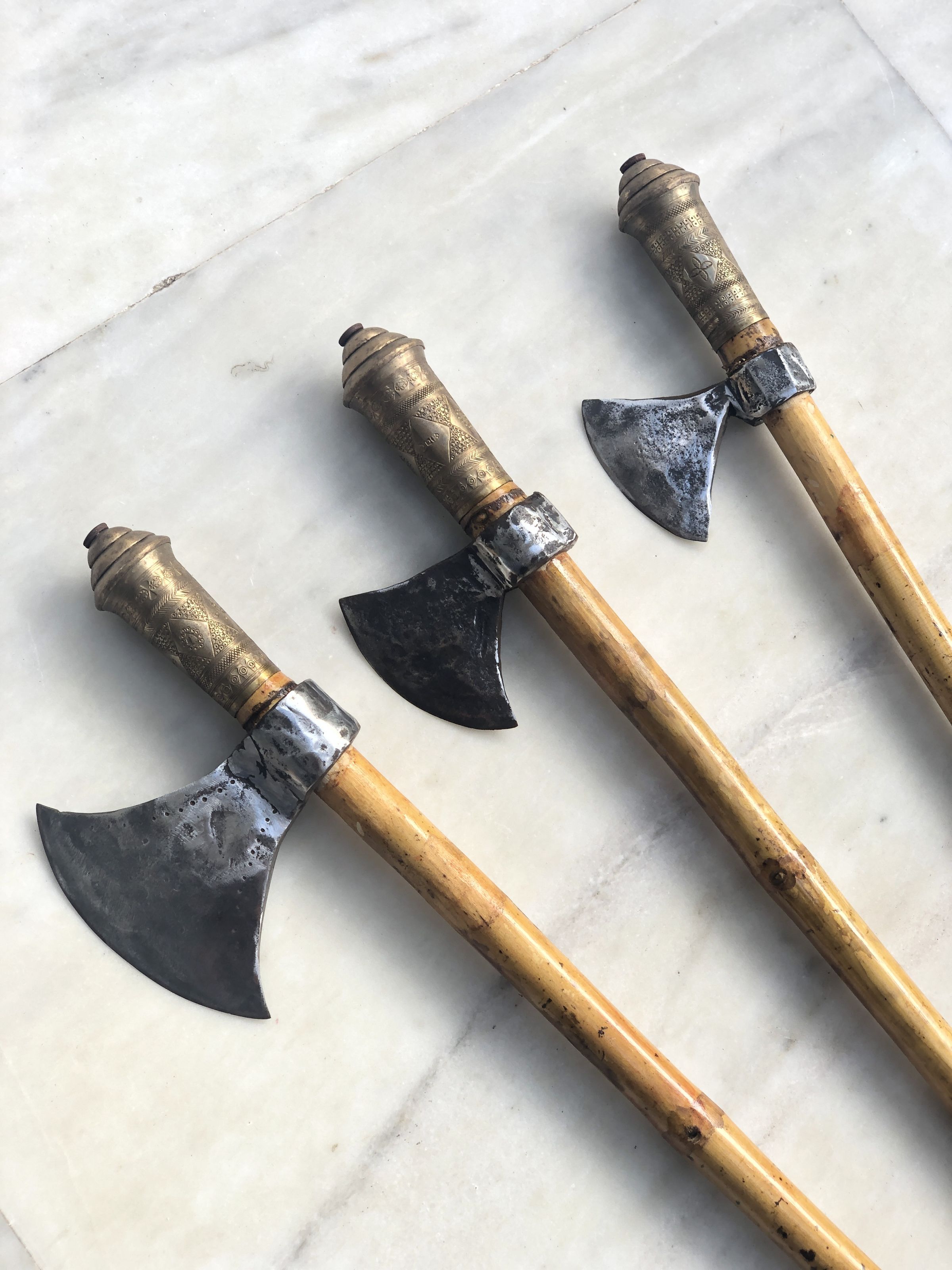 The image displays three traditional battle axes laid side by side on a white marble surface. Each axe features a curved blade with a rugged, somewhat tarnished finish, hinting at either age or frequent use. The handles are made of light-colored wood, showing signs of wear like minor scuffs and spots. Notably, the handles are adorned near the top with intricately designed metal cuffs, embellished with patterns and a star-like emblem, suggesting a blend of functionality and ceremonial use. The craftsmanship indicates a focus on both durability and aesthetic appeal, possibly denoting these axes as items of significance in their cultural context. The overall arrangement and backdrop give the presentation a clean and distinct appearance, emphasizing the axes' details and craftsmanship.