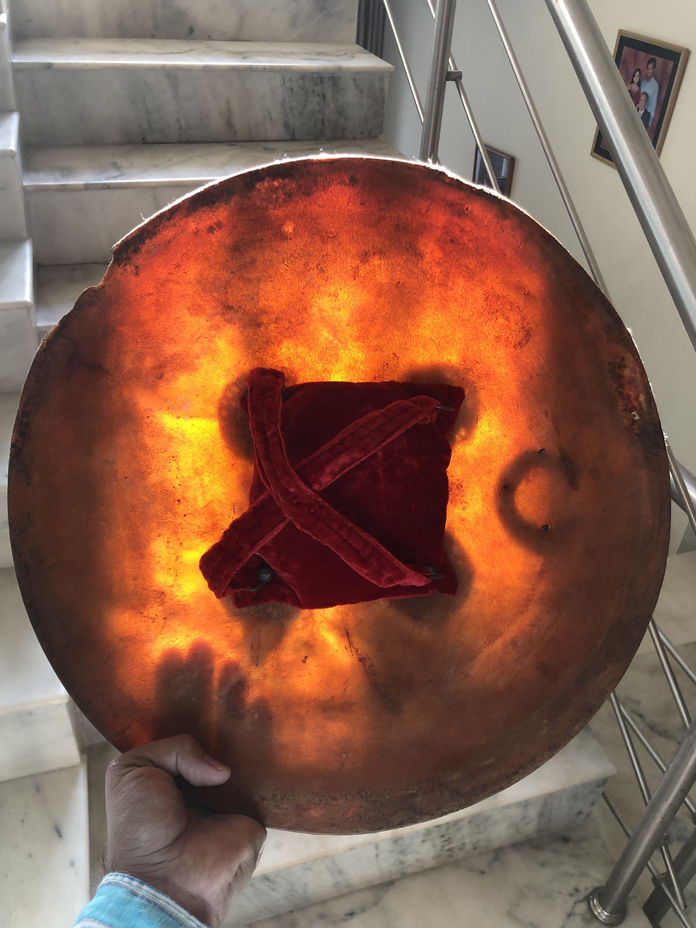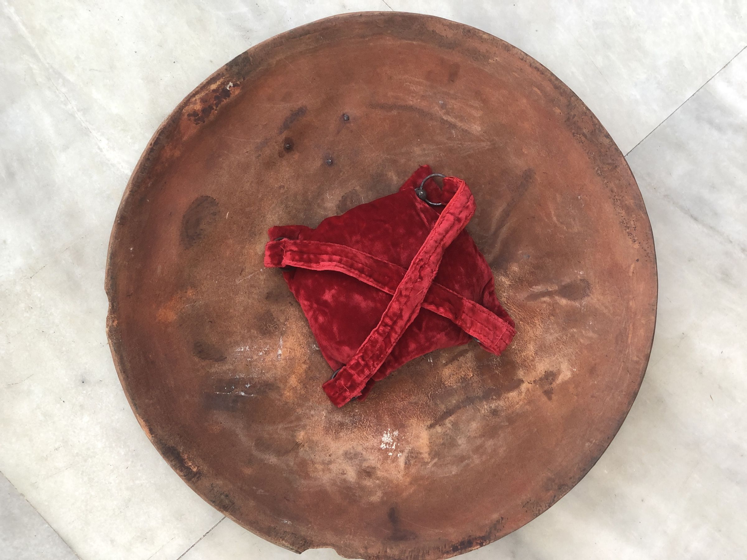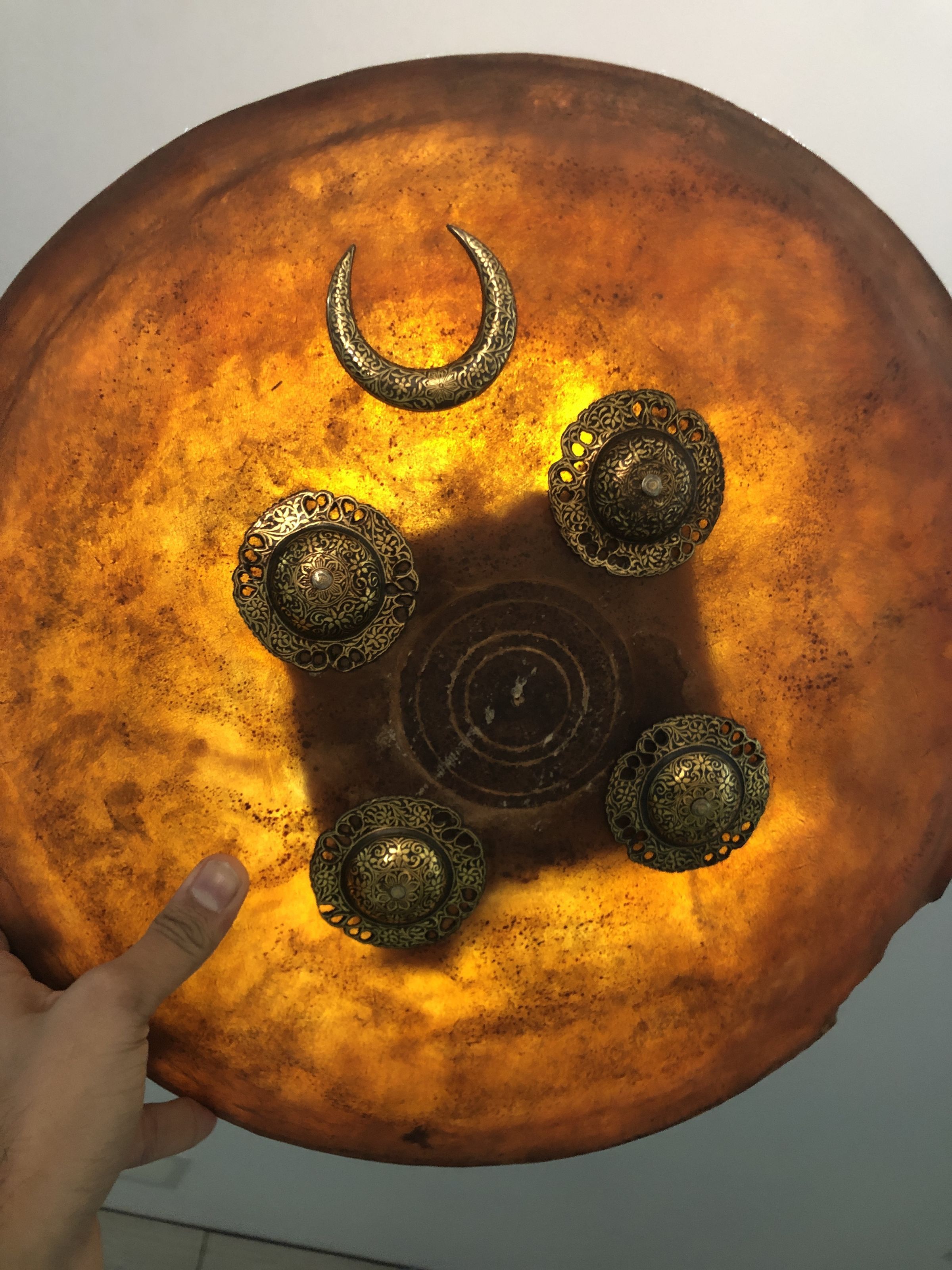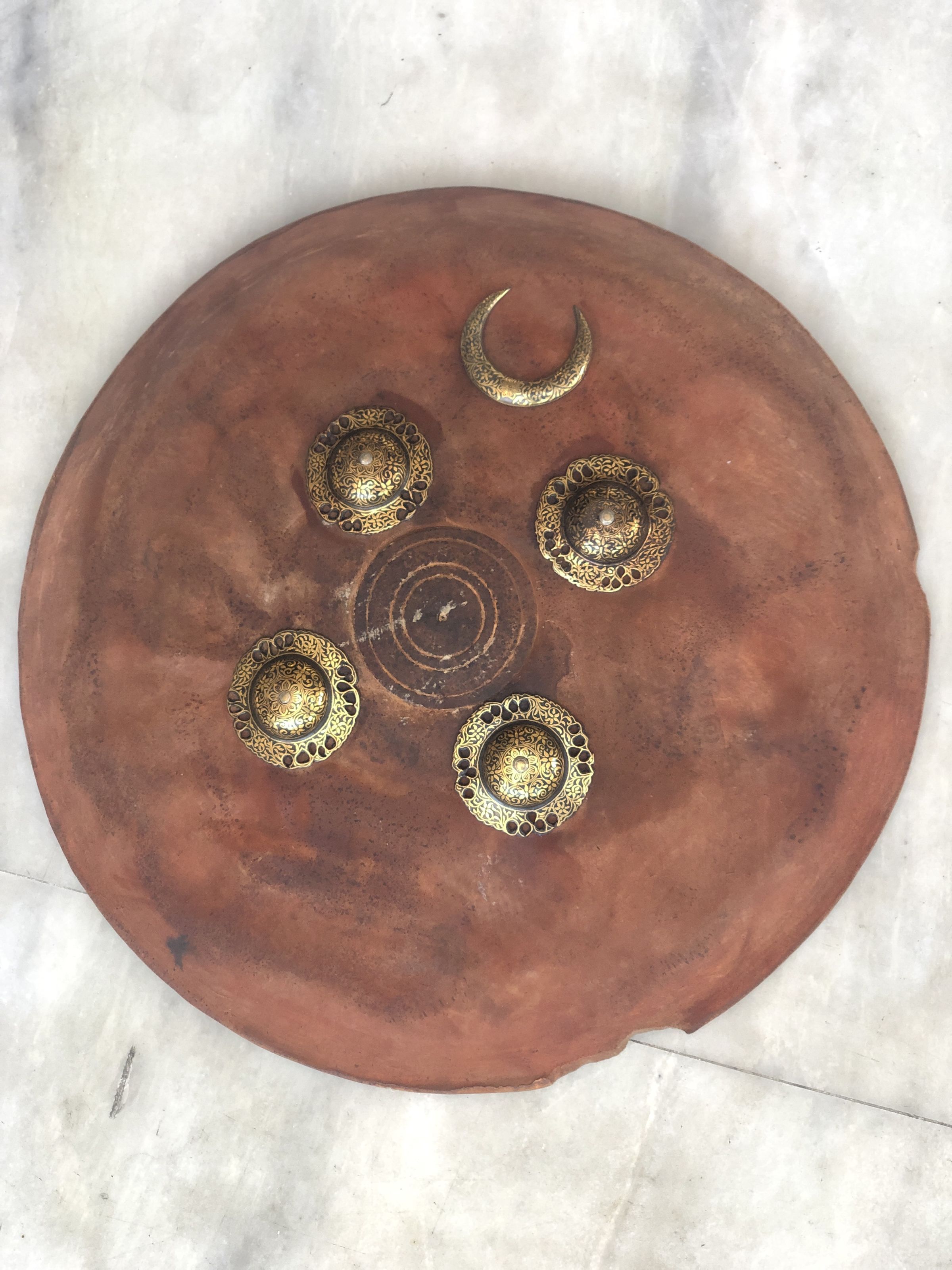 The image presents a round shield, presumed to be crafted from rhino hide, featuring an earthy reddish-brown tone with visible textures and weathering. It is embellished with ornate golden studs arranged symmetrically around the center. The studs include larger circular designs and a smaller crescent moon detail, all featuring intricate patterns and a gleaming finish. Central to the shield is a less decorated area, possibly serving as the focal point for grip or armament attachment. This distinctive shield combines practical defense qualities with decorative elements, reflecting both aesthetic appeal and historical utility.