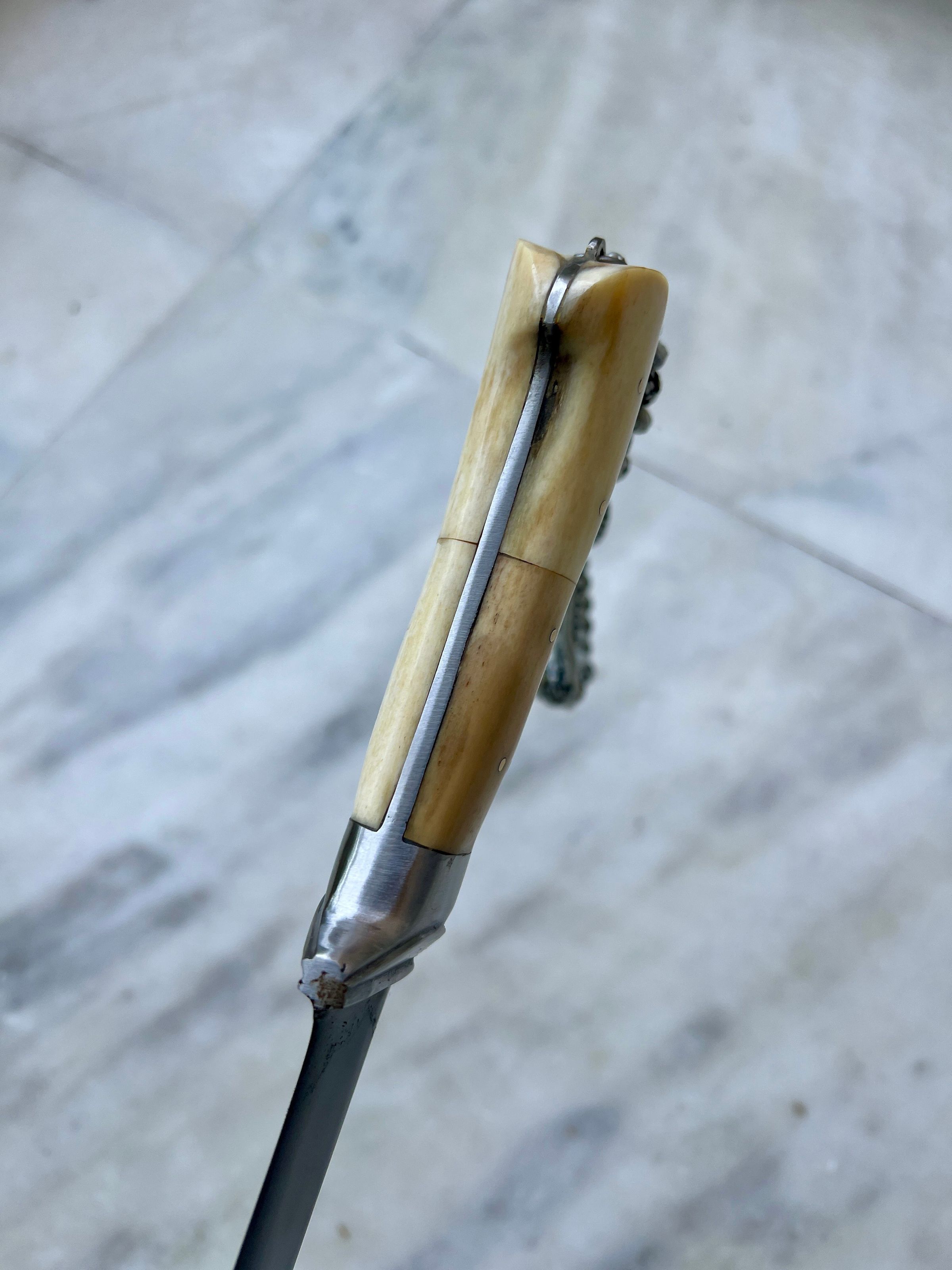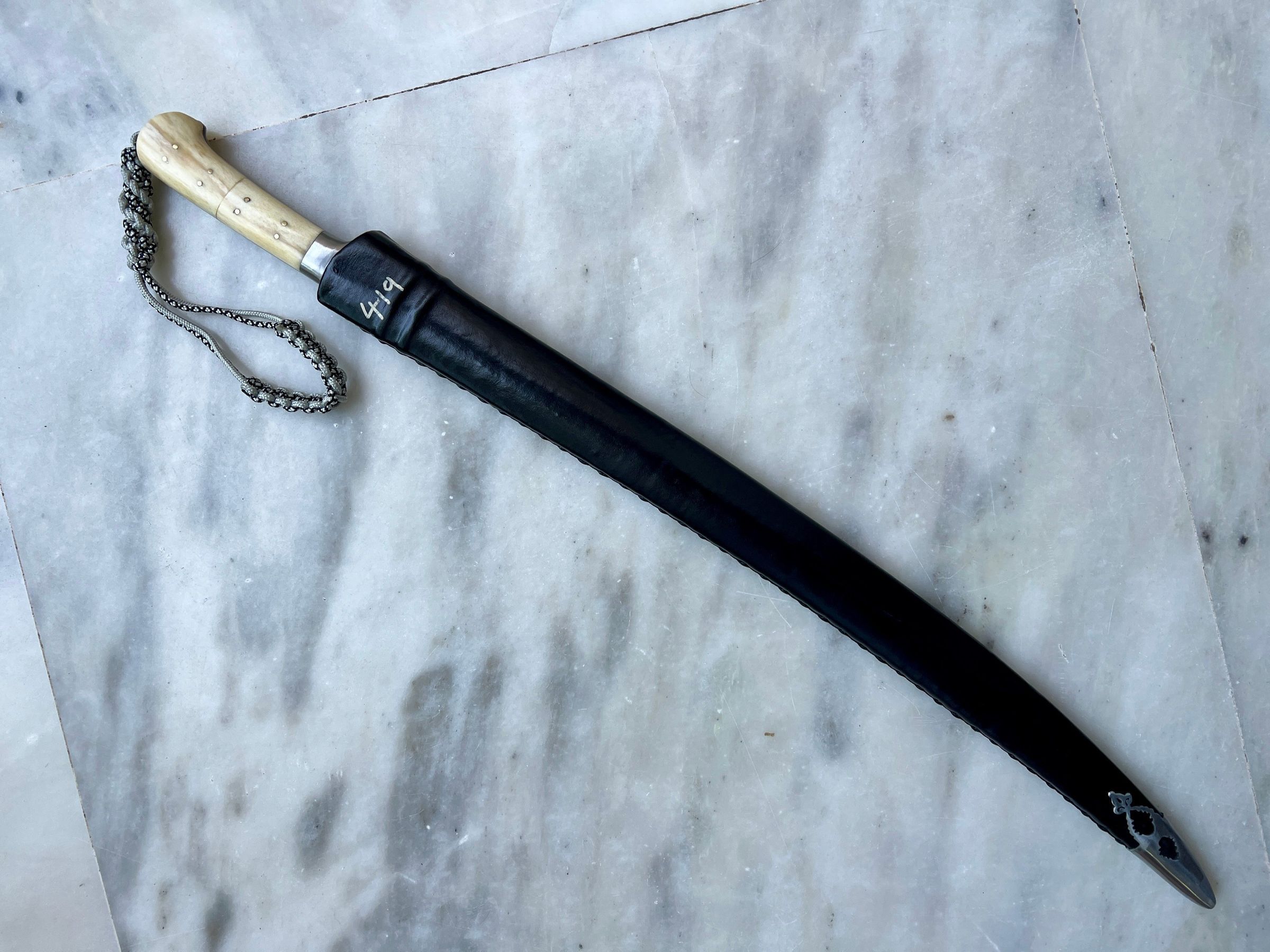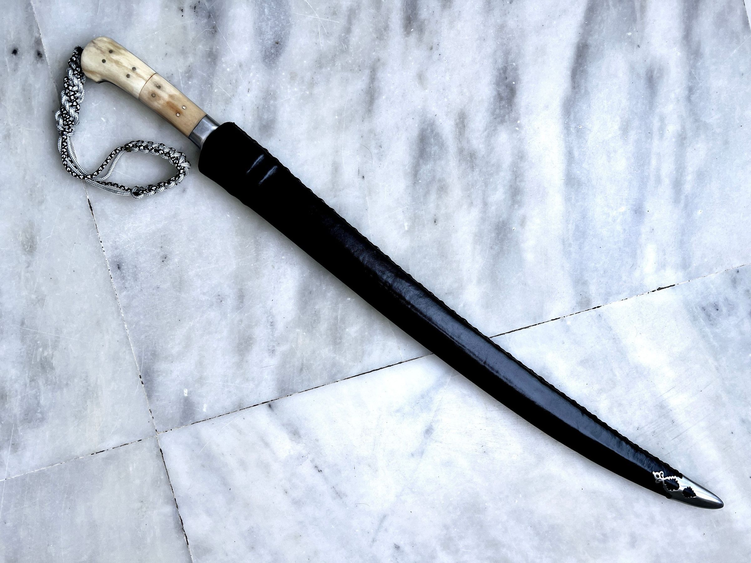 This particular one is part of a three piece set, it is the longest one, with moderately thick, lightly curved and chiseled point blade. Handle made in stag horn, with a ring to attach a lanyard. Blackened blade to prevent rusting and extremely sharp.Made/Created