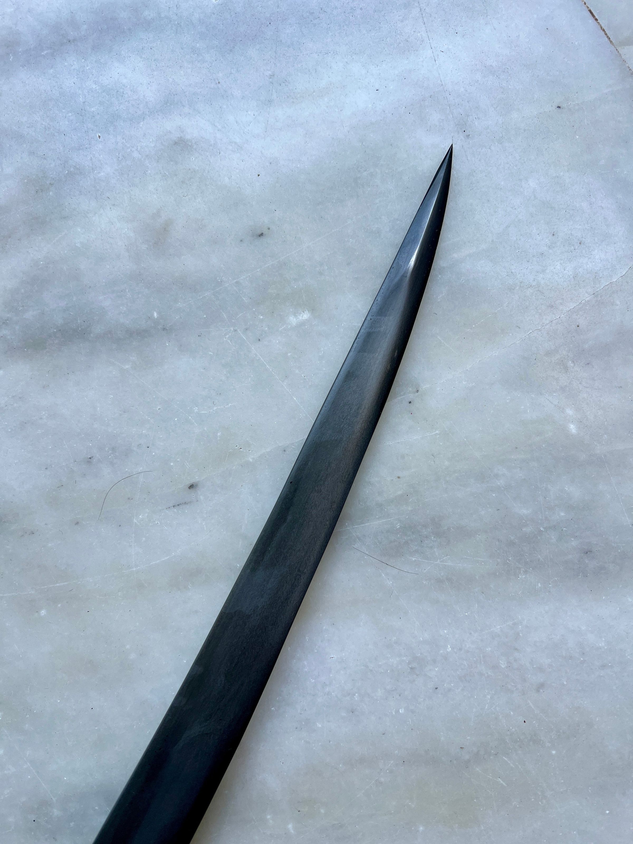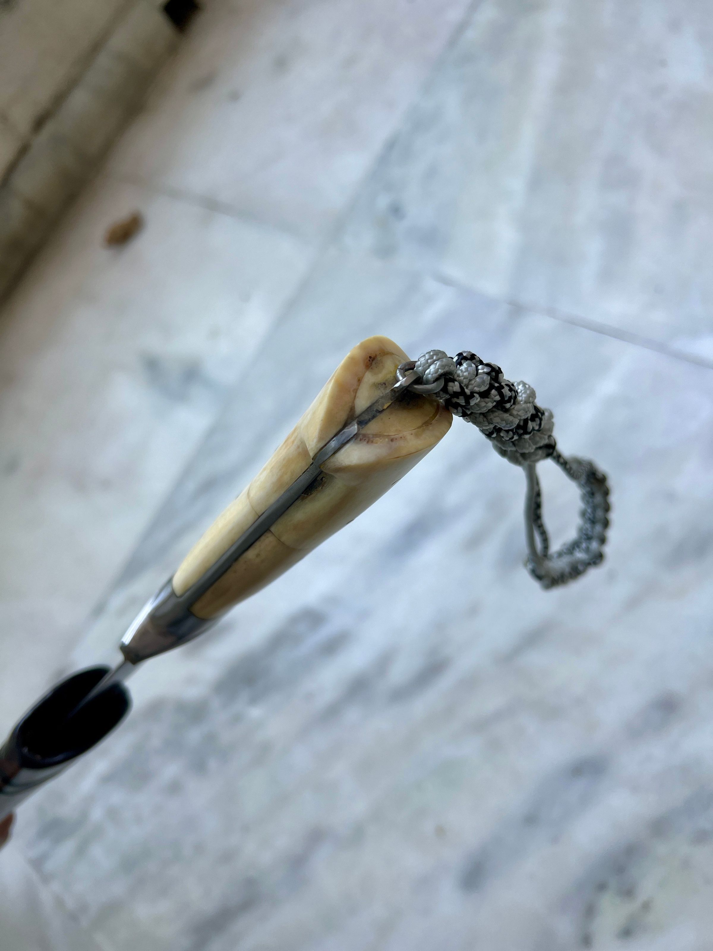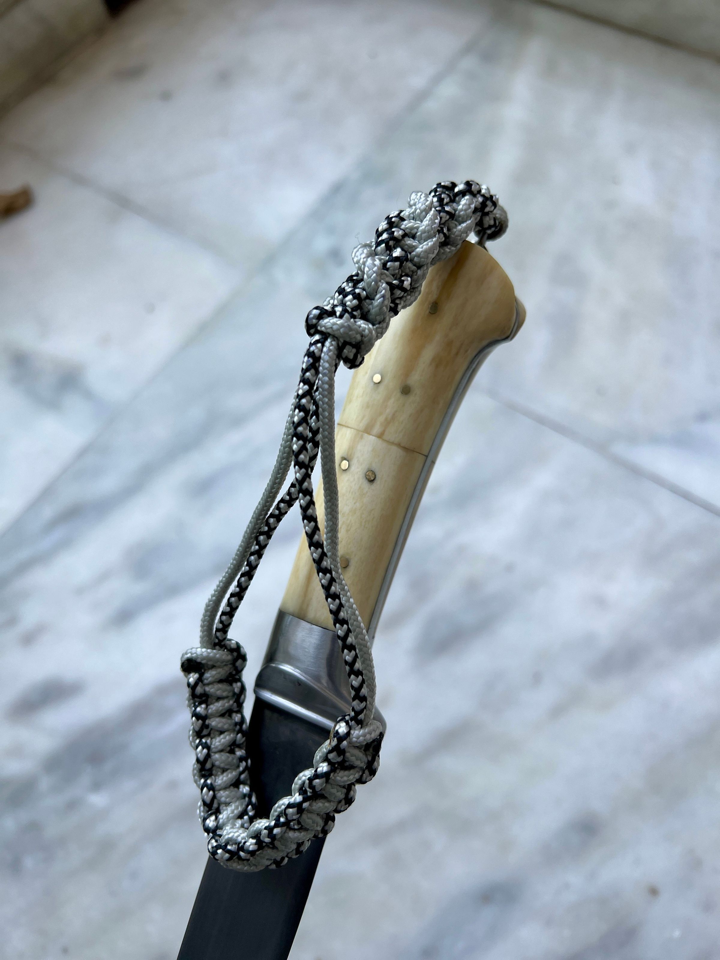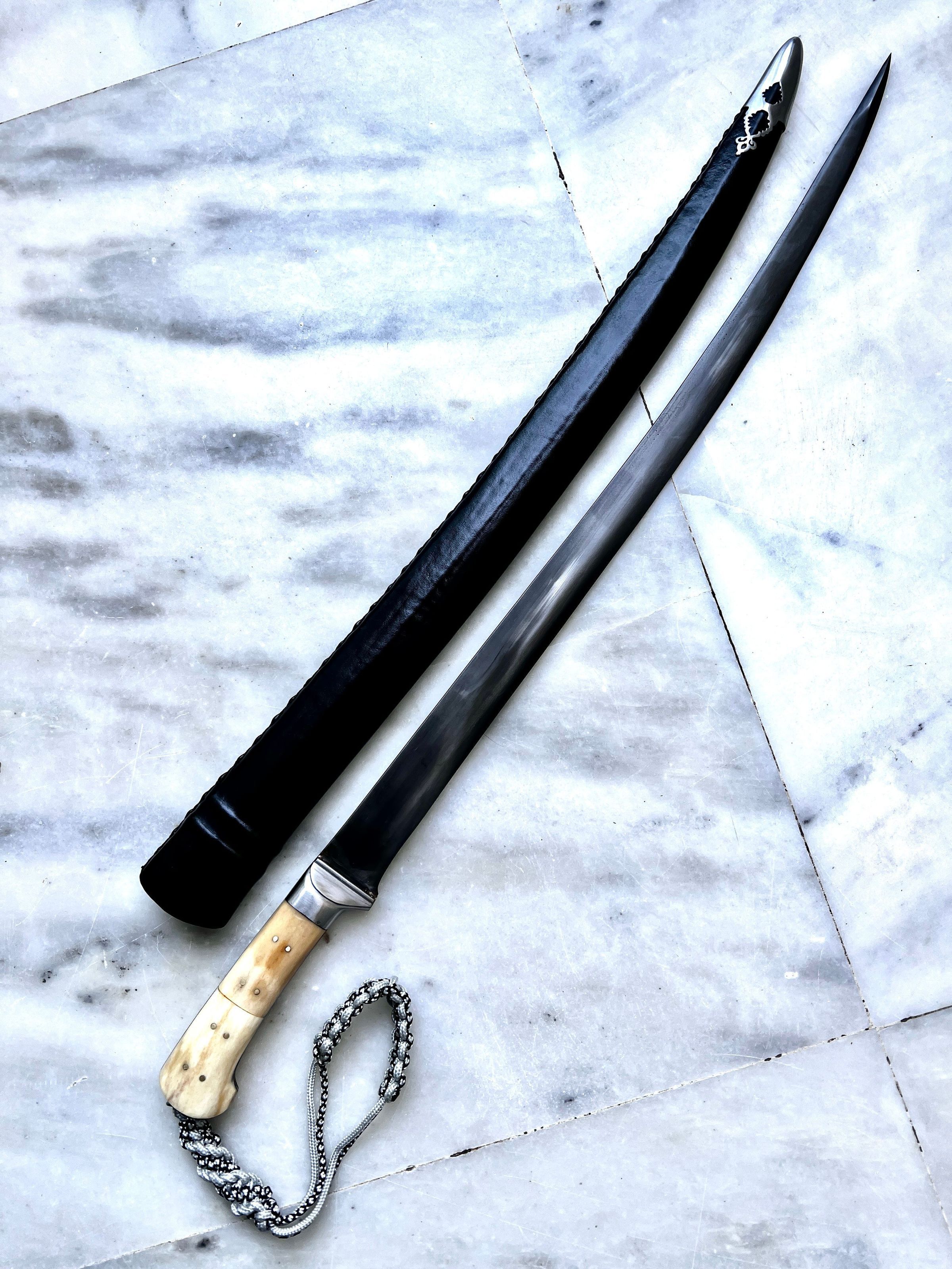 This particular one is part of a three piece set, it is the longest one, with moderately thick, lightly curved and chiseled point blade. Handle made in stag horn, with a ring to attach a lanyard. Blackened blade to prevent rusting and extremely sharp.Made/Created