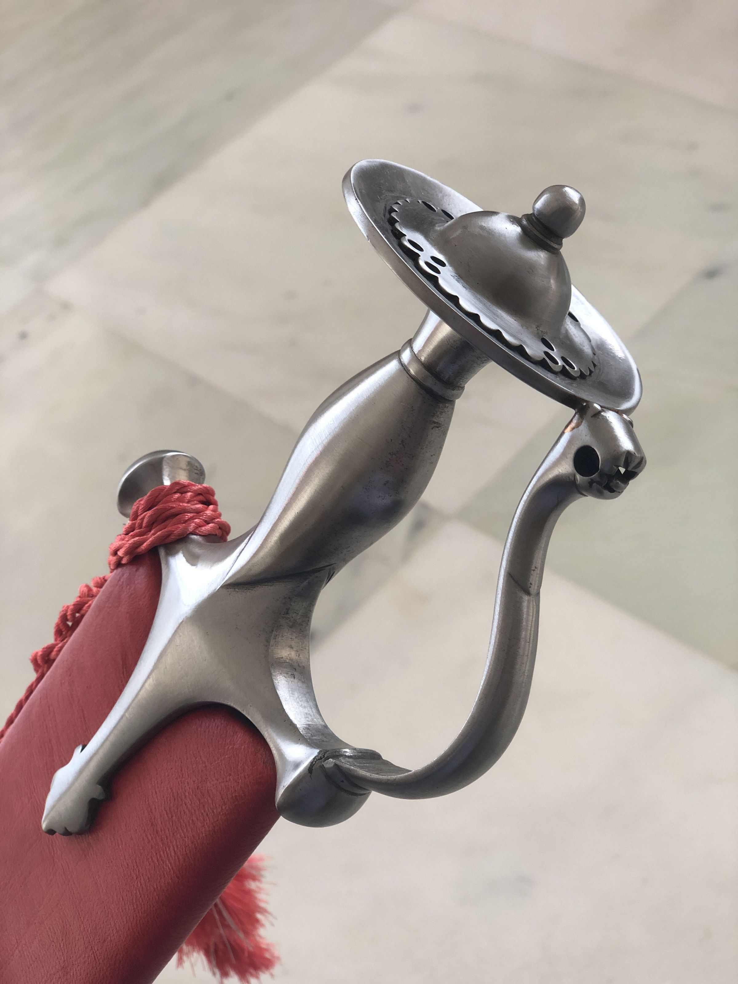 The image depicts a long, slender ceremonial sword lying on a marble floor. The sword's polished blade gleams with a mirrored finish, reflecting light and showing no signs of tarnish. It features an ornate handguard that is artistically crafted in a silver tone, with curves and openings that suggest a design both protective and decorative. This handguard connects to an elegant, possibly ergonomic handle, also metallic, hinting at a solid grip. Accompanying the sword is a scabbard enveloped in rich red fabric that appears slightly worn at its opening, giving a hint of frequent use or historical value. A decorative tassel with a braided rope accentuates the scabbard, adding a touch of ceremonial grandeur. This setup connotes a mix of functionality and ceremonial significance, possibly denoting the sword's use in historical or ritual contexts, suggesting not just a weapon, but a symbol of power and status. The marble backdrop provides a clean, stark contrast to the vivid red and