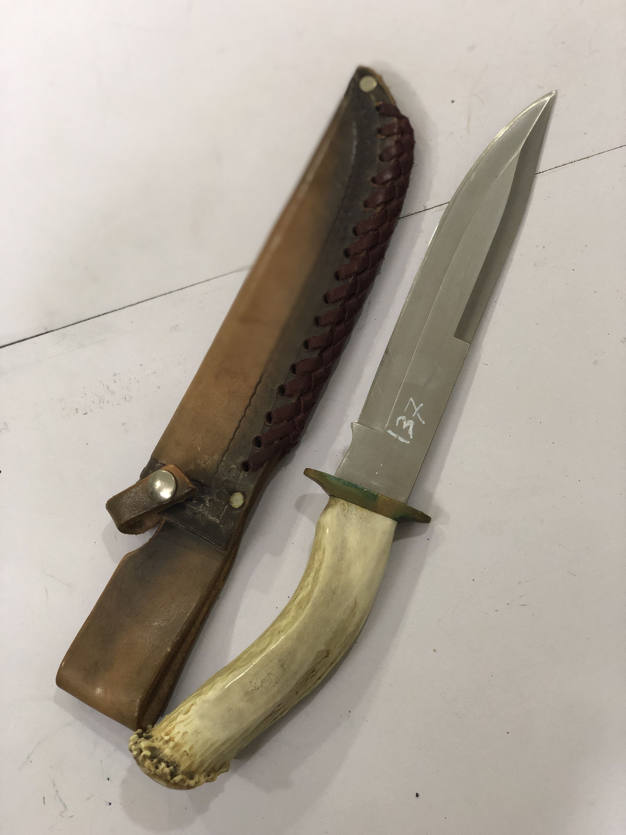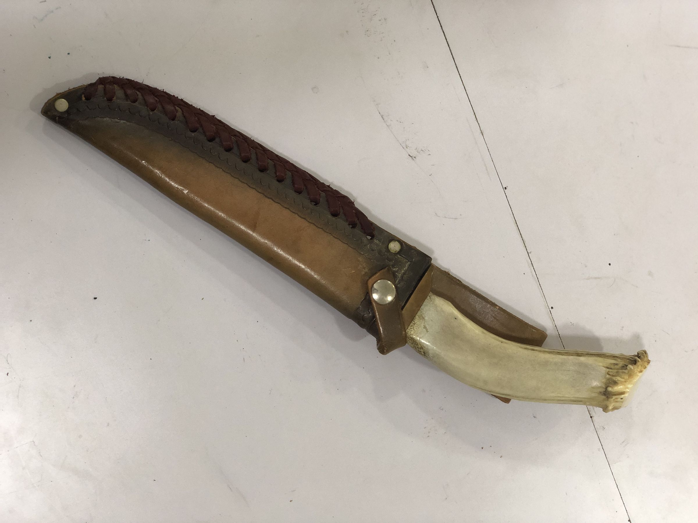 The image displays a traditional knife with a distinct, slightly curved handle possibly crafted from bone or ivory, alongside its decorated brown leather sheath featuring a braided edge. The knife’s blade is straight and robust, marked with a cross symbol near the handle, which is adorned with a green and metal bolster adding to its rustic and durable appearance. The knife, partly exposed from its sheath and placed on a plain background, showcases a combination of utility and craftsmanship that speaks of its possible cultural or historical significance.