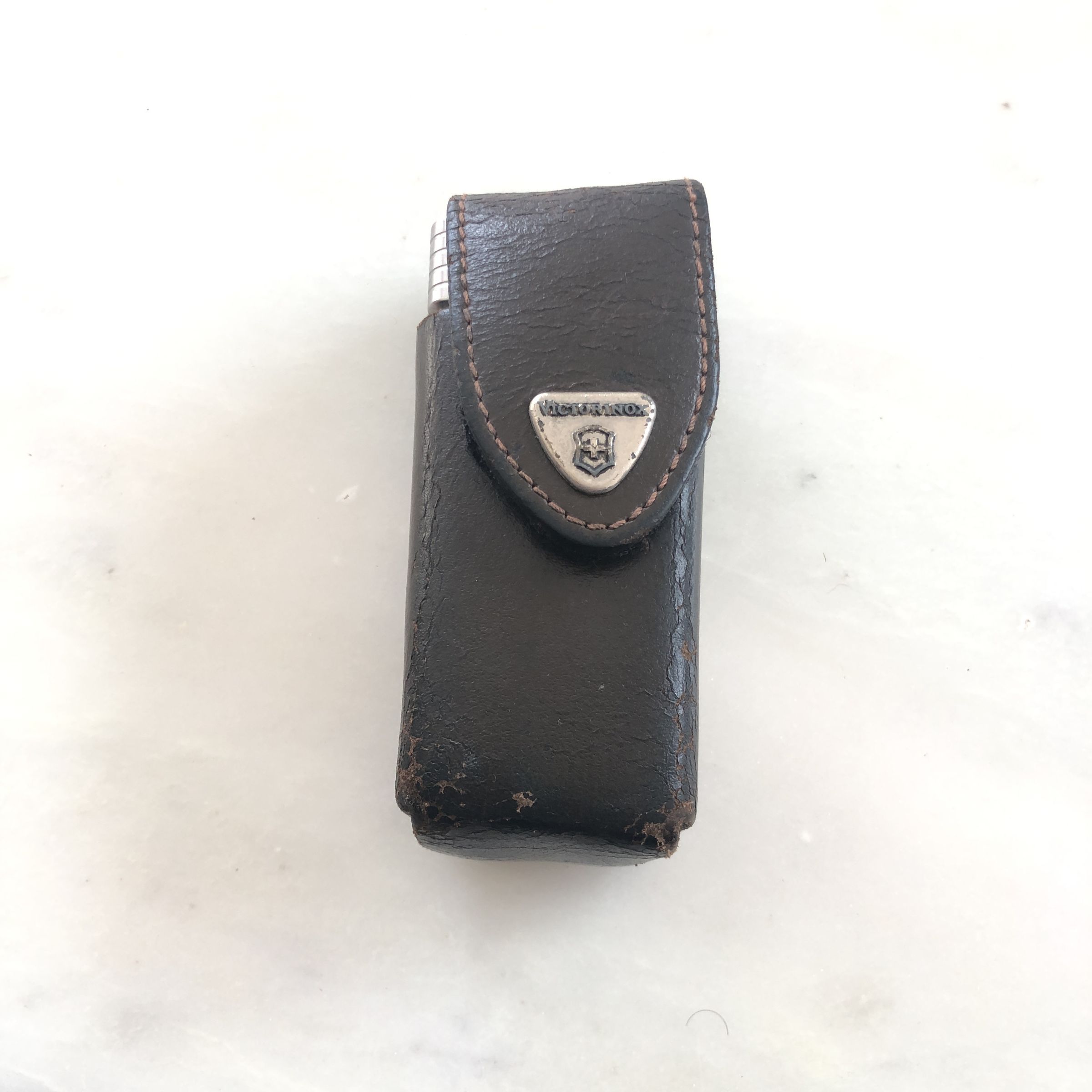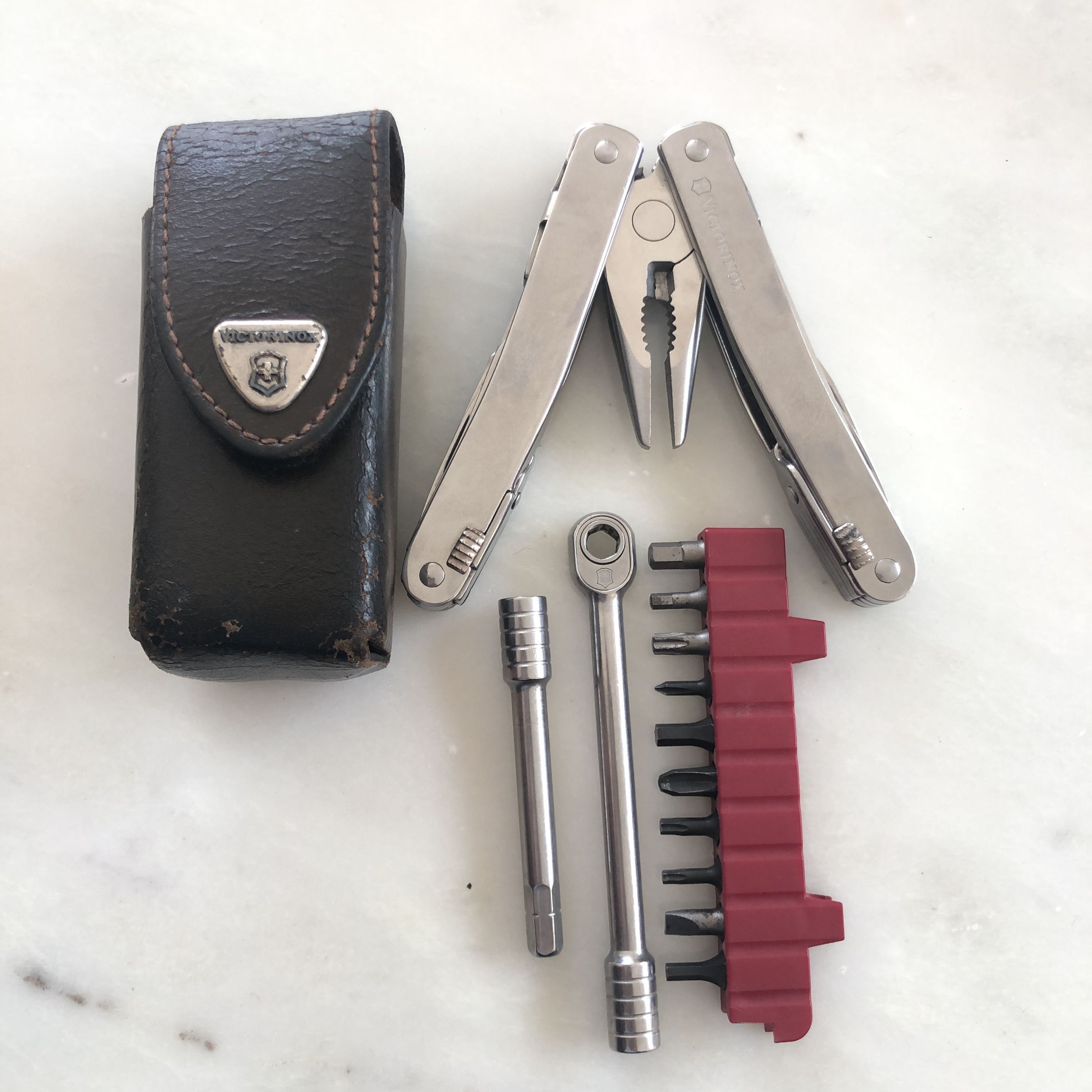 The image exhibits a collection of tools and accessories on a marble surface, featuring a worn brown leather case with a metallic emblem, alongside an open multi-tool with stainless steel pliers and various other tools including a socket wrench, an extension bar, and a red plastic holder containing numerous hex keys arrayed neatly.