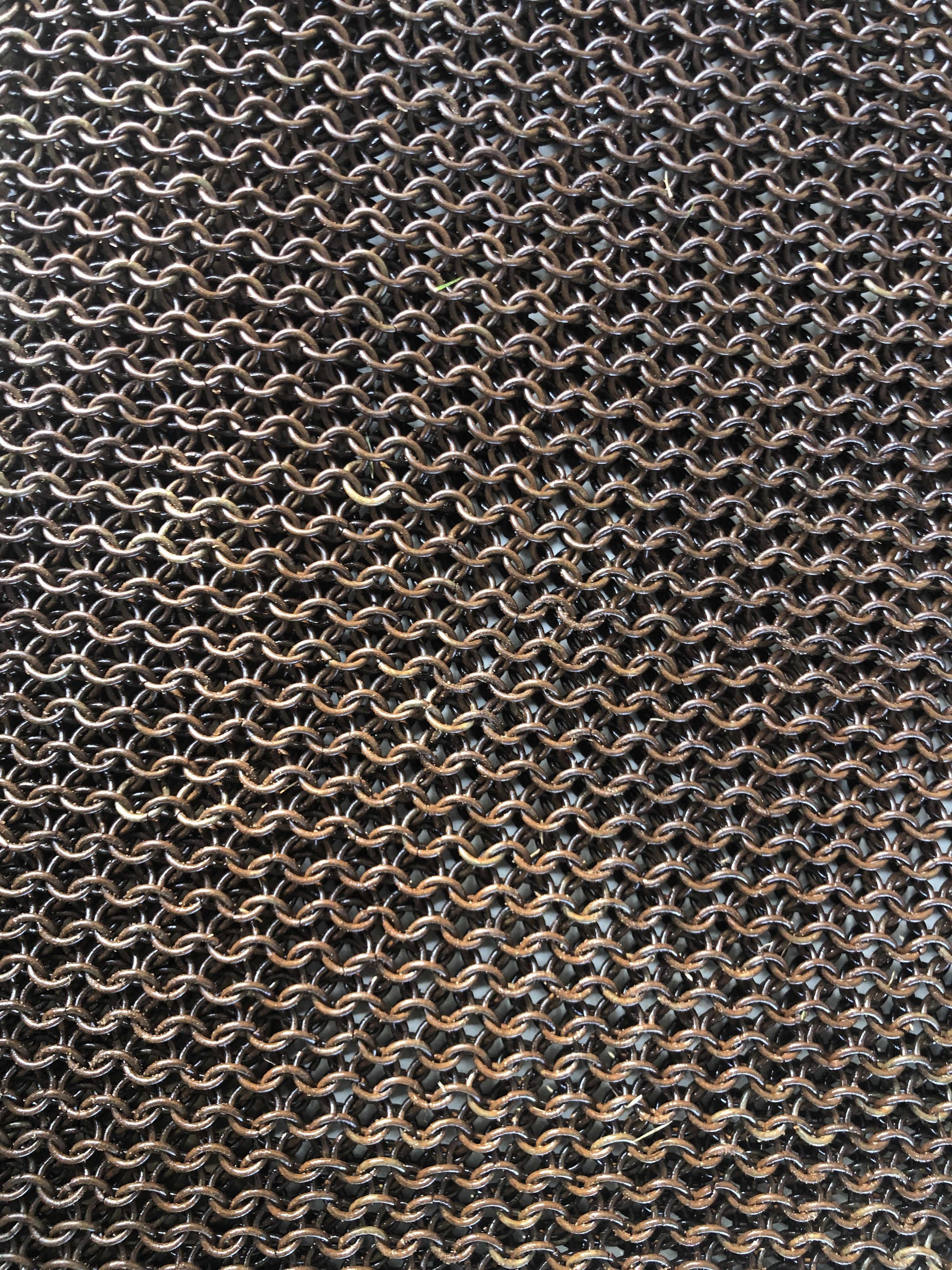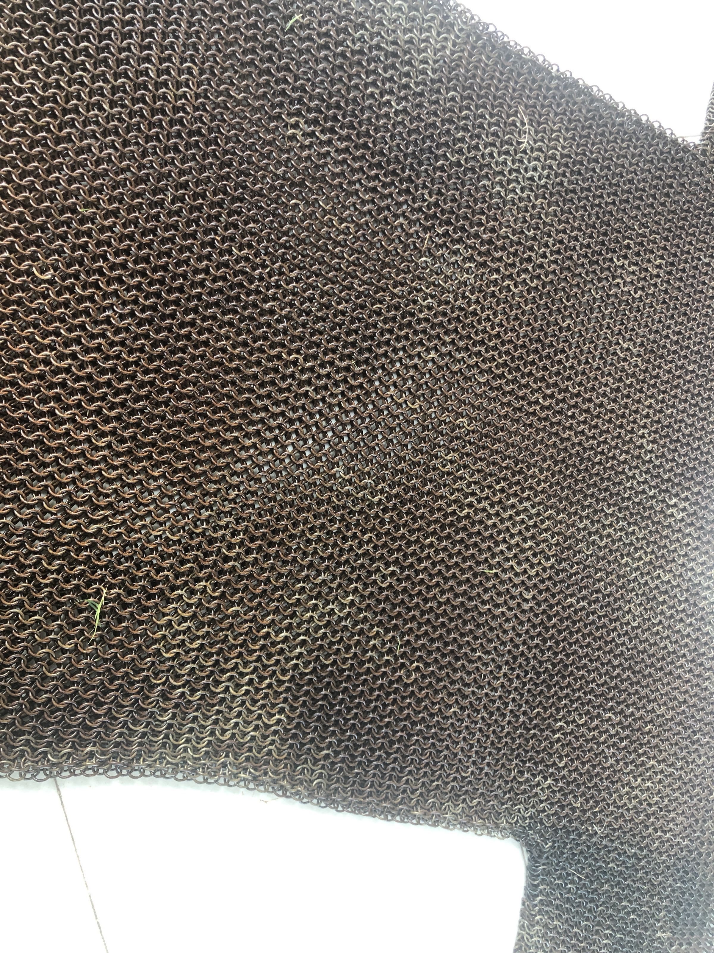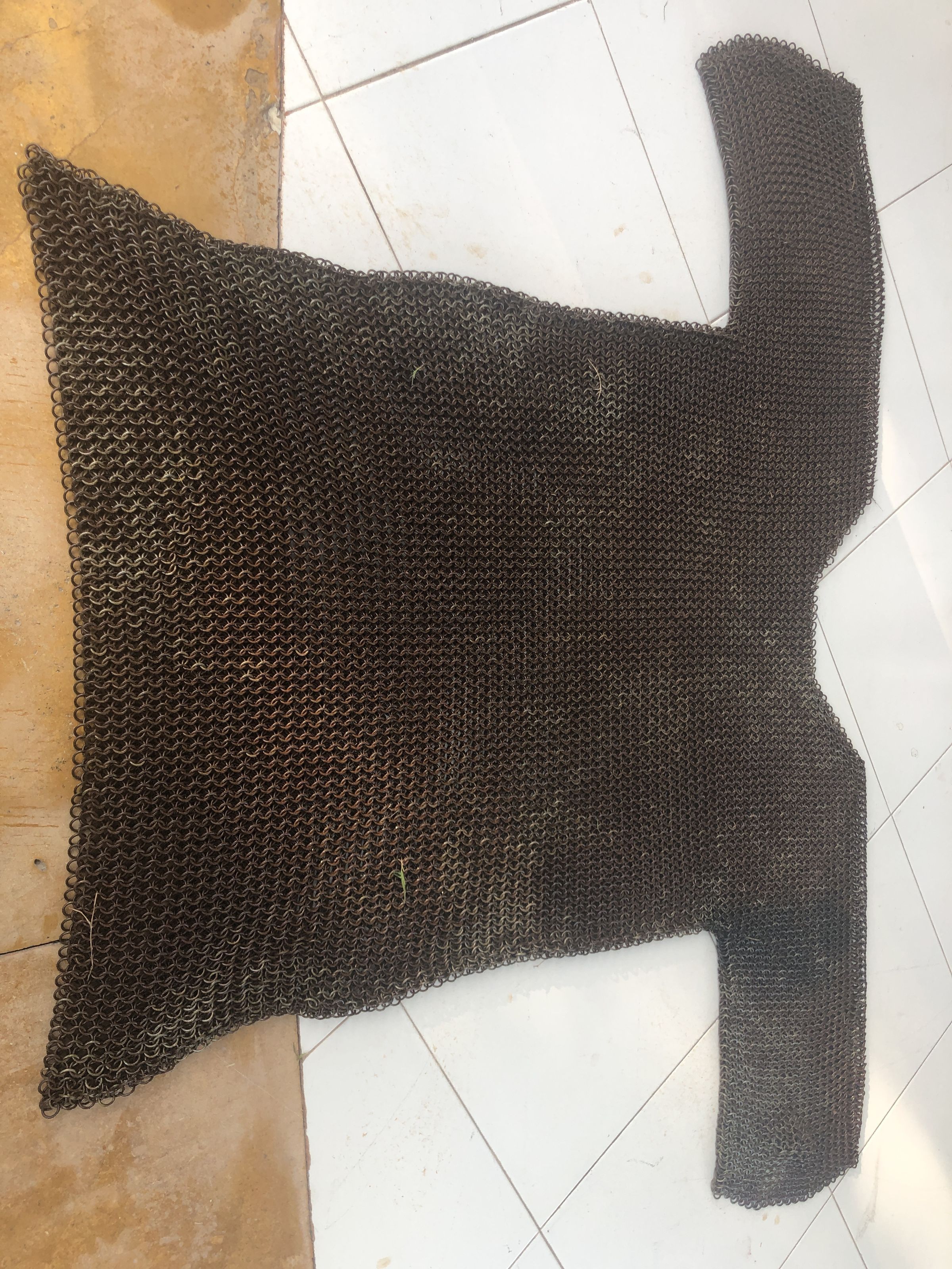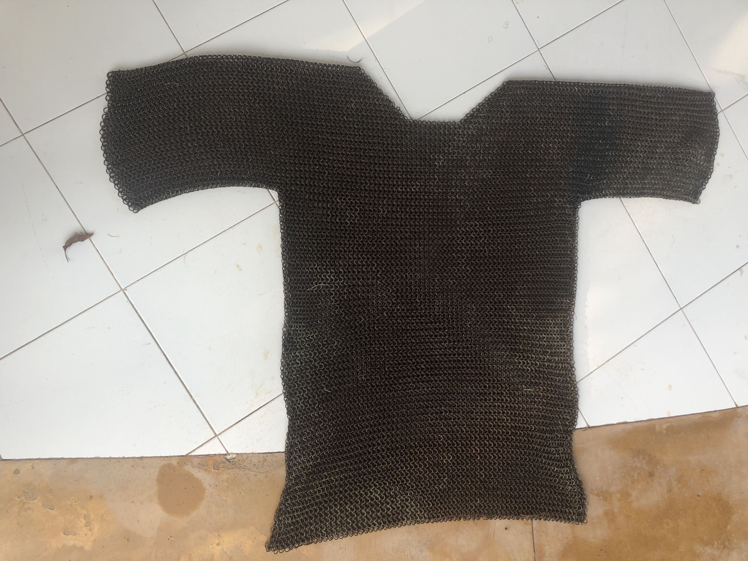 The image depicts a chainmail shirt laid flat on a tiled floor, showing its unique, densely interlinked ring structure that covers the torso and arms. The metallic gray of the chainmail contrasts with the light colors of the tiles, which are partially stained and worn. Visible near the left sleeve of the chainmail is a small, dark brown object, possibly organic debris, adding a sense of imperfection to the scene. The stark, practical structure of the garment suggests it is designed for protection, reflecting a craftsmanship rooted in historical armor-making techniques. The overall cleanliness and simplicity of the setting focus attention on the texture and pattern of the chainmail, highlighting its intricate construction and the durability typically associated with such materials.