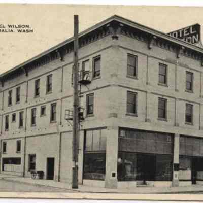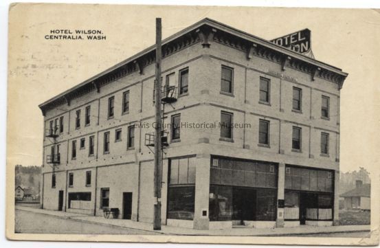 "Black & White postcard of the Wilson Hotel, Centralia, WA. Plate on front of the building reads, "Robinson brothers, 1914." "Lexicon
