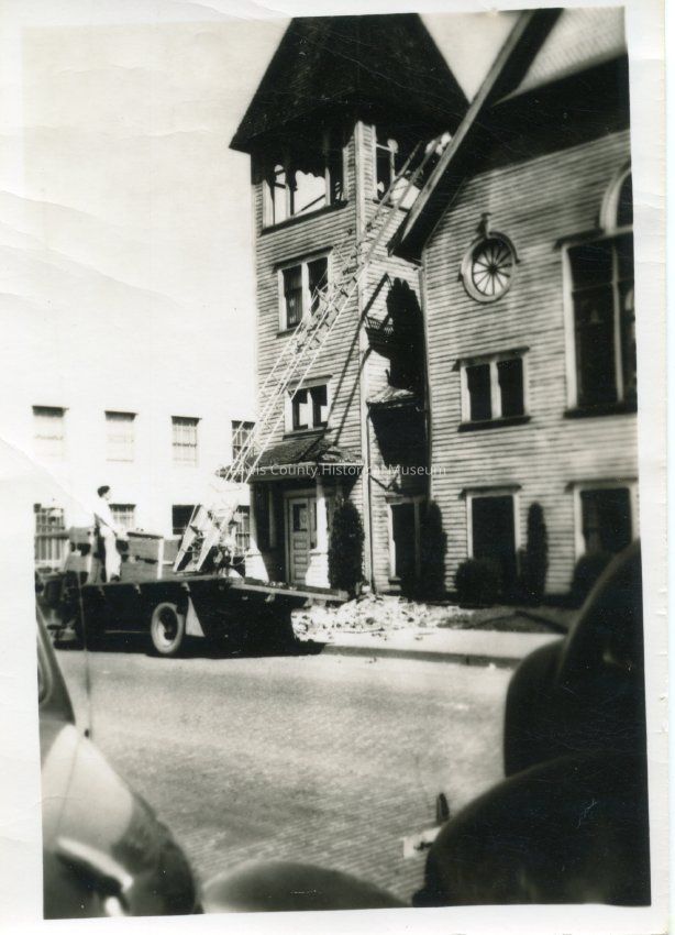 First Methodist Church at Pine and Pearl in Centralia, WA showing 1949 earthquake damage.Collection