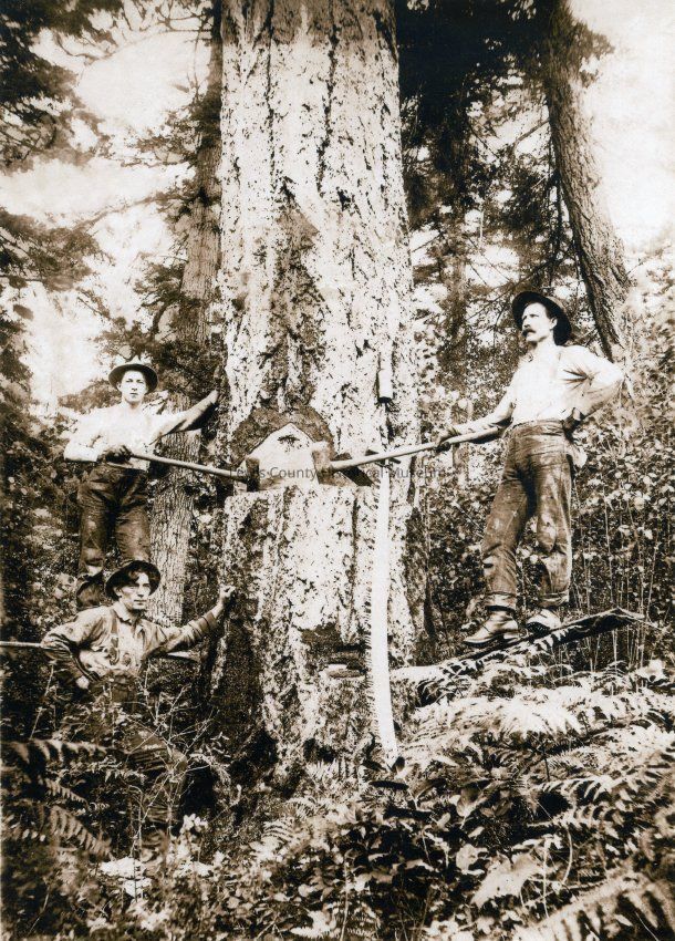 Joe and Abe Garrison with axes standing on springboards. Archie Davis leaning on tree, 1907. b&w 2011.45Lexicon