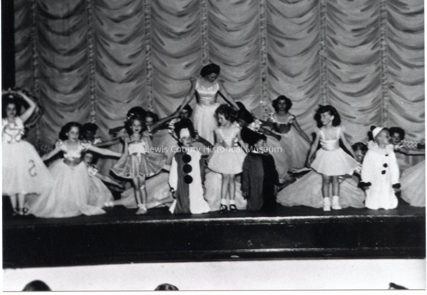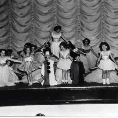 From book project of History of Centralia Saint Mary's Catholic Church, 1910-86. This photo shows St. Mary's sudents dancing on May Day, 1951 on the stage at Centralia's Liberty Theatre. Have negative.