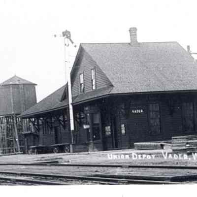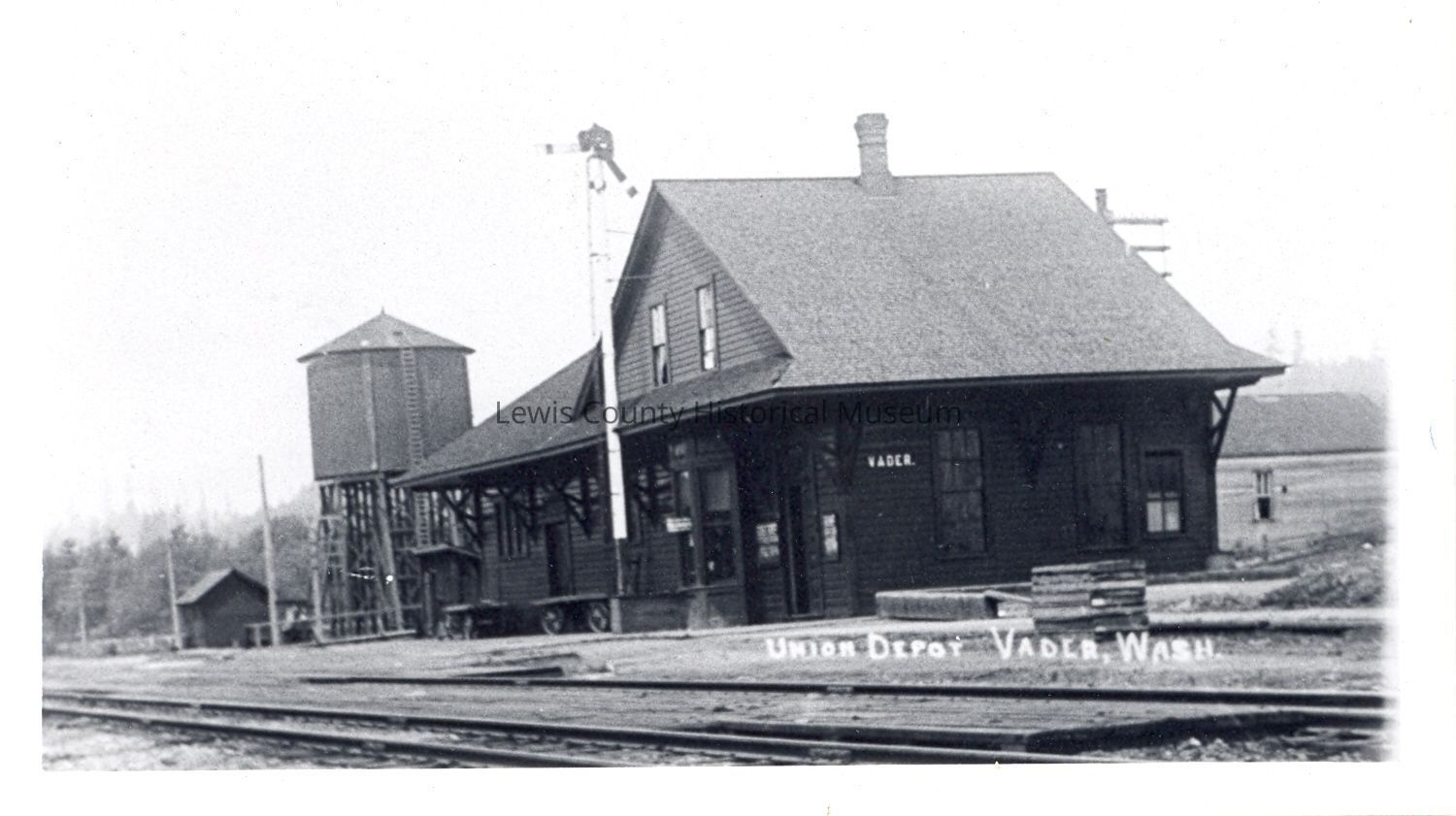 Copy of PC117. Union Depot at Vader, WA. Shows water tower and baggage carts. Have slide. Have Negative.