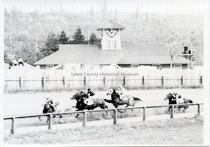 Southwest Washington Fair 1939. Five horses and jockeys racing on the eastside of the track. In the background is the 8 foot fence around the race track, the floral building with cupola on top.Collection