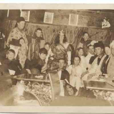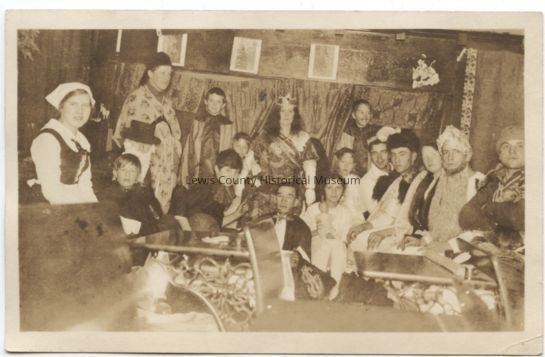 Black & White postcard - Lindberg pupils are dressed up for a school play. Andrew Peterson is on right. Photo circa 1910.Lexicon