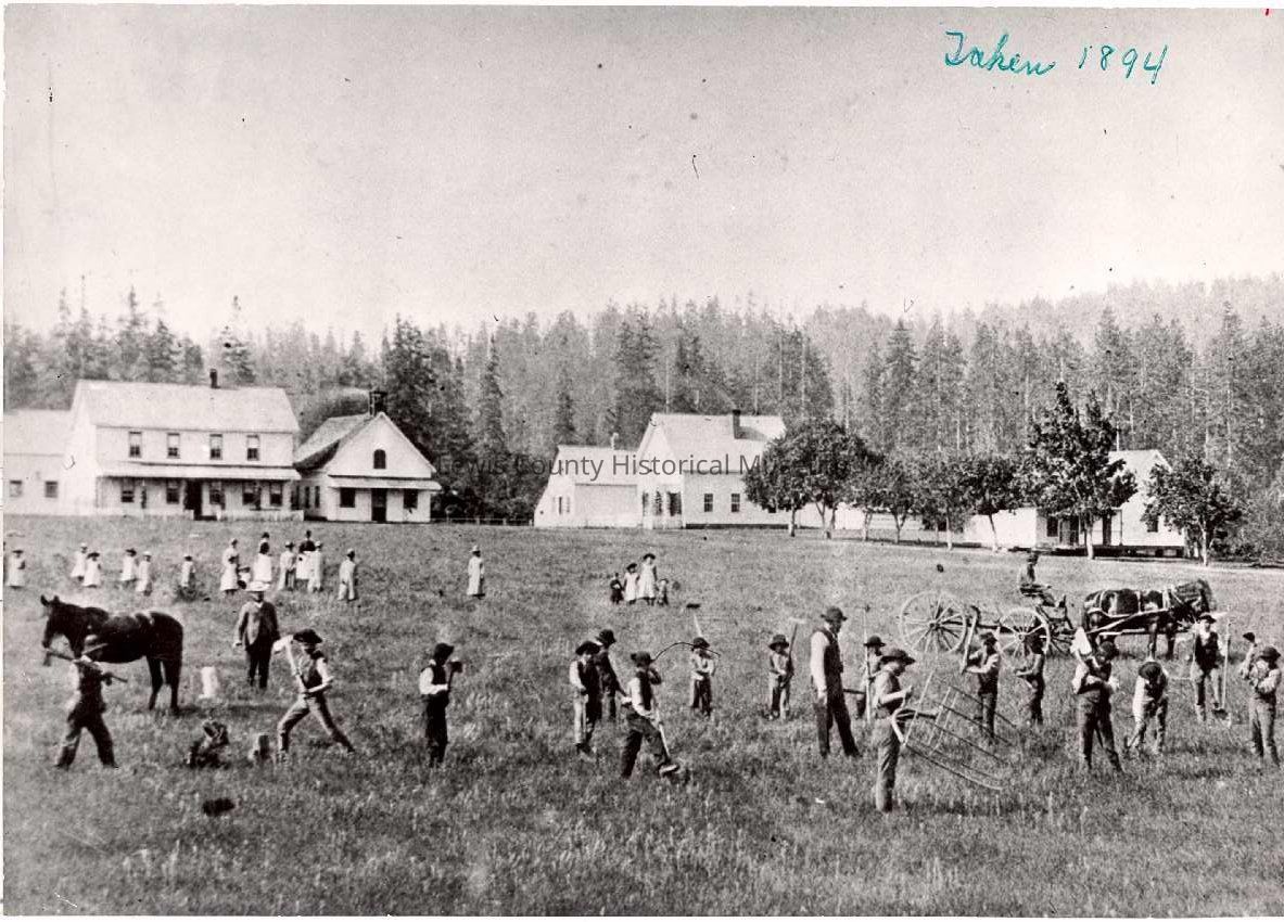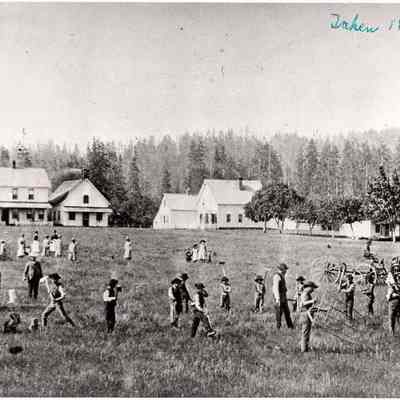 Chehalis Indian Reservation School. Image shows students in the foreground and buildings in the background. Buildings identified by John Benn as: far left, laundry, boarding school, students slept on the second floor; school; older students attended school (Jr.High and High School); houses, Where matrons and employees lived; far right was the infirmary and the Doctor's house. There was also a blacksmith shop by the river not shown in the photograph. ca.1889. Copy from the Chehalis Indian book. Have negative.Lexicon