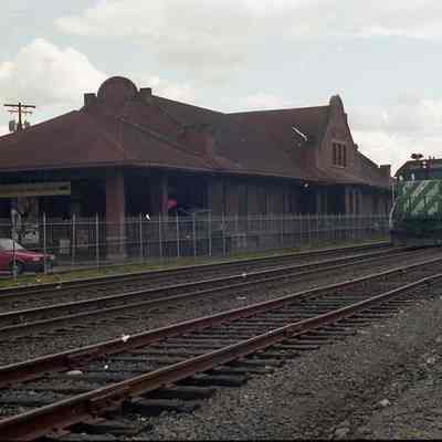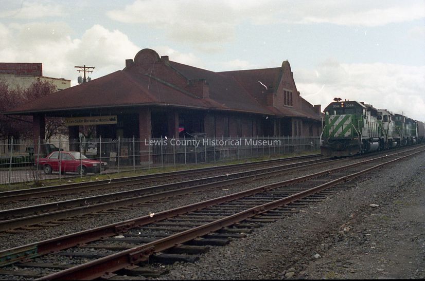 Exterior view of Lewis County Historical Museum with BN Train going by. The tank is shown. Have negative.Lexicon