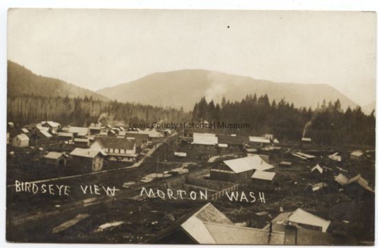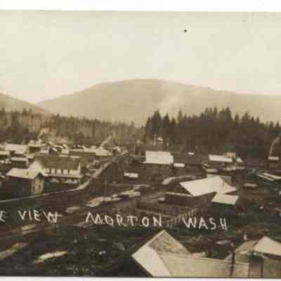 Black & White postcard - Morton,WA. Birds-eye view of town. Resident Andrew Peterson received this card from Morton, WA, Nov.1912Lexicon