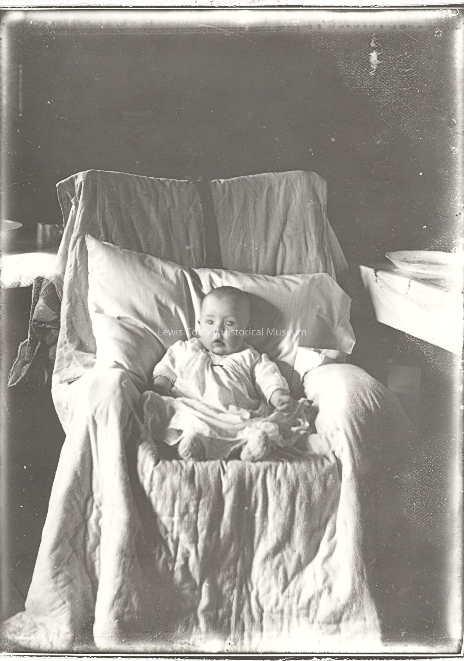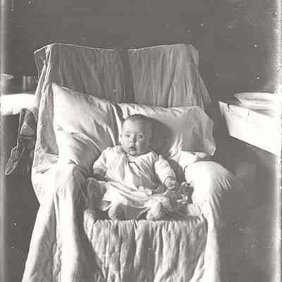 Evelyn C. Chapman, born in 1915, age 6 mos. Baby propped up by a pillow in a chair.Collection
