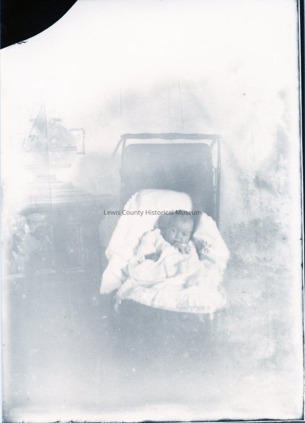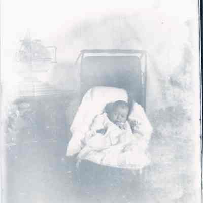 Evelyn Chapman sitting in a baby carraige, inside a house, very faint background.Collection