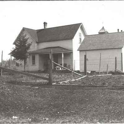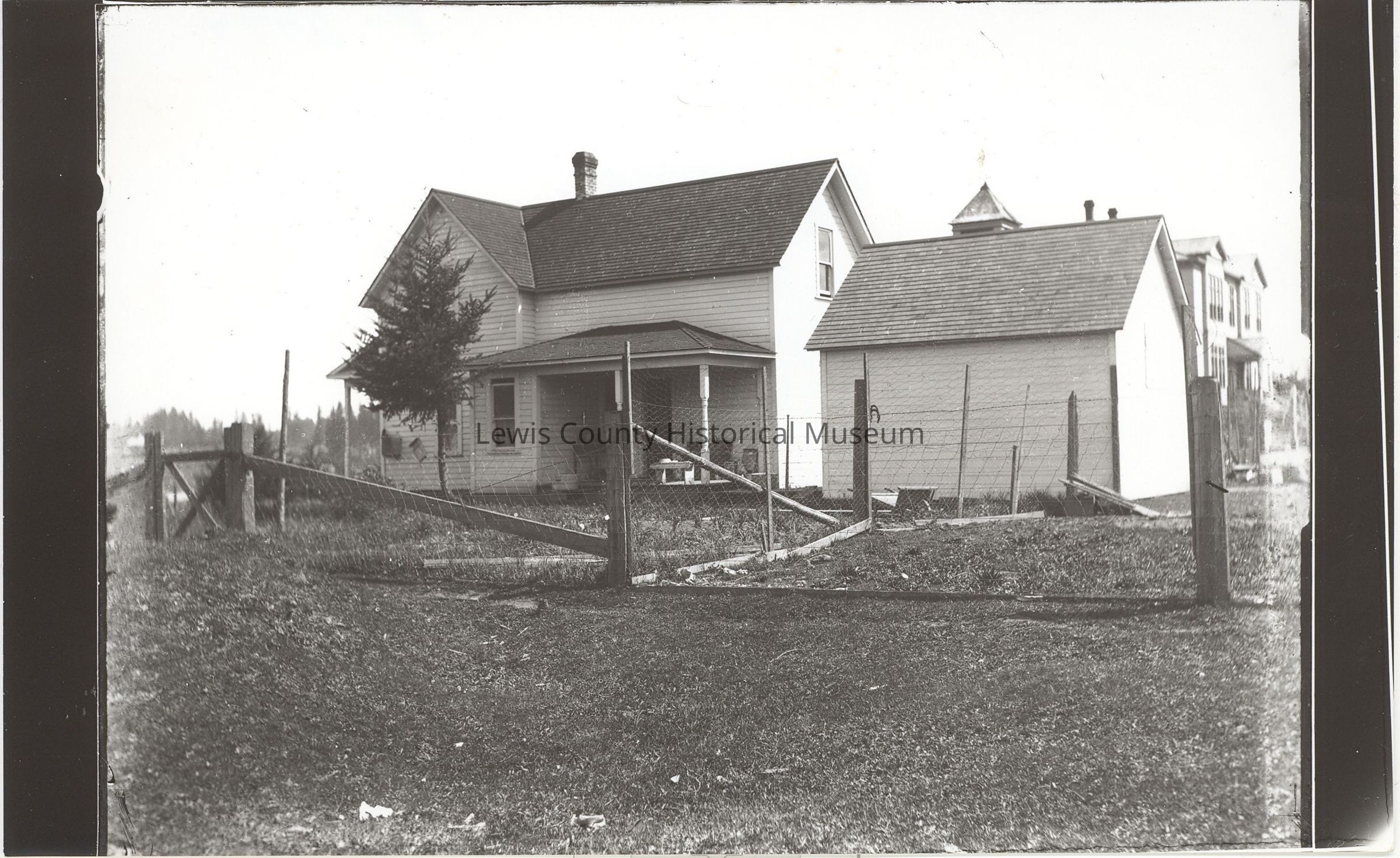 Winlock, WA photo of Mr.& Mrs. Erik Johnson's frame house and small out buildings, grass yard, wire fence, numerous articles on the porch, school house at the back of the house which burned down in 1922.Made/Created