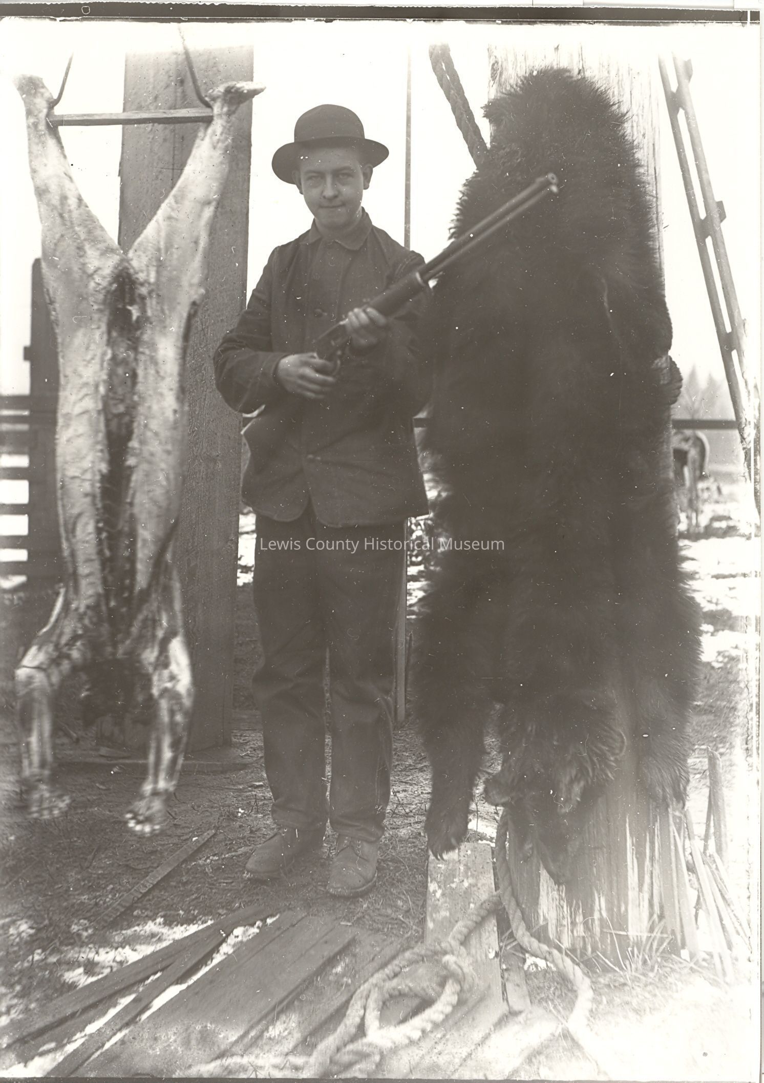 Photo of Riley Large holding a gun with a bear carcas and skin hanging. Snow on ground.Made/Created