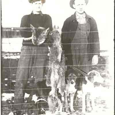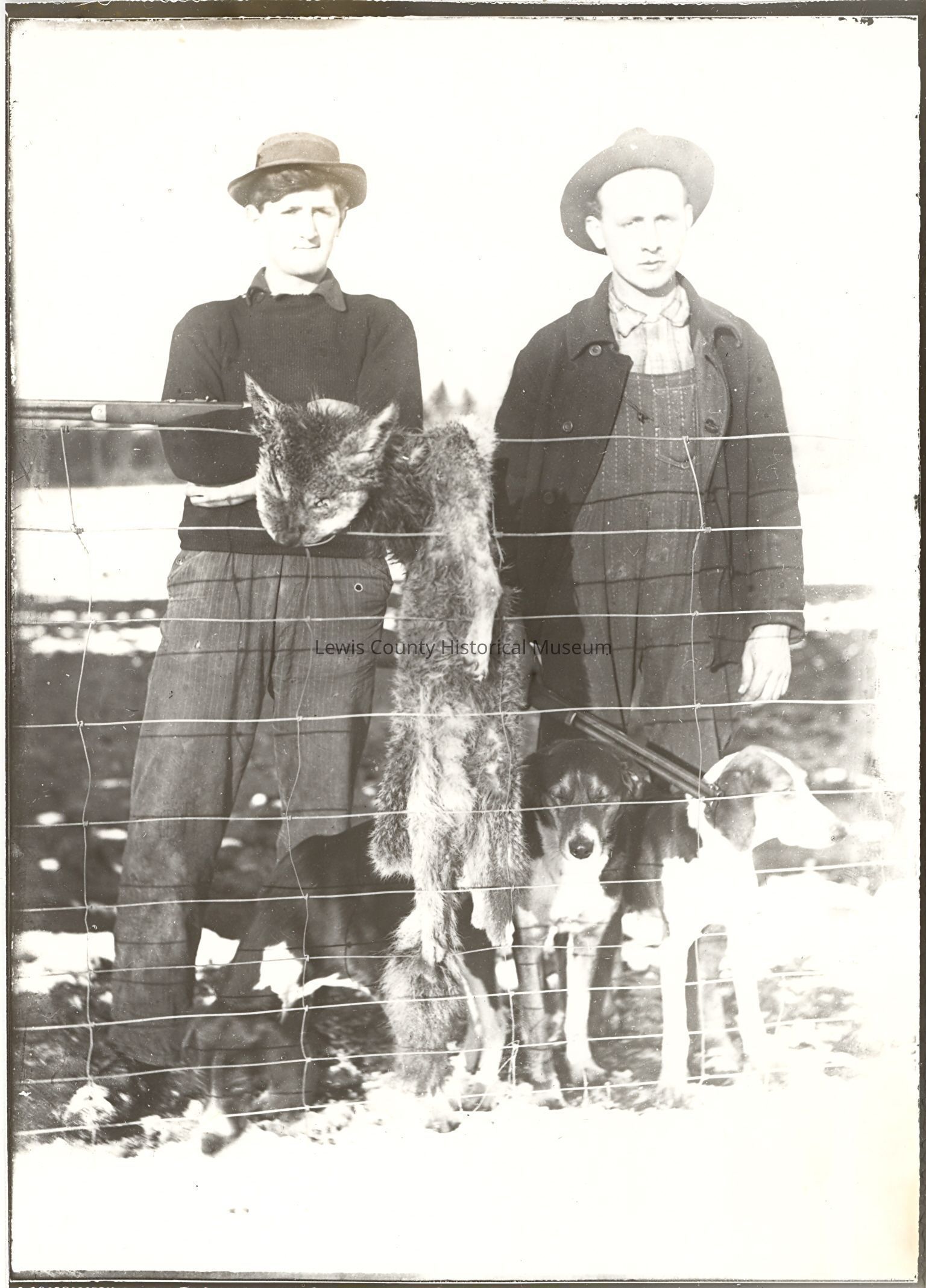 Photo L to R: cousin Ralph Champ, dead coyote, Joe Large with 3 hunting dogs, snow on the ground.Made/Created