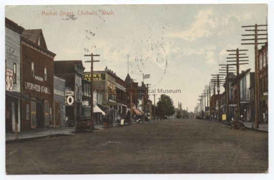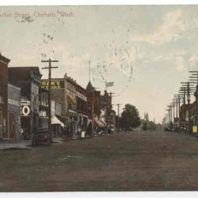Color postcard - Market Street, Chehalis, WA, looking south. At end of first block on left is Gem Drug Store with cupola, on right across from it is the Coffman Dobson Bank, with cupola, on corners of Boisfort and Market. On left foreground is Vaughn Livery Stable, Chehalis Hotel, a bicycle shop, Nathan's Dry Goods. Across the street, left side is the Washington Hotel and a bakery. Postmarked at Chehalis, WA, Dec. 24, 1907, addressed to Portland.Acquisition