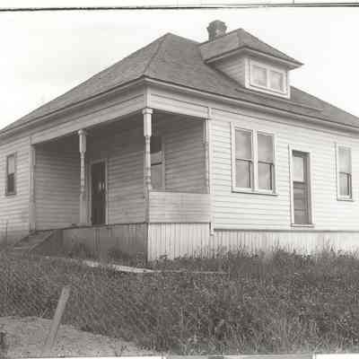 Photo of a frame house with shingle roof, brick chimney, wire fence and trees in backgroundMade/Created
