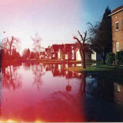 Corner of Oak and Center Streets, Centralia, WA, looking south from 400 block during Feb. 1996 flood.Collection